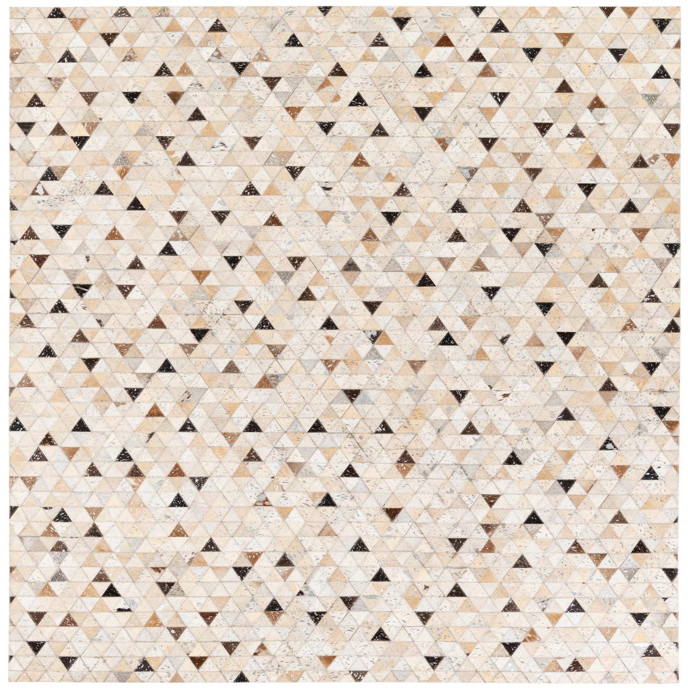 A 5x8 rectangular Cowhide Stocks rug featuring a modern geometric pattern of multi-colored cowhide triangles in shades of beige, brown, and black.