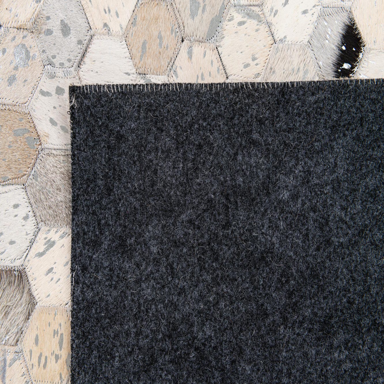A 5x8 rectangular Cowhide Stocks rug featuring a modern multi-colored hexagonal pattern in neutral tones.