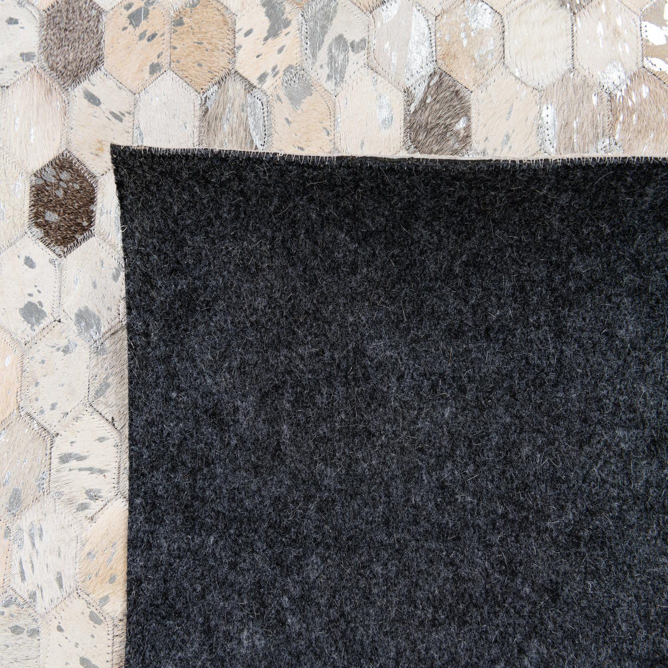 A rectangular 5x8 modern cowhide rug featuring a mosaic of multi-colored hexagonal patches in shades of cream, beige, brown, and grey.