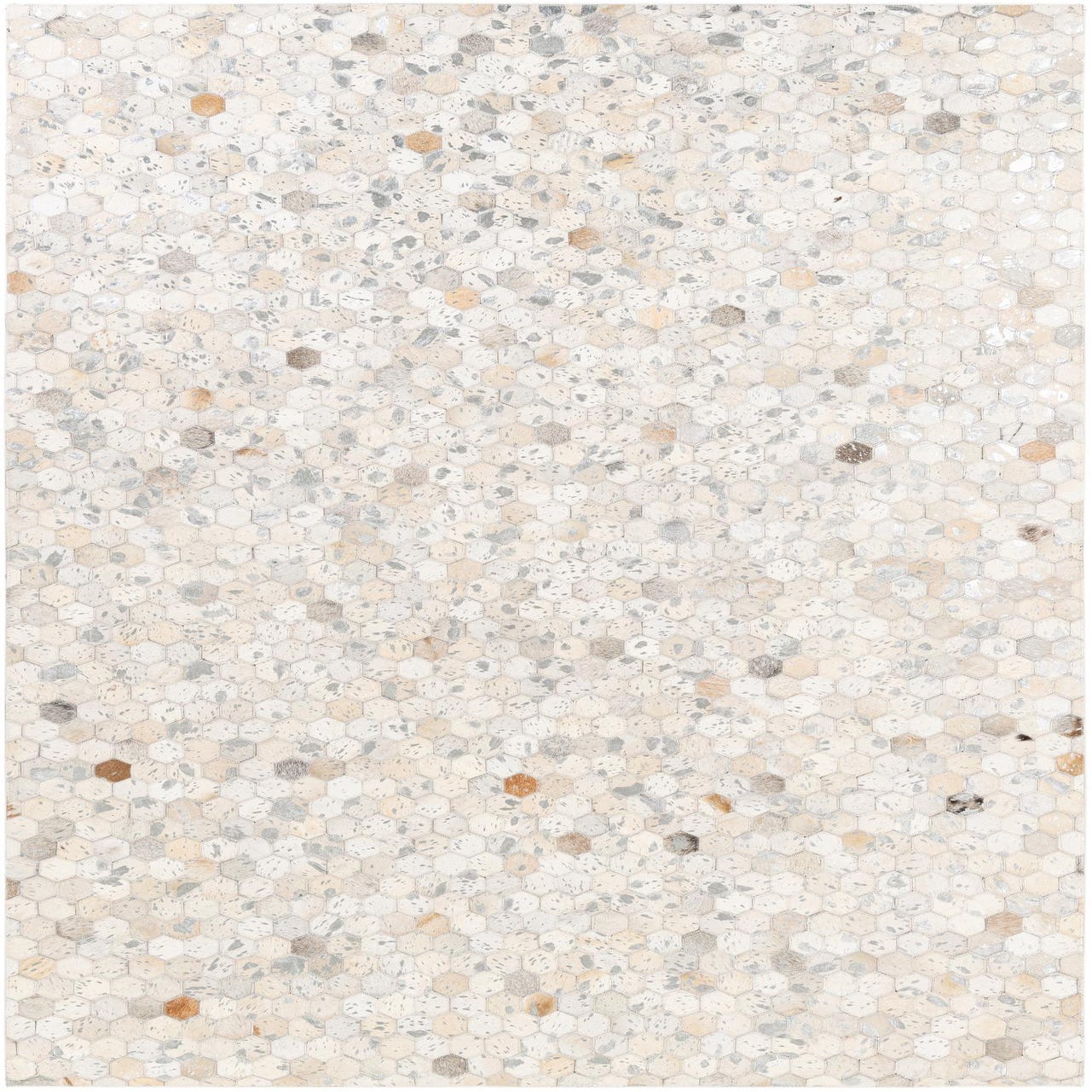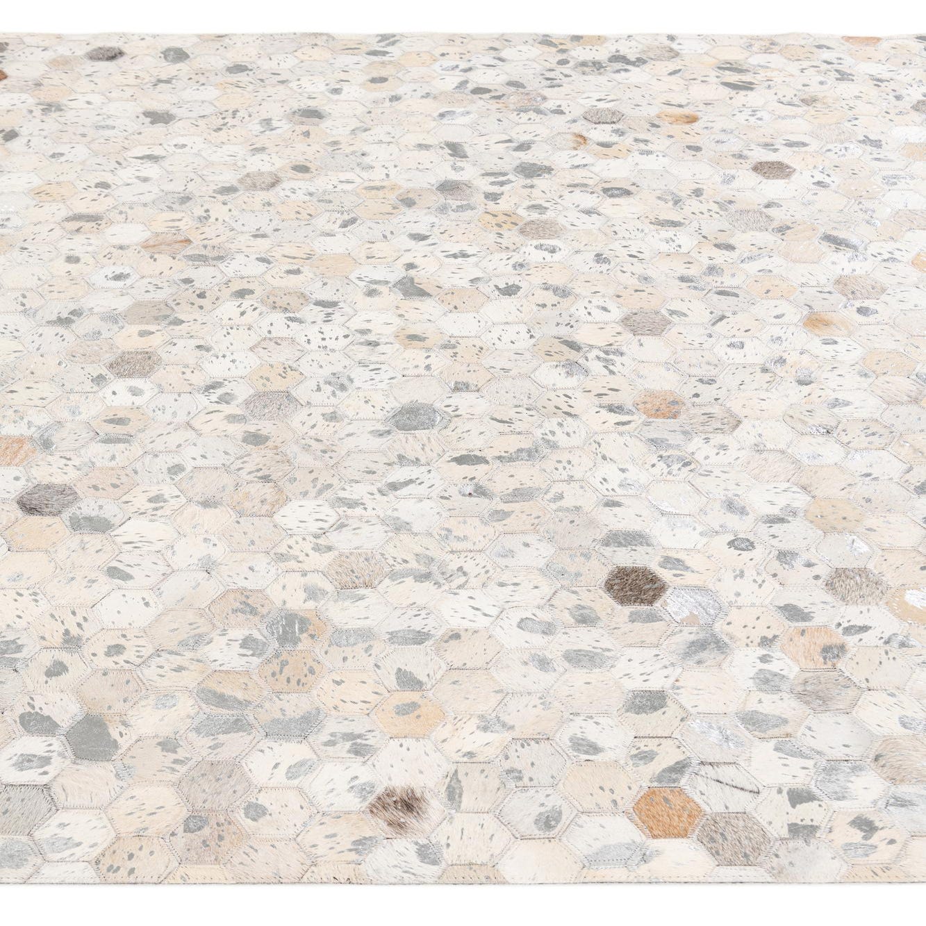 A 5x8 rectangular patchwork cowhide rug with a geometric pattern in multi-colored natural tones, ideal for a living room.