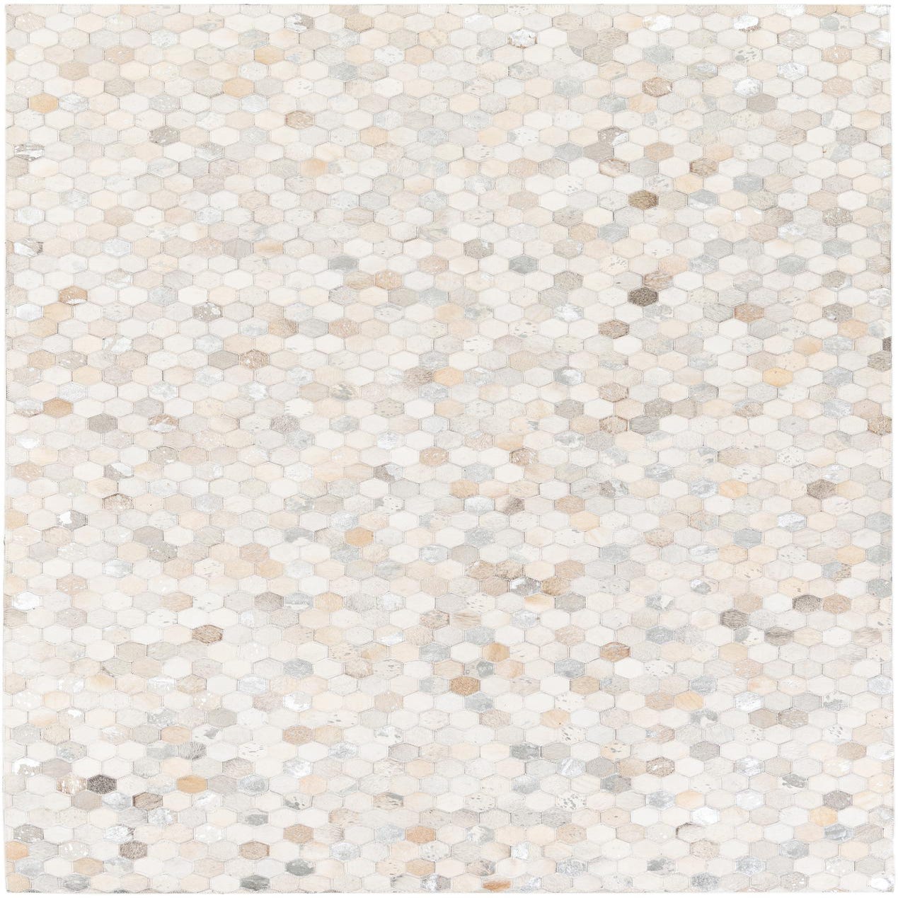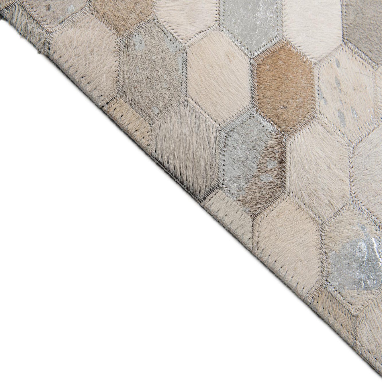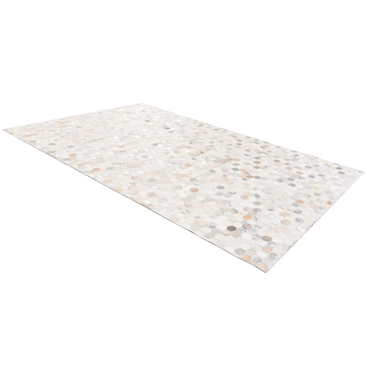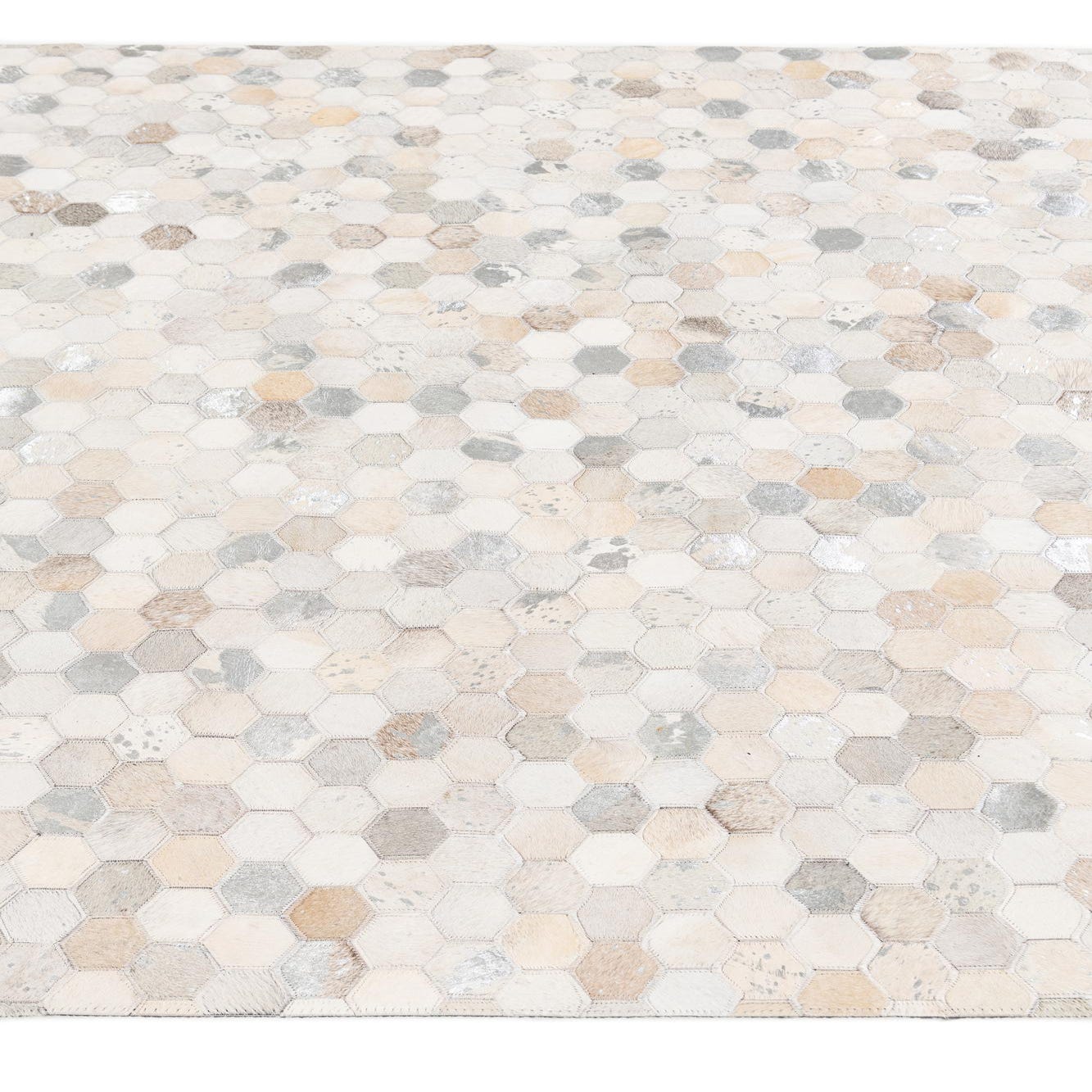 A 5x8 rectangular Cowhide Stocks rug featuring a modern mosaic pattern of multi-colored hexagonal cowhide patches in neutral tones.