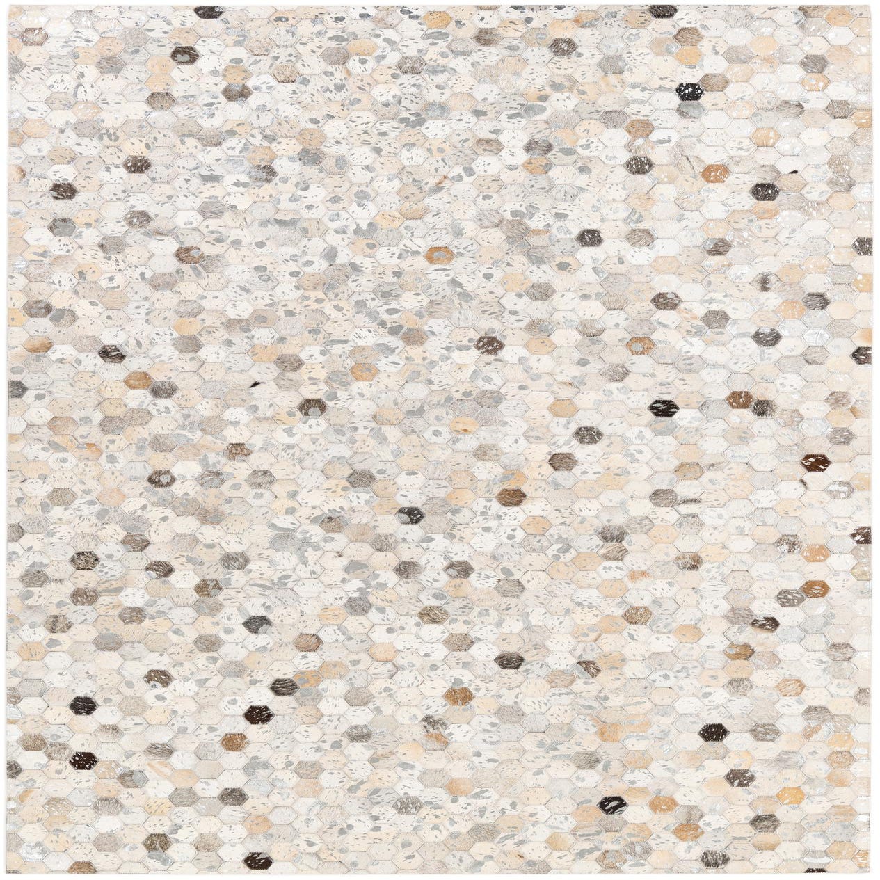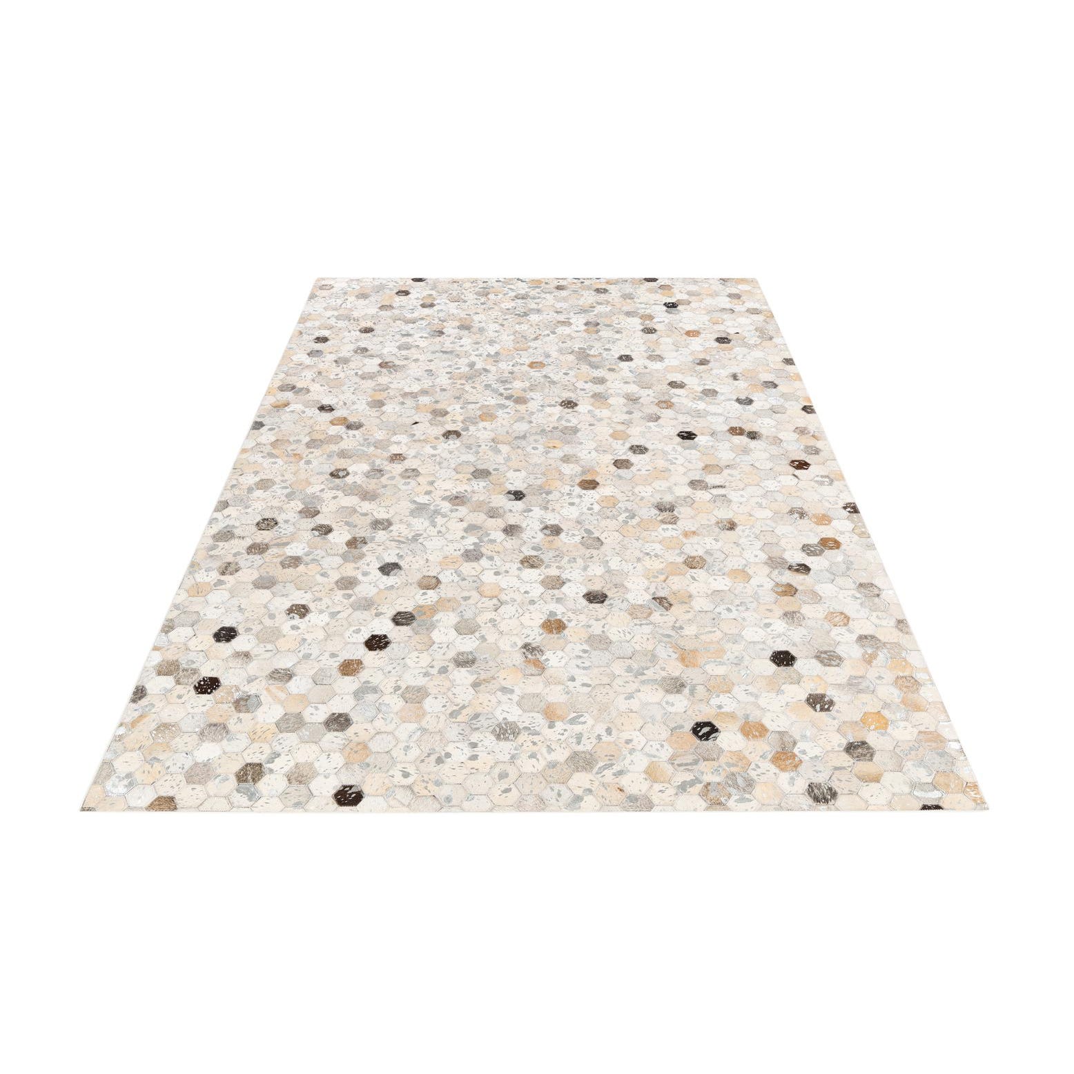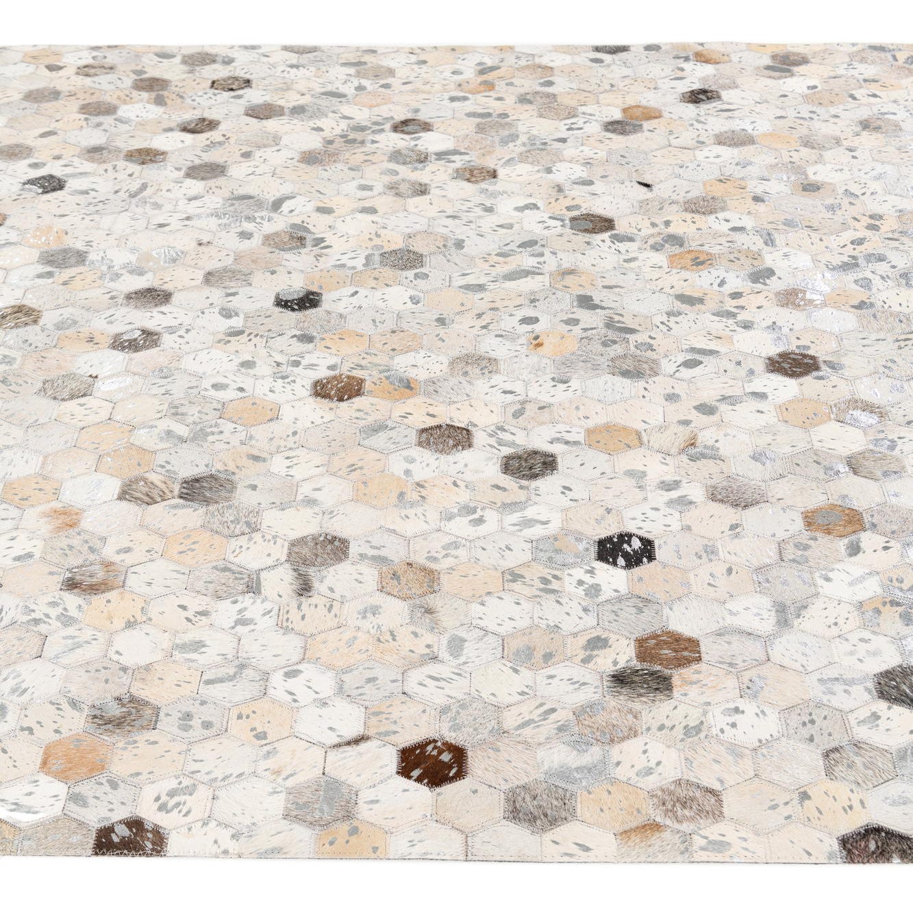 A 5x8 rectangular Cowhide Stocks rug featuring a multi-colored patchwork geometric pattern of hexagonal cowhide pieces in various natural tones.