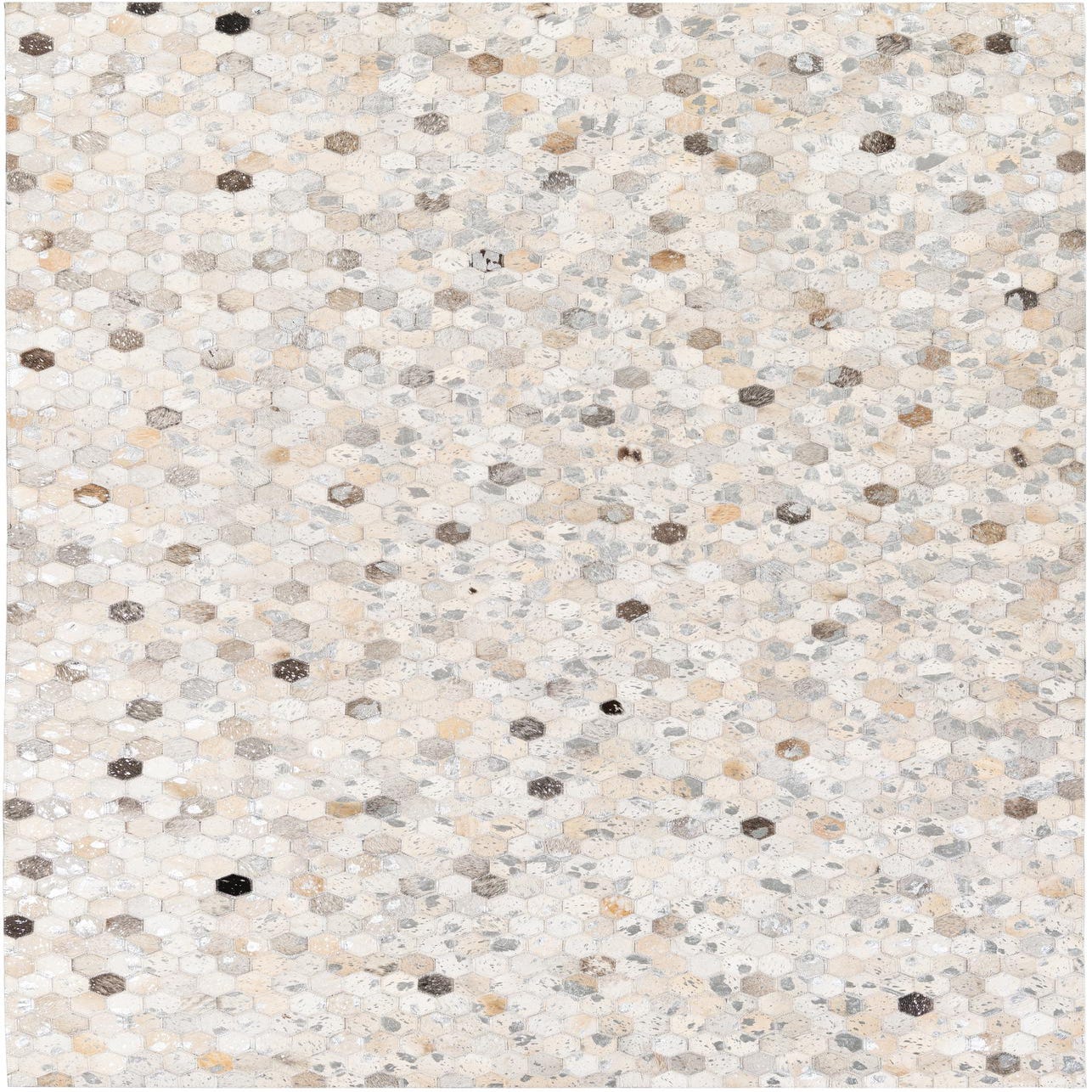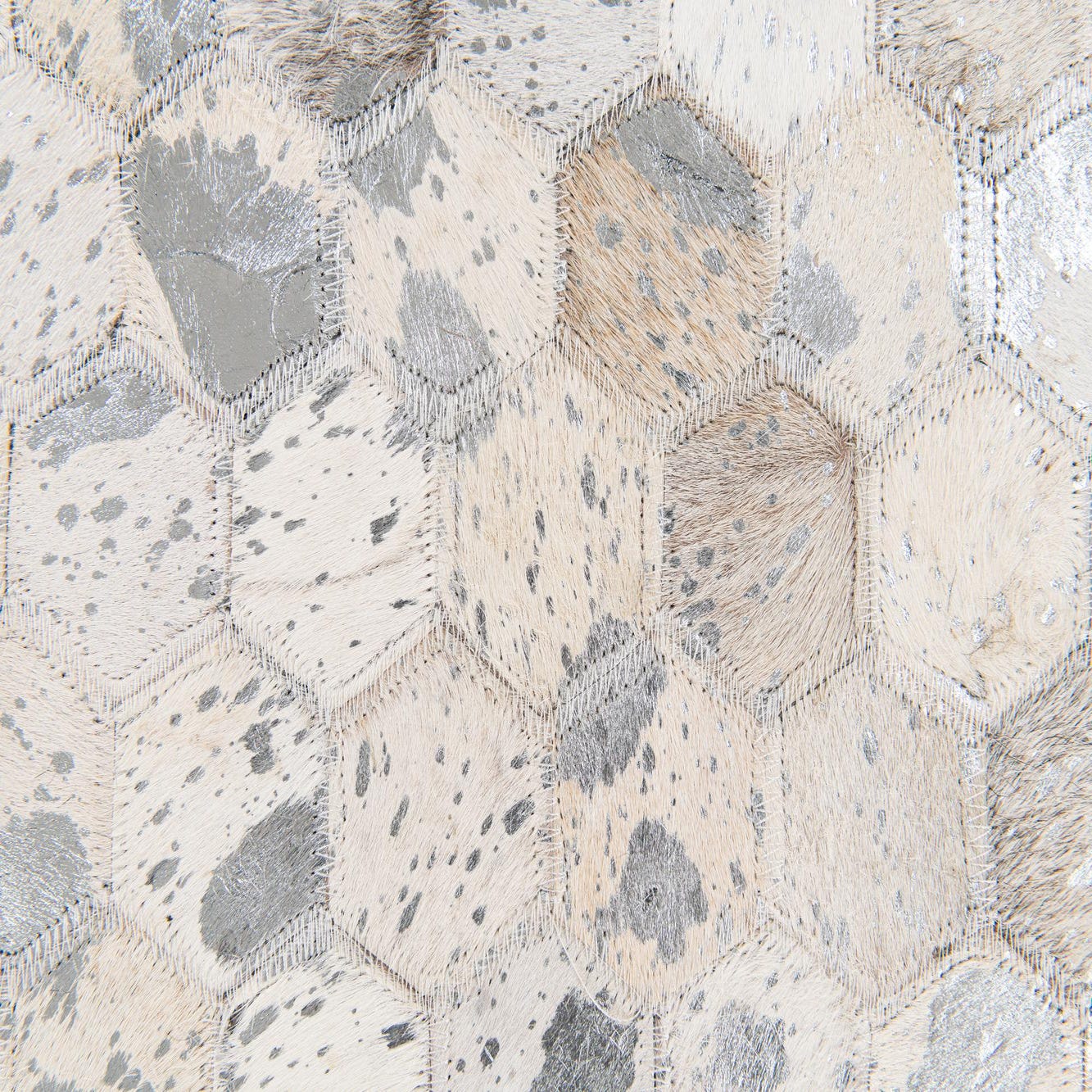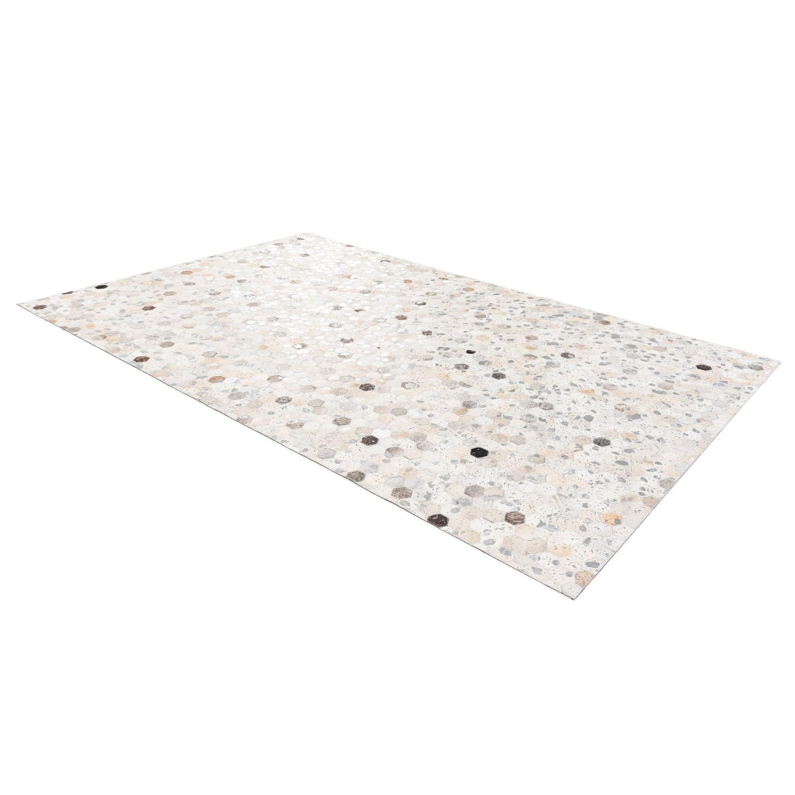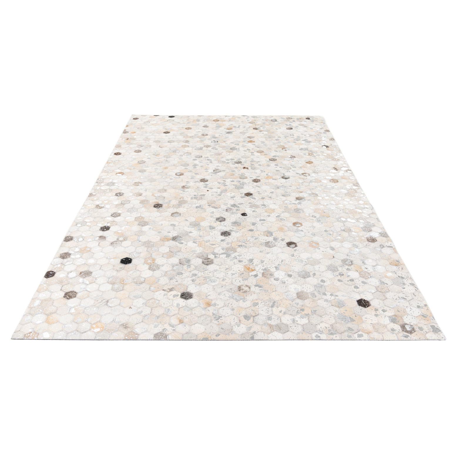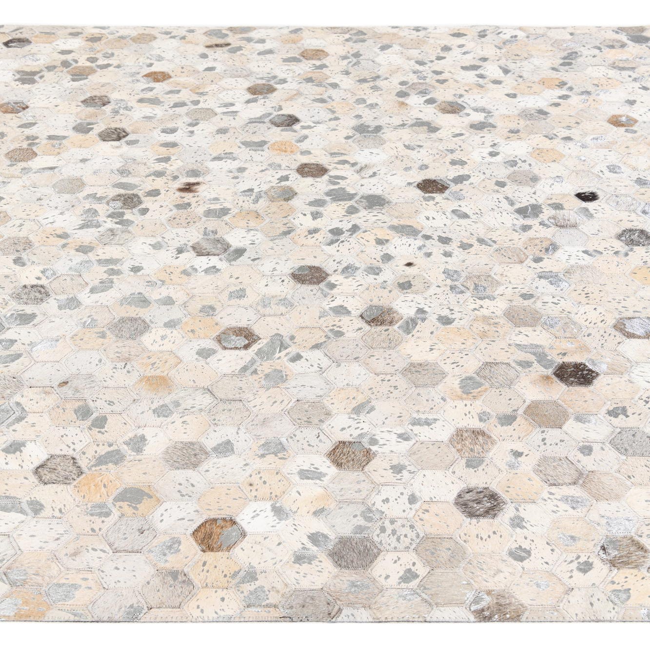 A 5x8 rectangular Cowhide Stocks rug featuring a modern multi-colored hexagonal pattern in neutral tones, ideal for a living room or bedroom.