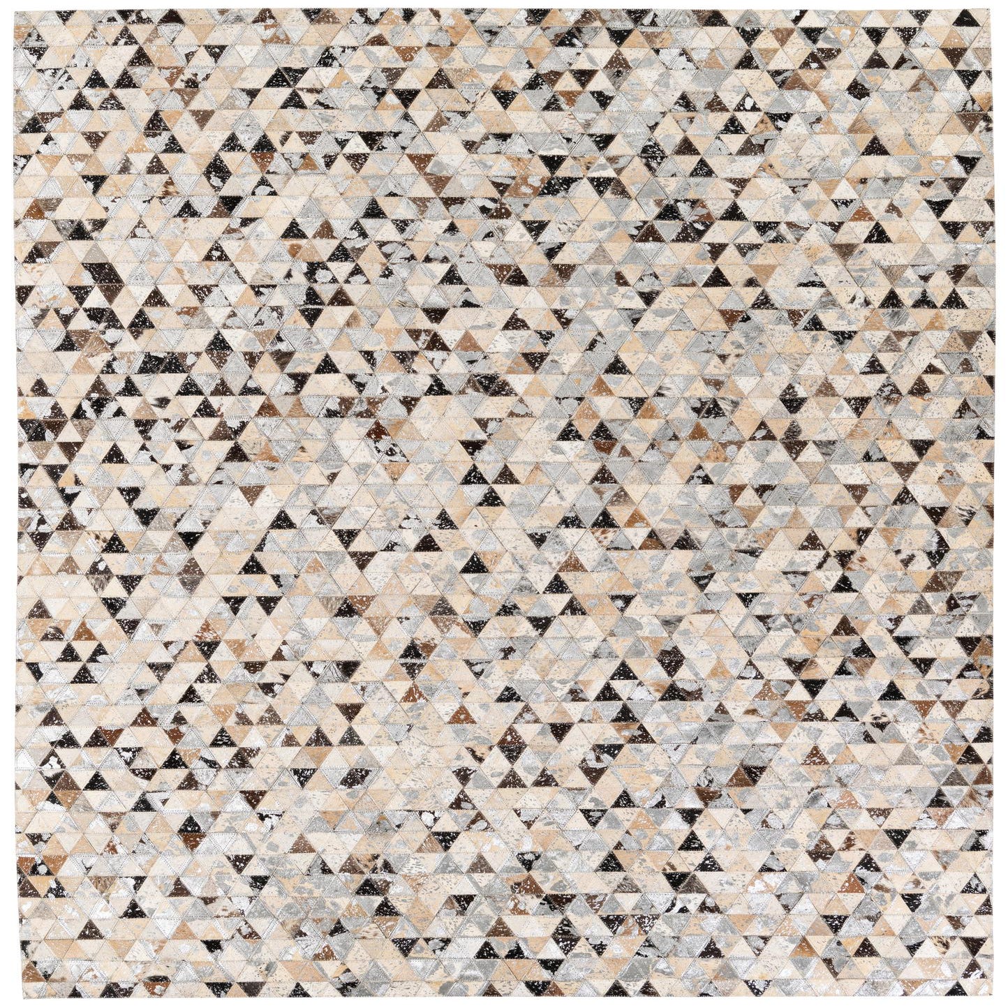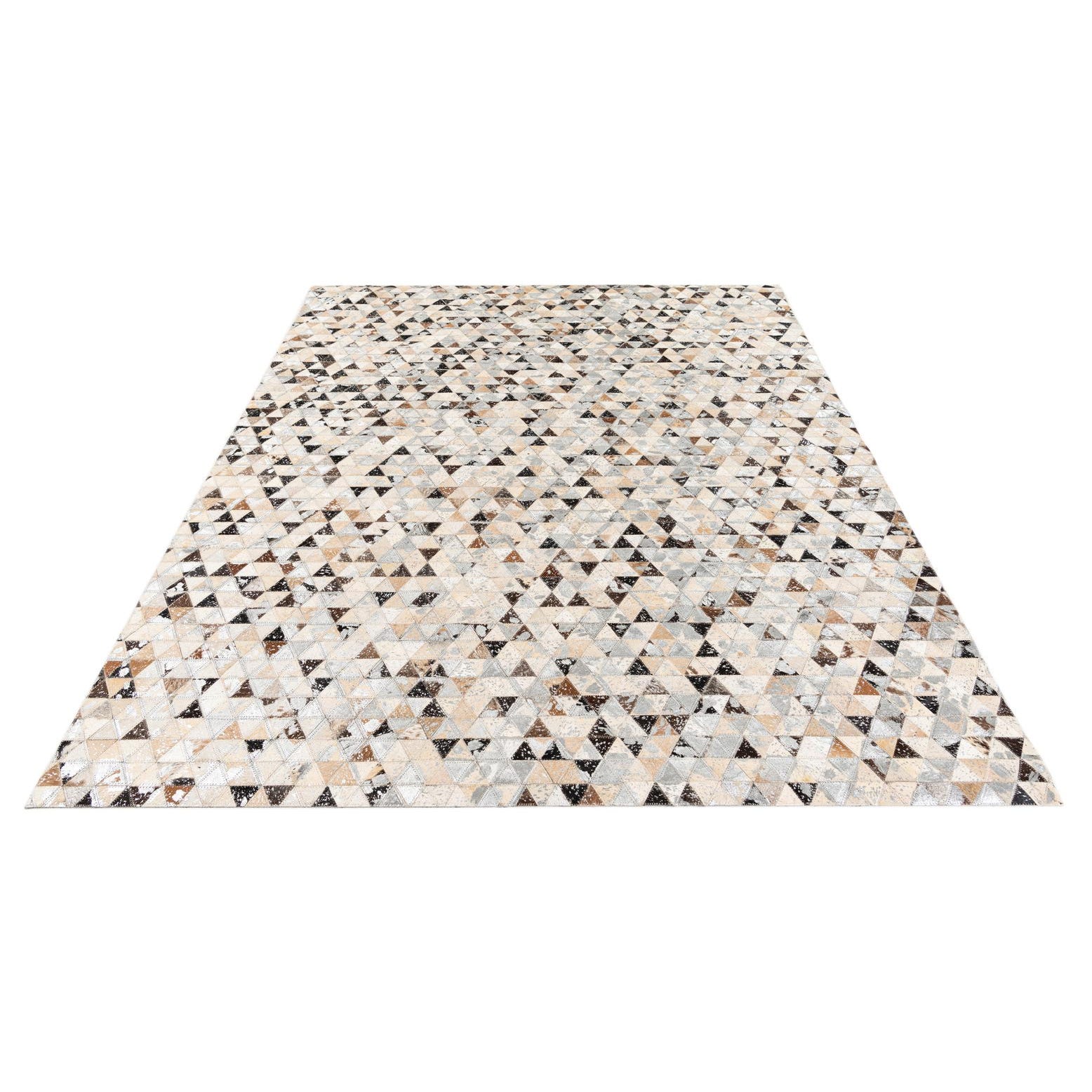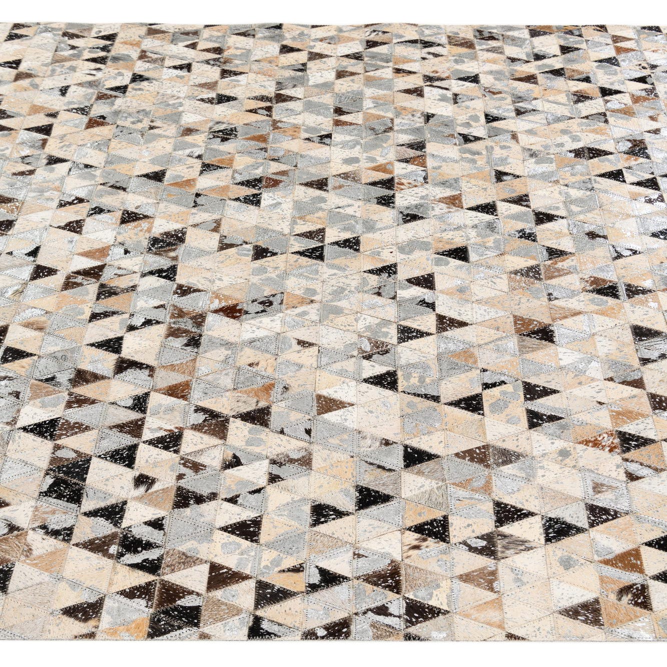 A 5x8 rectangular Cowhide Stocks rug featuring a modern geometric pattern of multi-colored cowhide and leather triangles in shades of beige, brown, black, and grey.