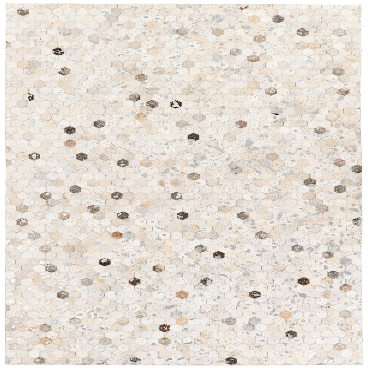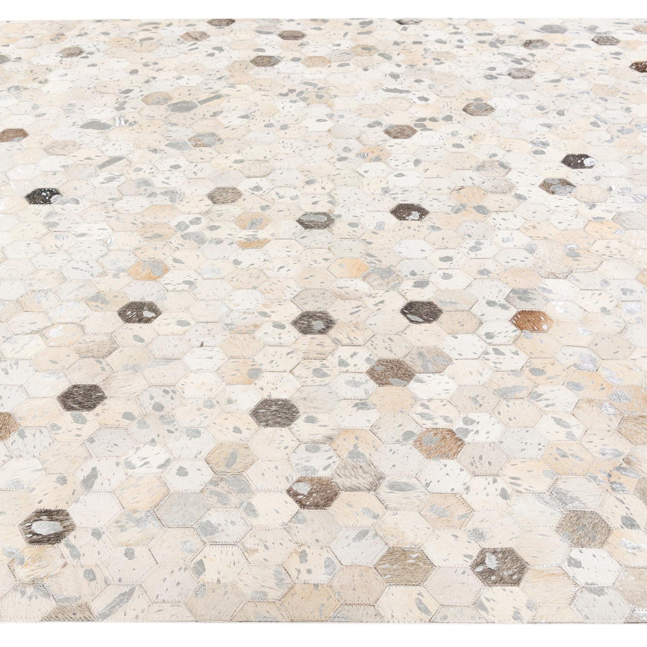 A 5x8 rectangular Cowhide Stocks rug featuring a modern multi-colored hexagonal pattern with varying shades of cream, beige, brown, and grey.