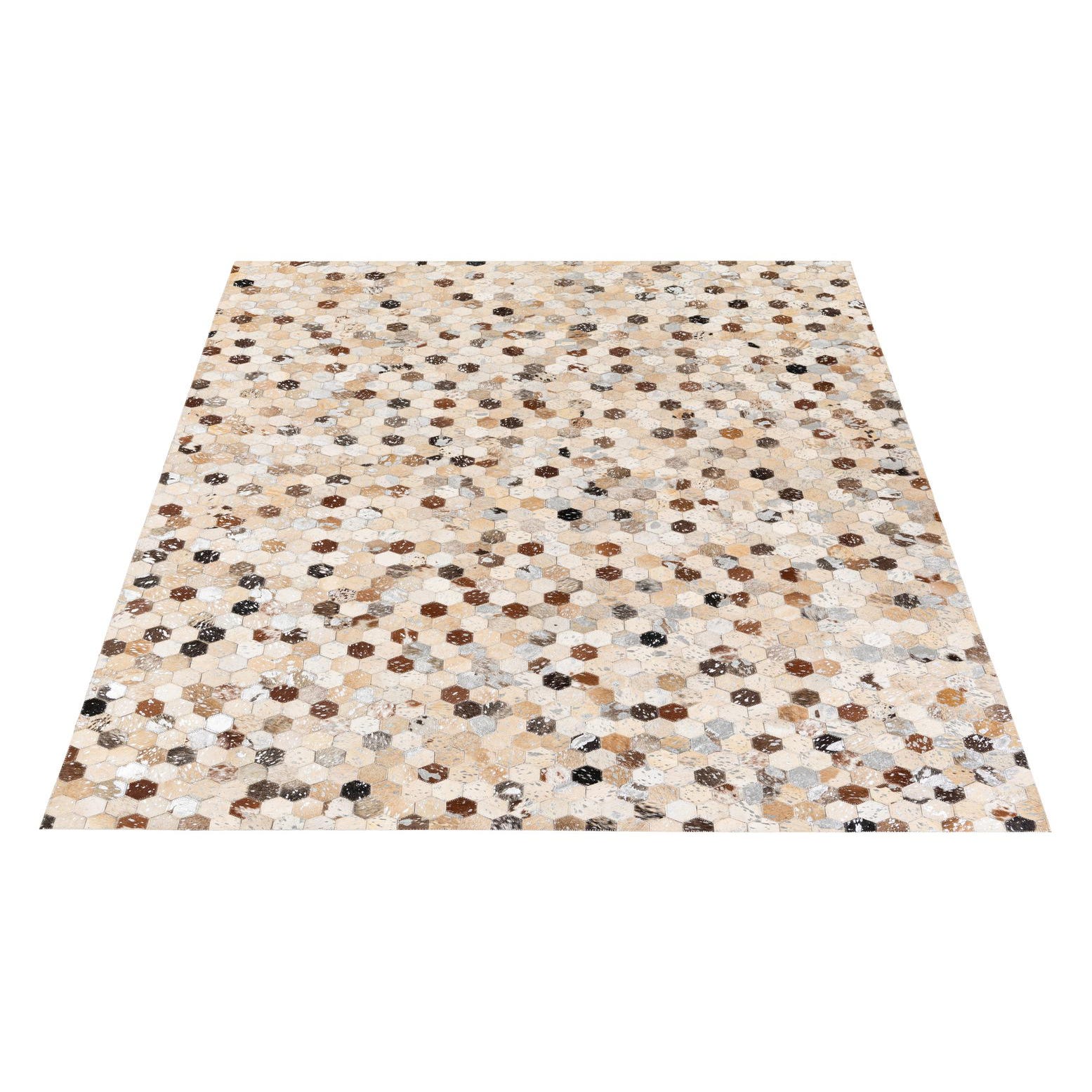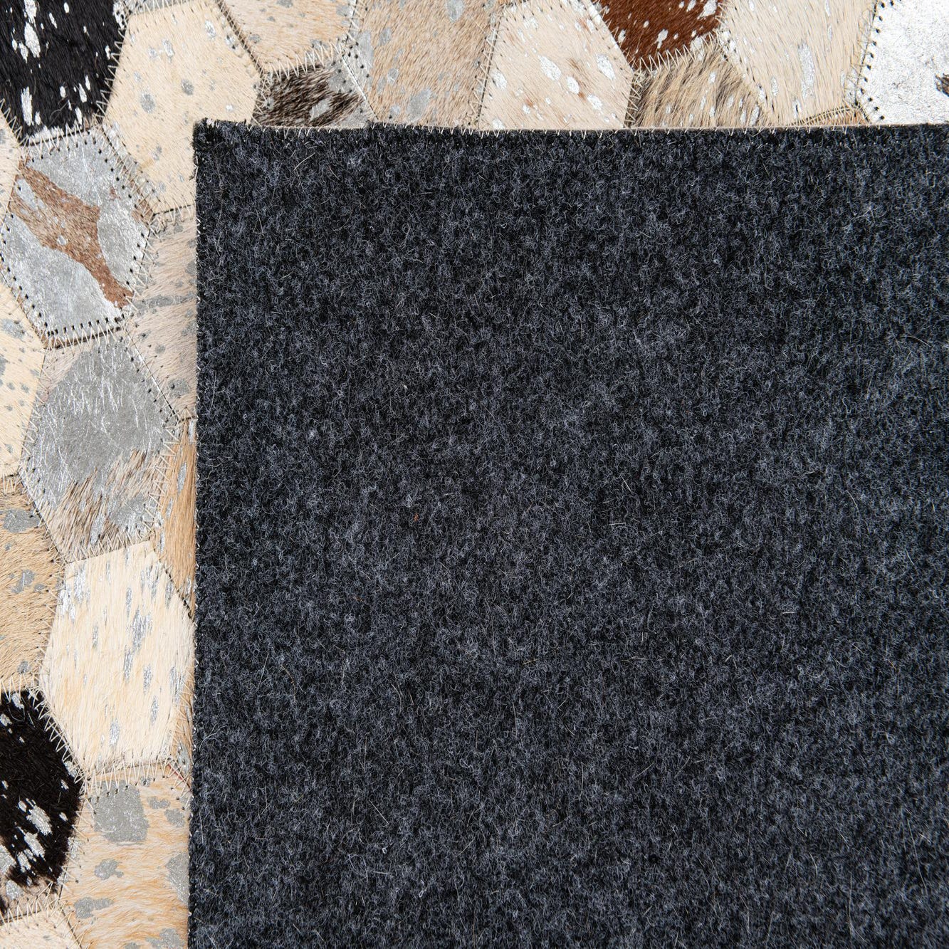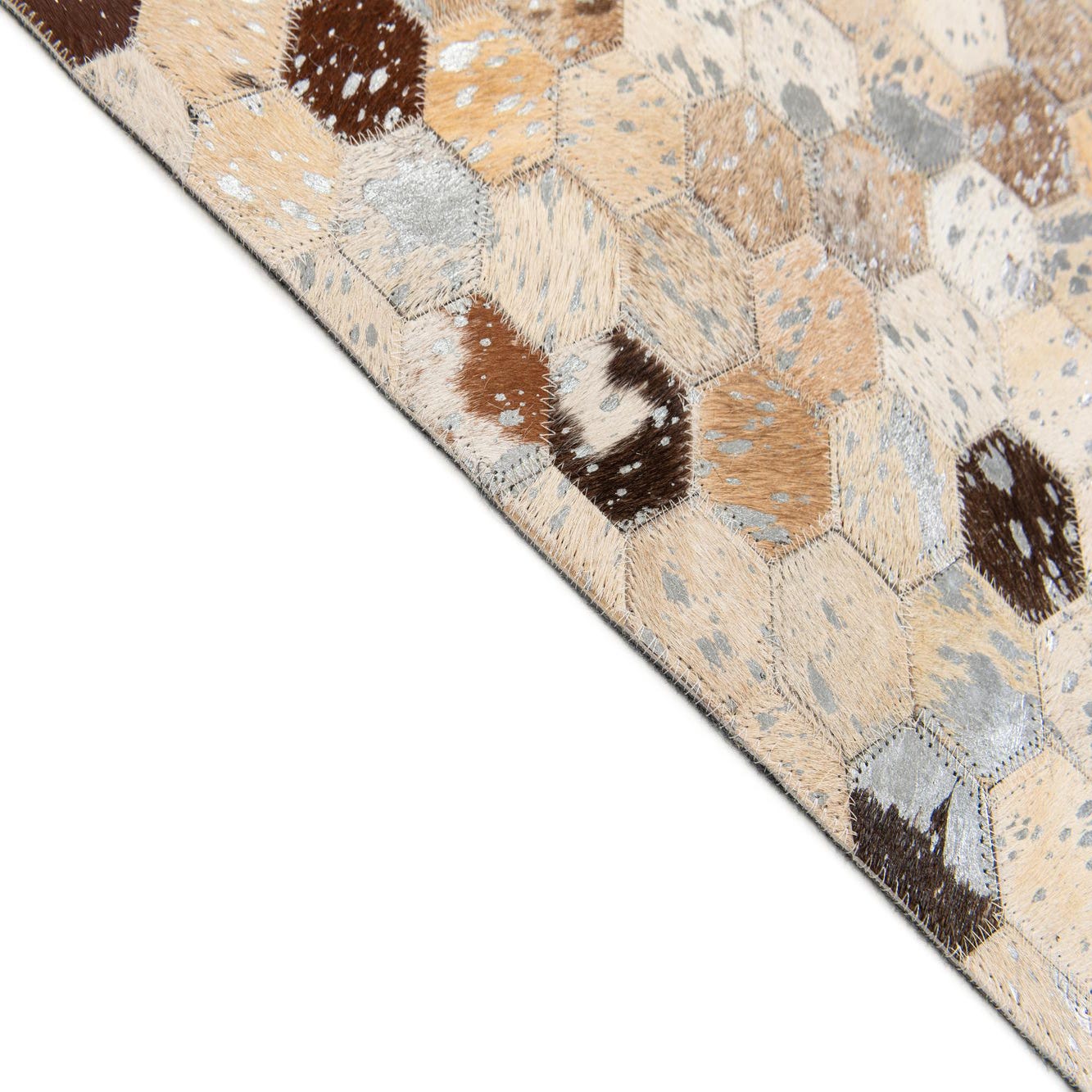 Handmade of cowhide and leather, this rug assembles small hexagonal patches into a tight honeycomb mosaic that reads both structured and organic. The hair-on-hide surface offers a low-profile, tactile texture with subtle variation where each patch is stitched into place, creating gentle relief across the field. The neutral, multi background is punctuated by beige, ivory, tan, light brown, brown and black tones that carry the natural markings of the hides, giving the pattern depth and visual movement without heavy contrast.