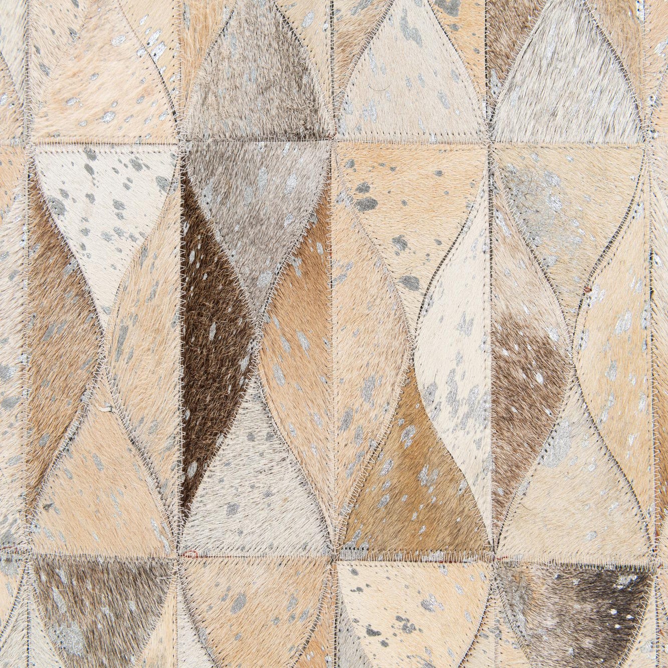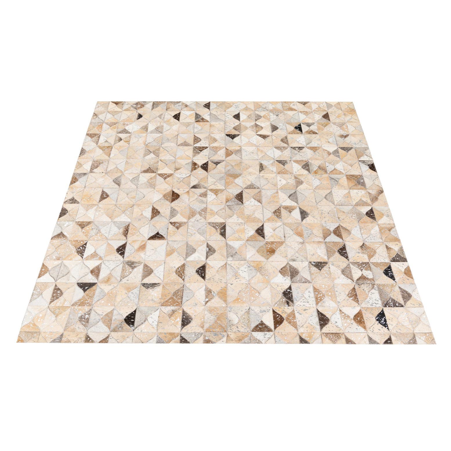 A rectangular 5x8 modern cowhide rug with a multi-colored geometric pattern in shades of brown, beige, and white.