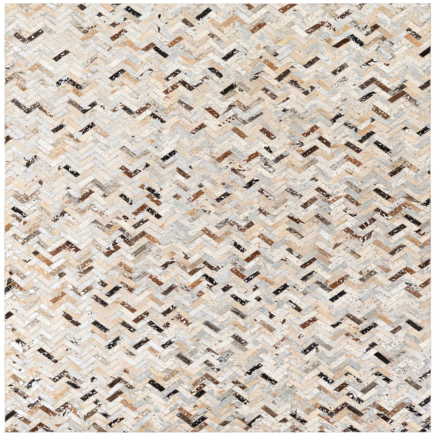 A rectangular 5x8 multi-colored cowhide rug with a modern chevron stripe pattern, ideal for a living room.