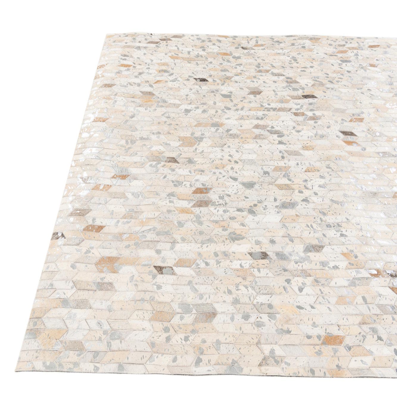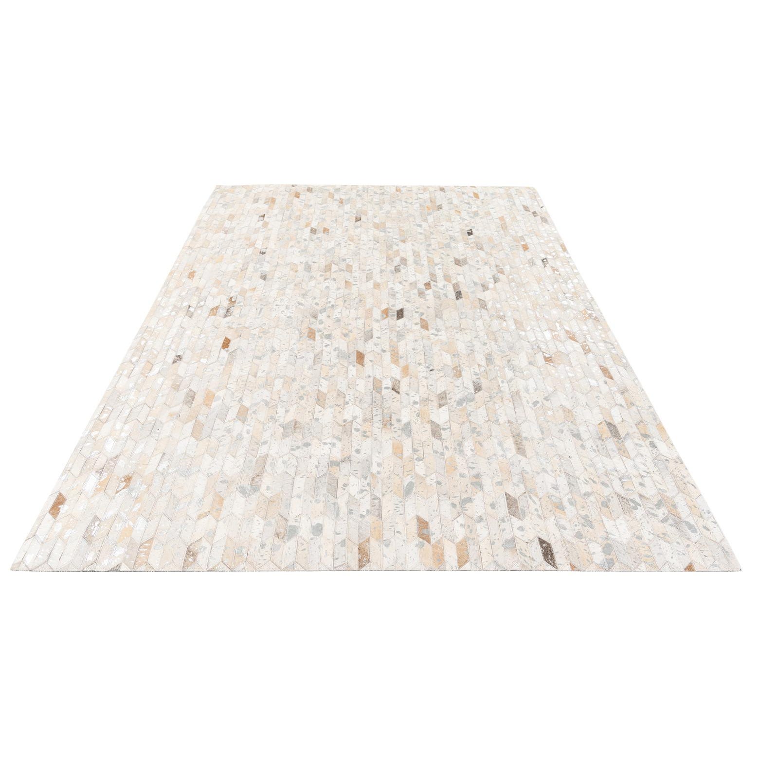 A rectangular 5x8 modern Cowhide Stocks rug featuring a multi-colored geometric pattern of light and dark brown, beige, and gray patches.
