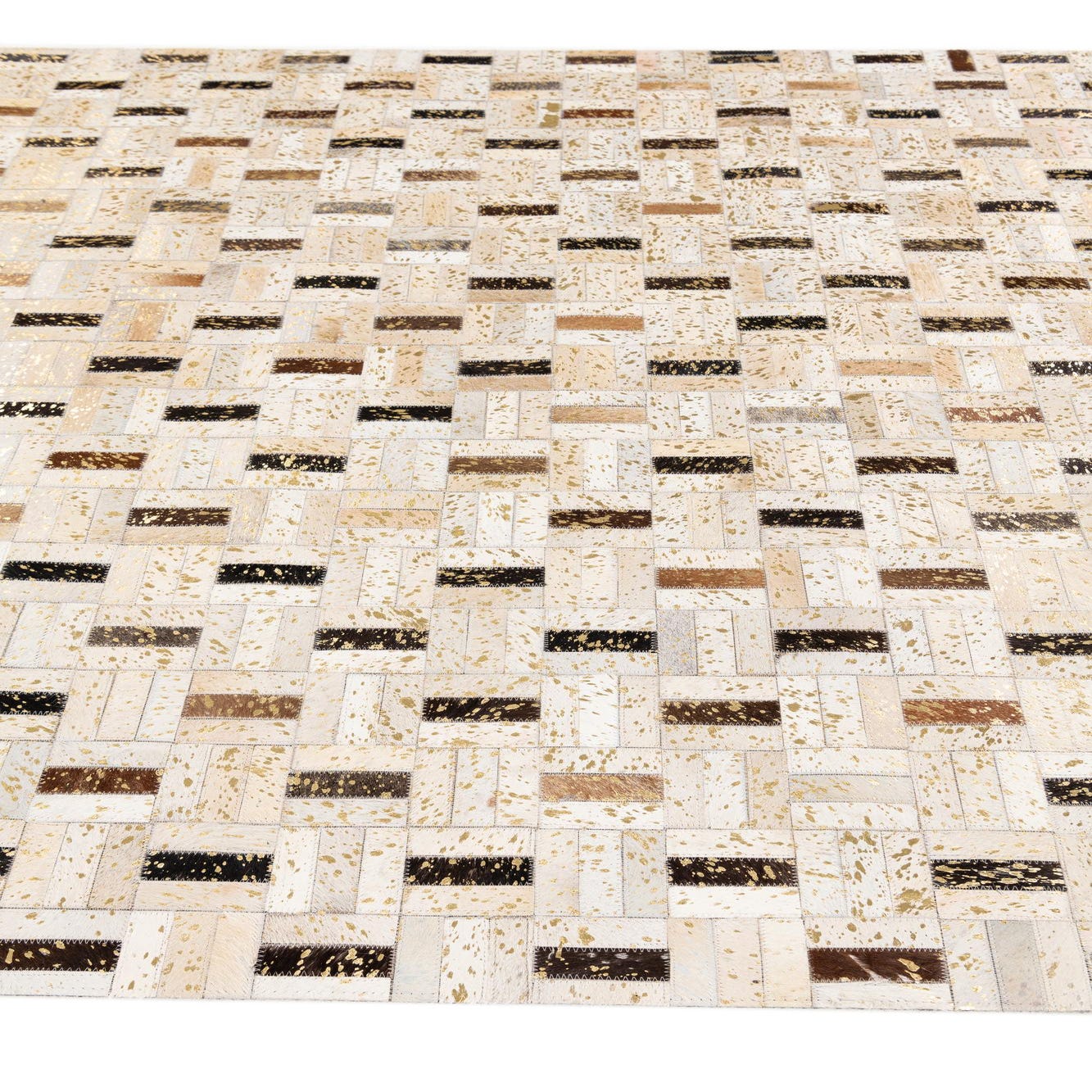 A rectangular 5x8 modern cowhide rug featuring a multi-colored patchwork pattern with natural light and dark brown tones.