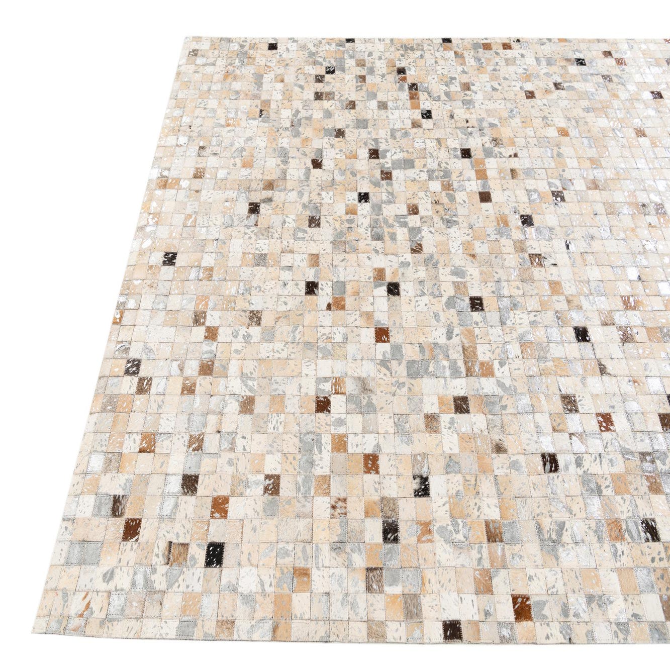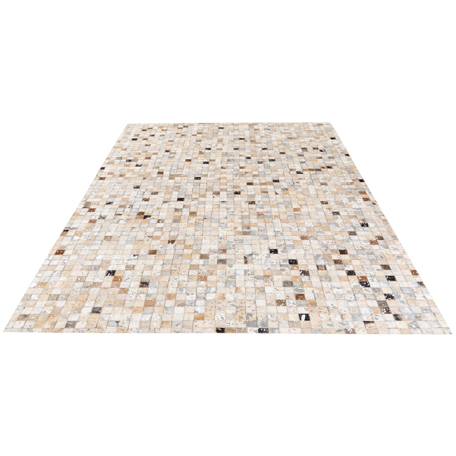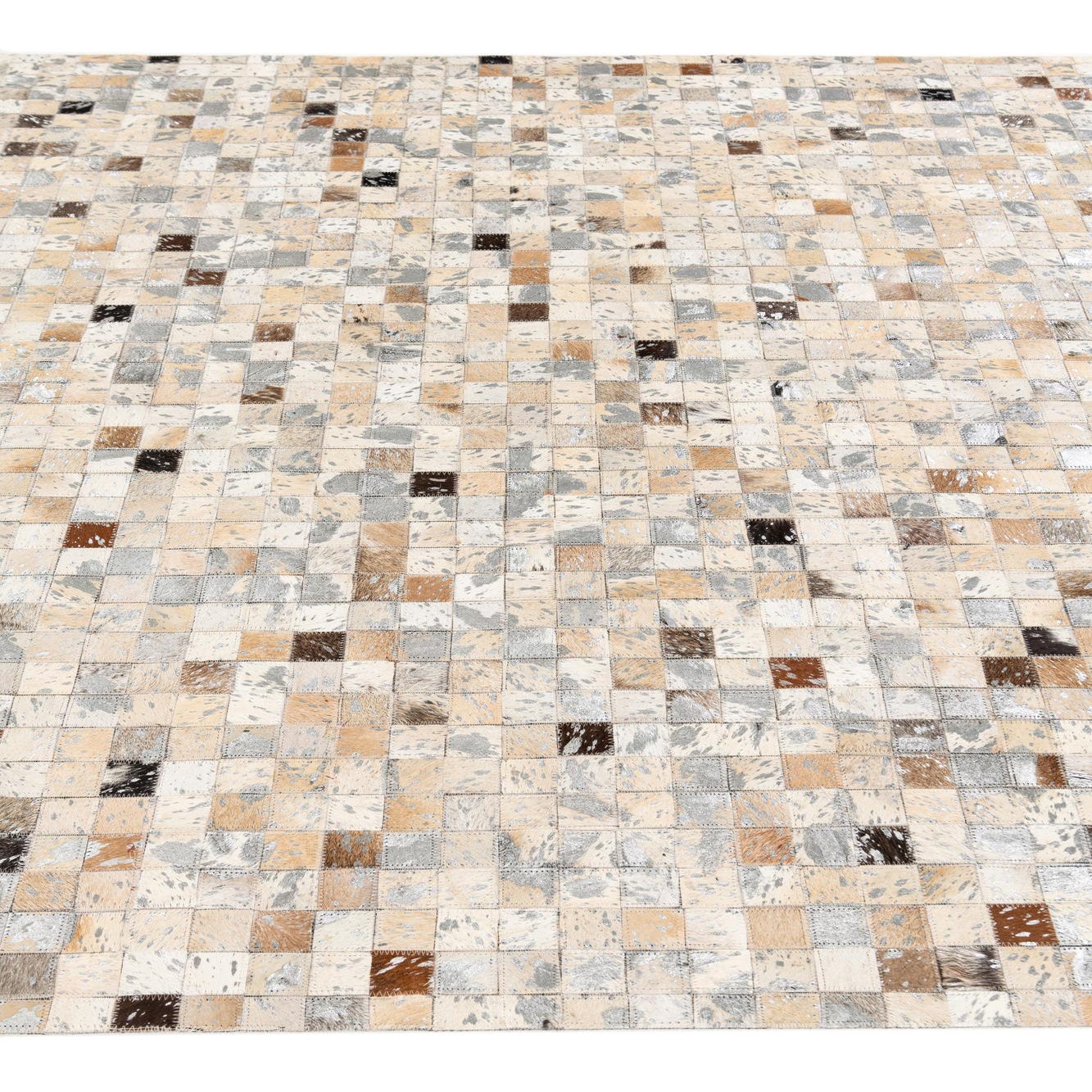 A 5x8 rectangular Cowhide Stocks rug featuring a modern patchwork of multi-colored cowhide squares in various natural tones.