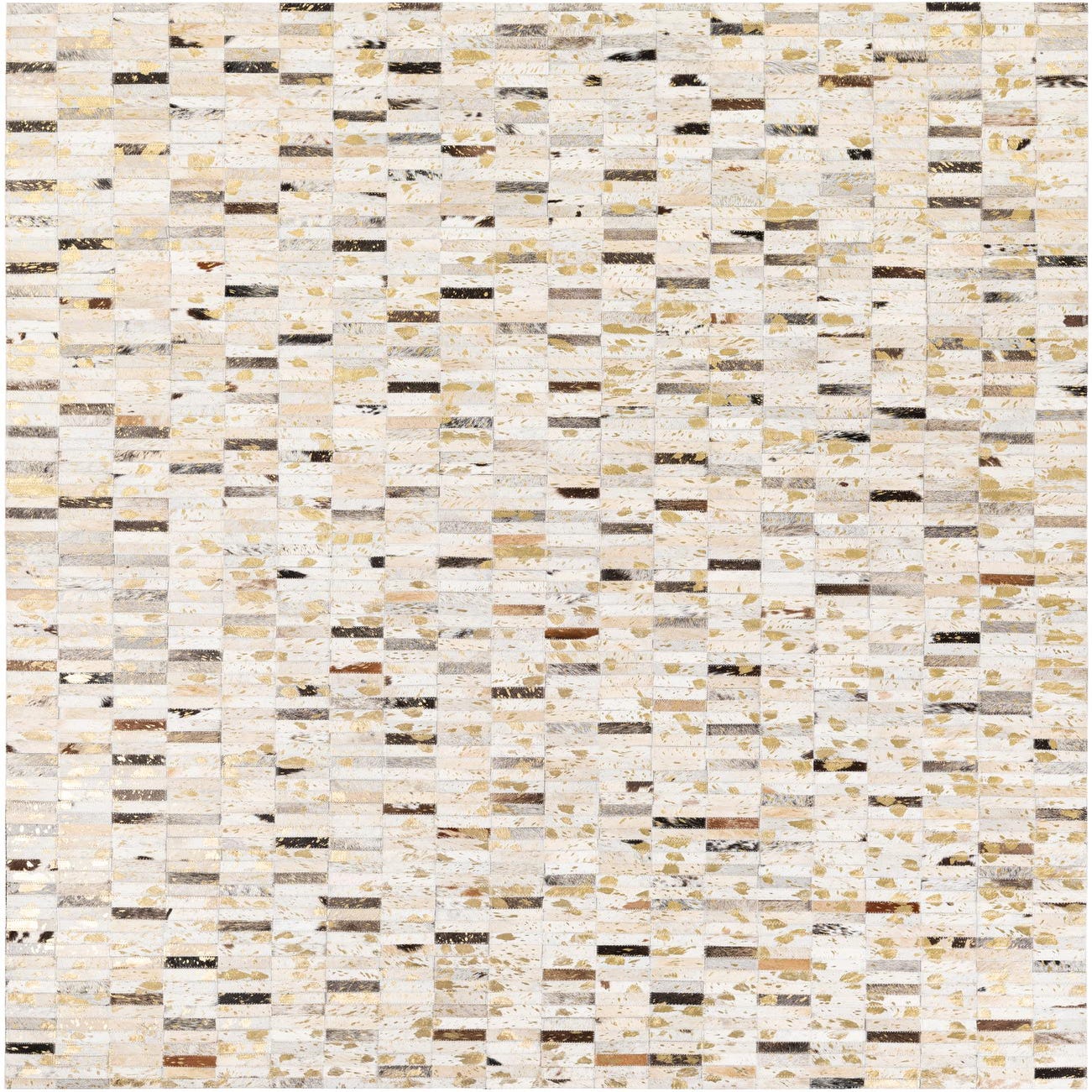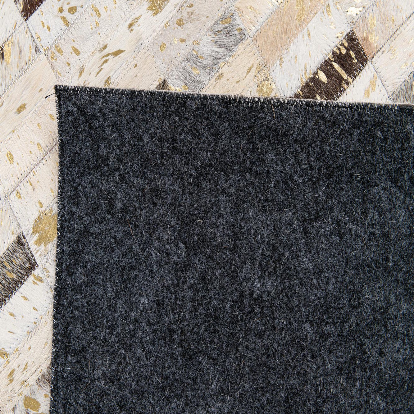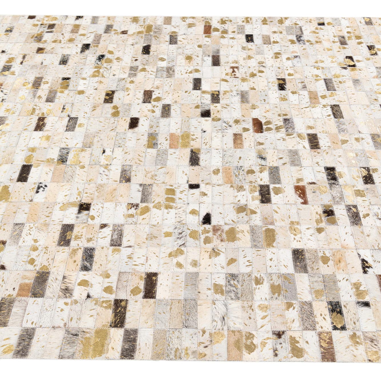 A rectangular 5x8 modern cowhide rug featuring a patchwork of multi-colored natural hide pieces with metallic gold accents.