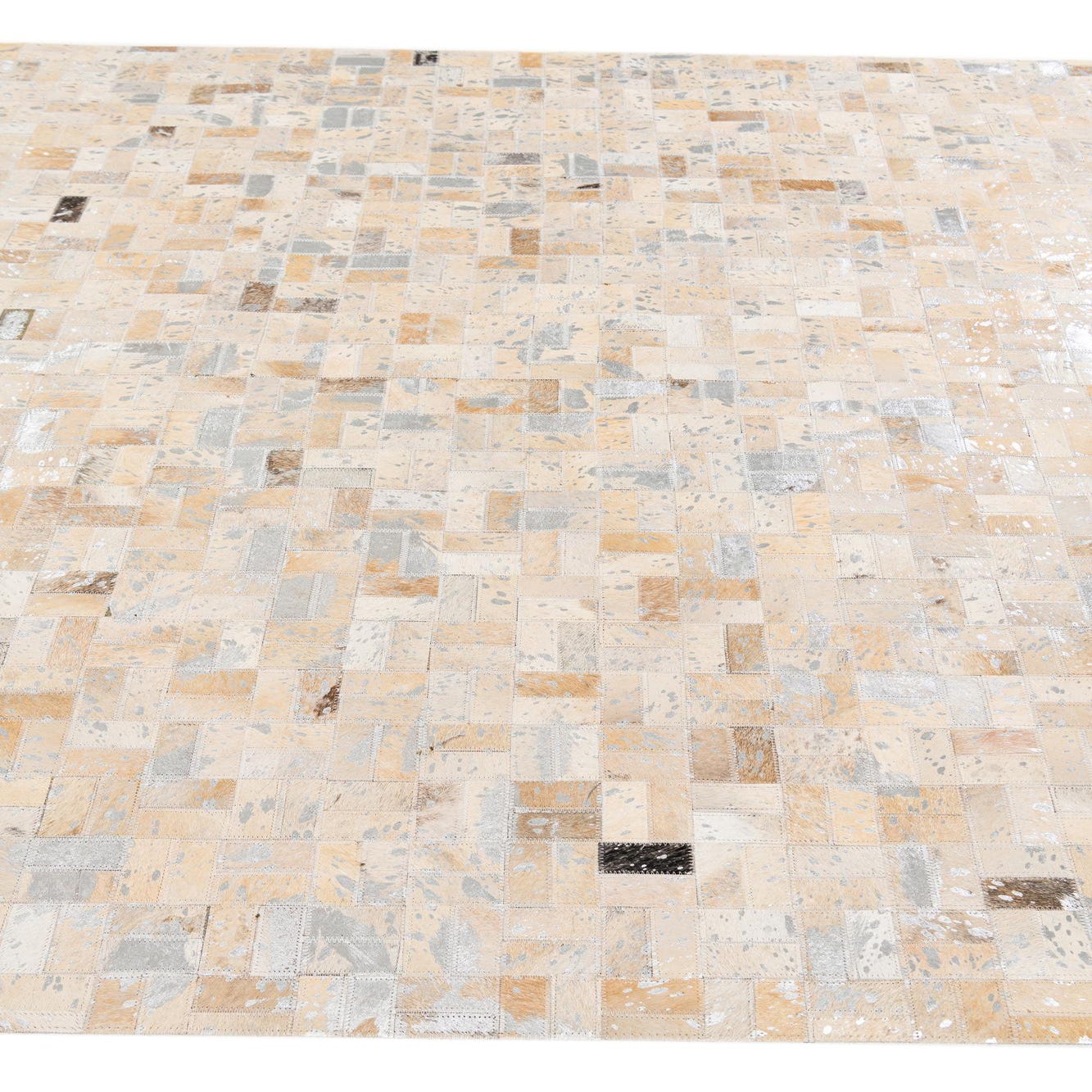 A rectangular 5x8 modern cowhide rug featuring a mosaic pattern of multi-colored natural leather squares.