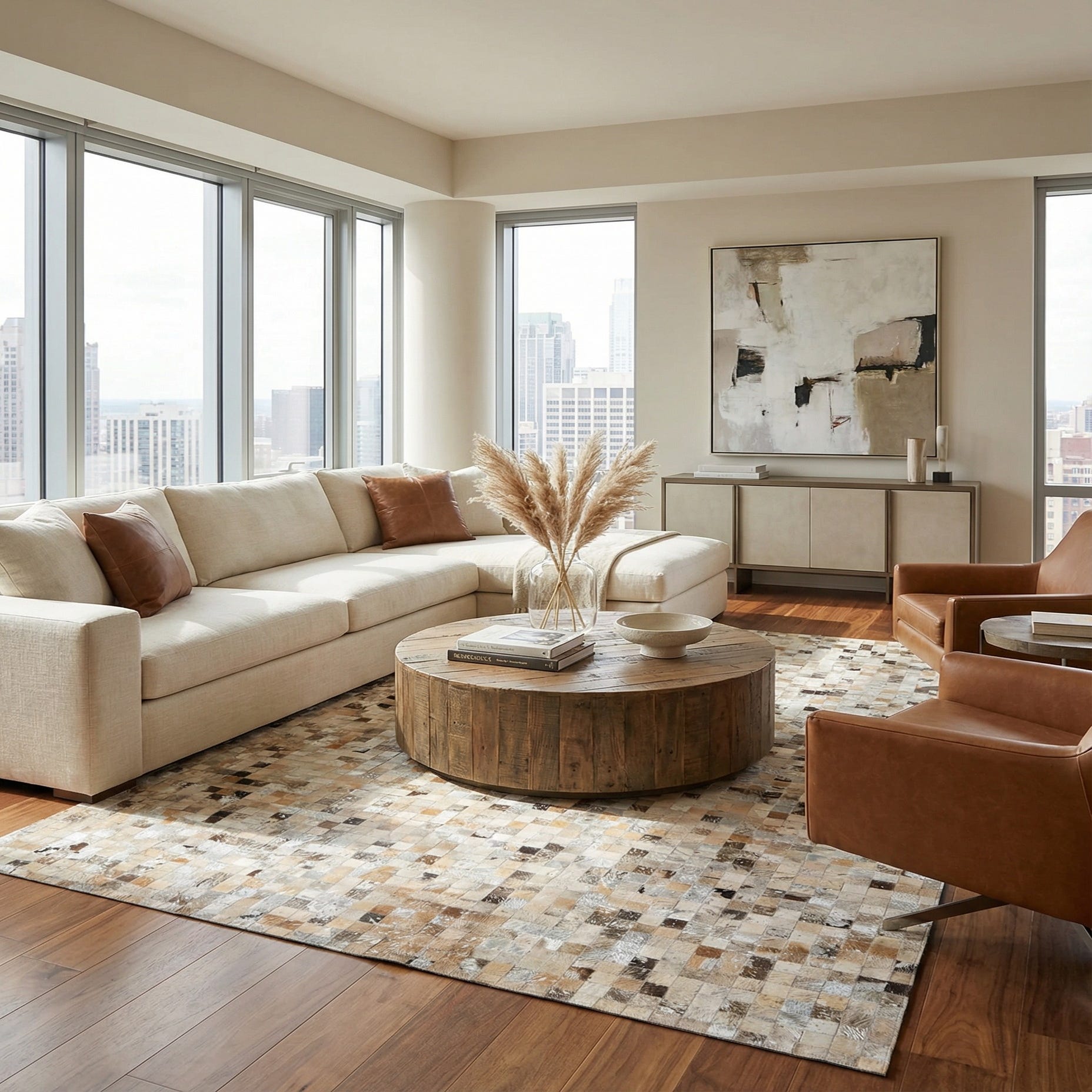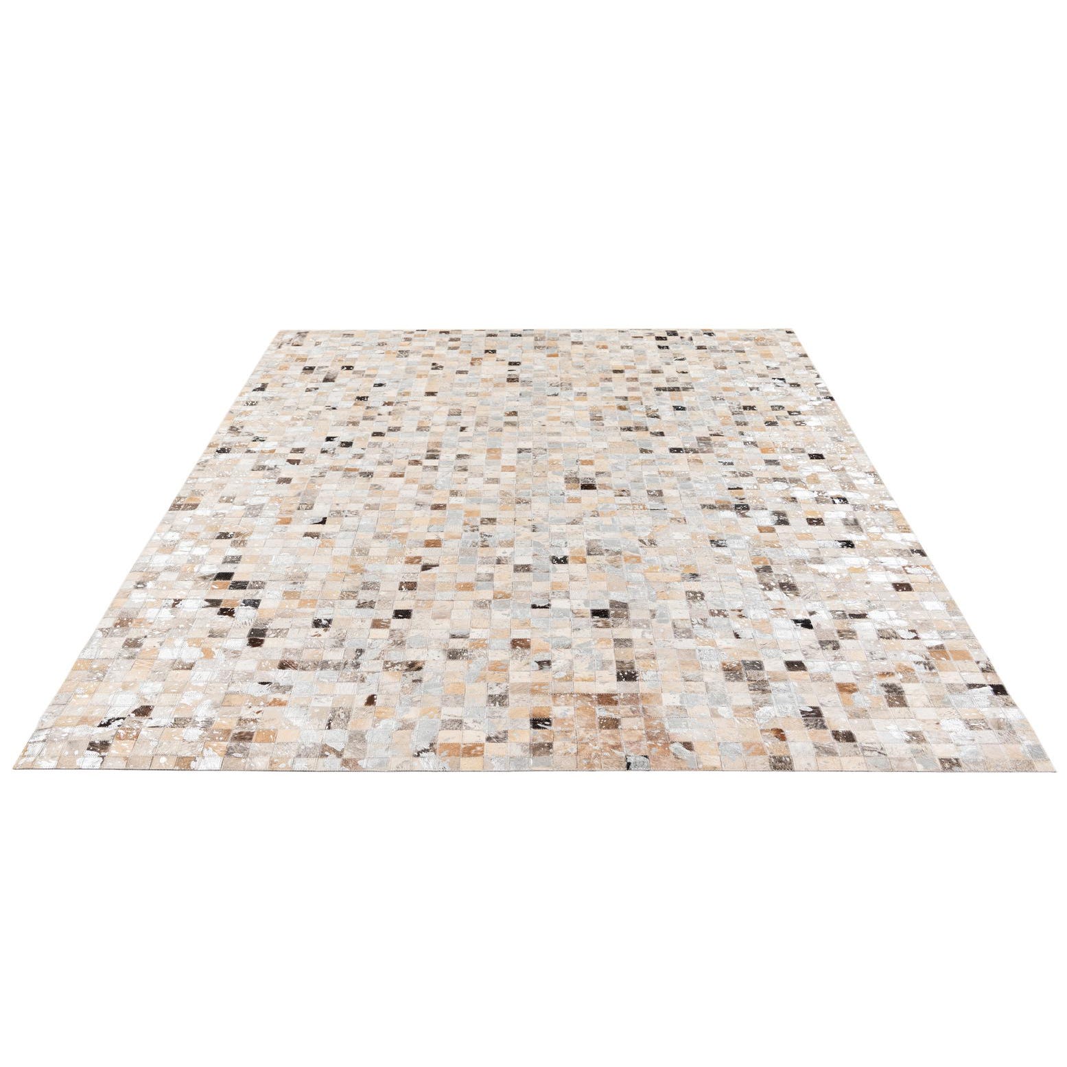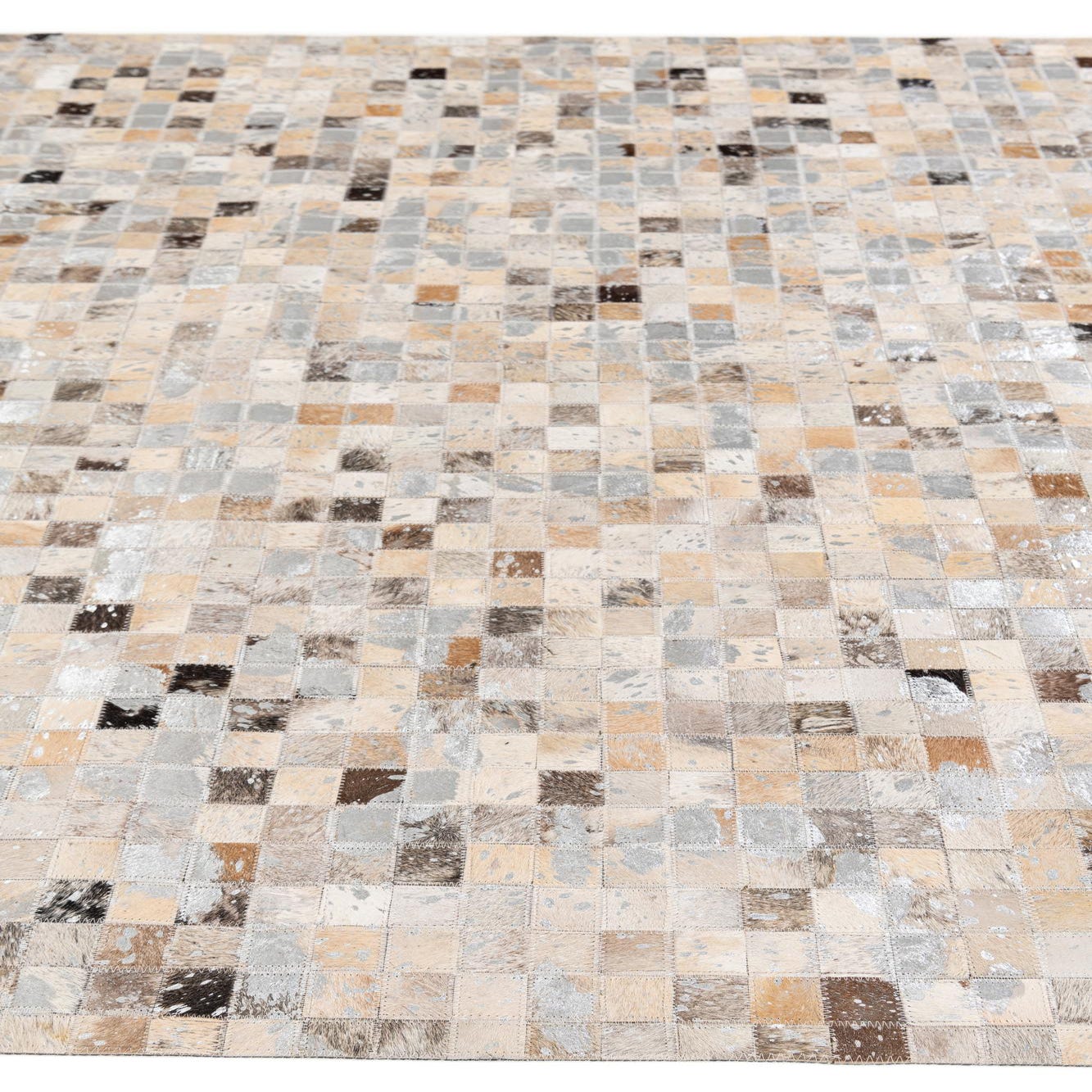 A 5x8 rectangular Cowhide Stocks rug by Rugs.com, featuring a modern patchwork of multi-colored cowhide squares in various natural tones.