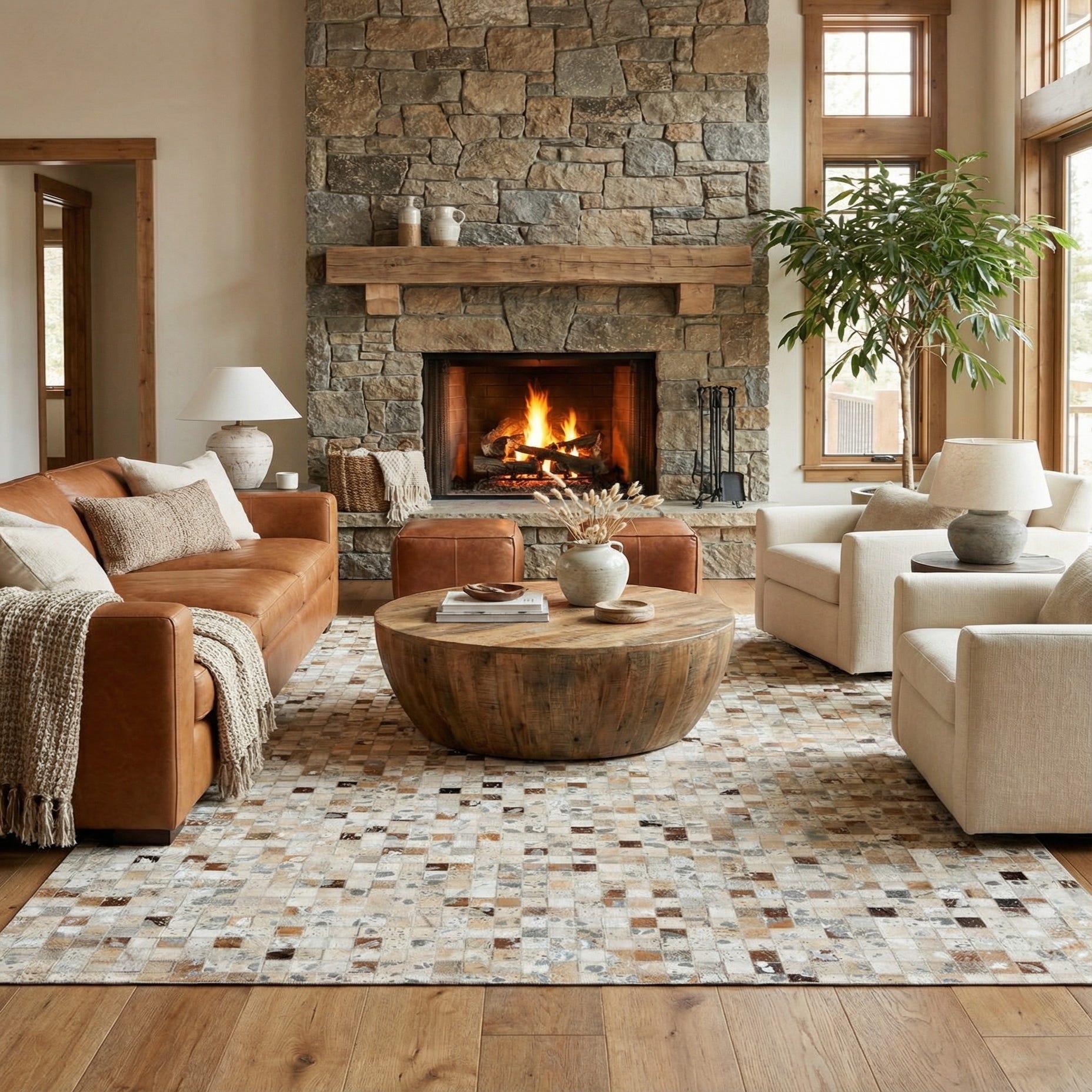 Designed to anchor a seating area or define a space without overpowering it, this rug pairs naturally with leather sofas, warm wood furnishings, and matte metal accents. Use it to layer over hardwood or concrete in a living room, place it under a dining table for subtle patterning, or set it at the foot of the bed to introduce texture to a bedroom. Its neutral palette and contemporary patchwork feel suit modern farmhouse, transitional, and industrial-inspired interiors.
