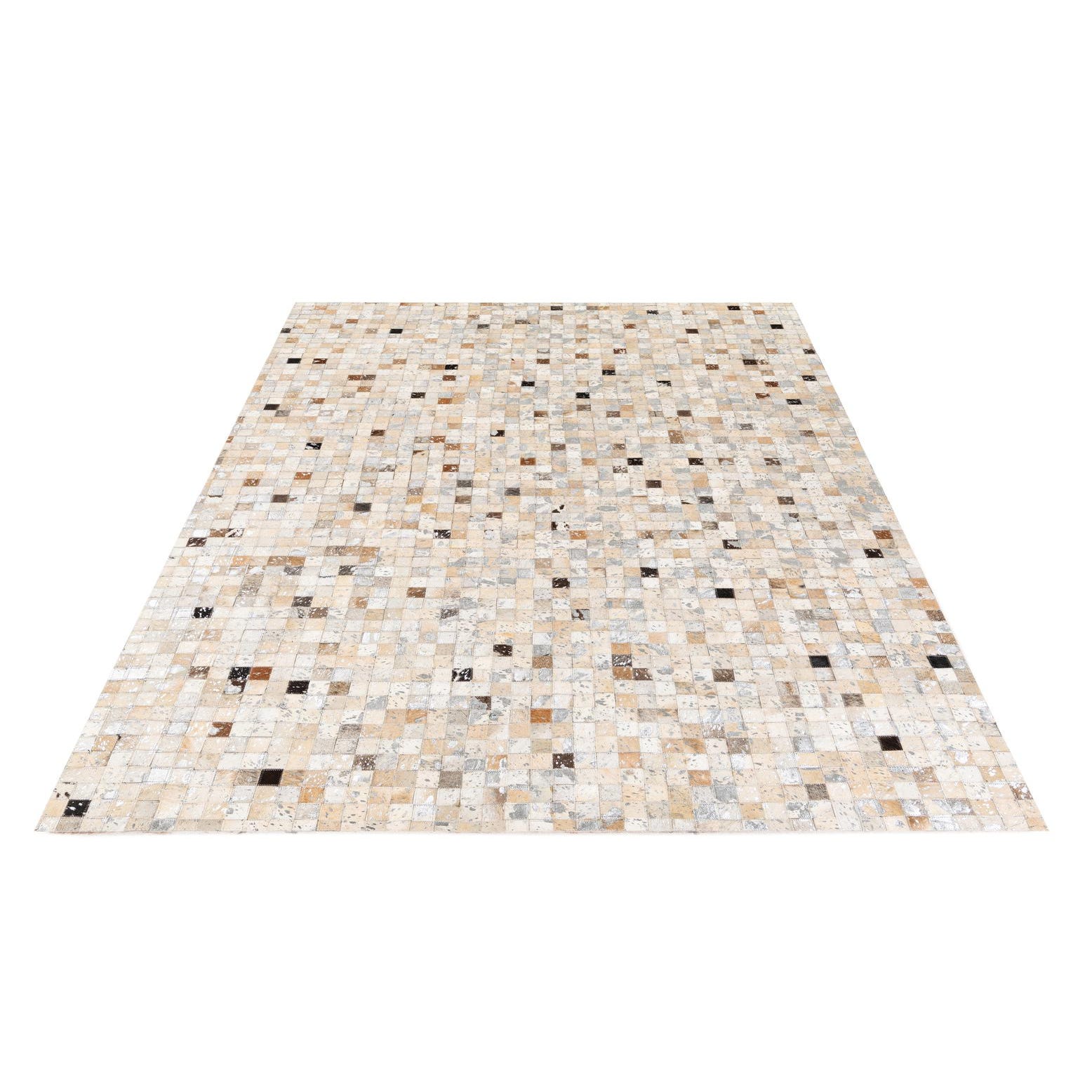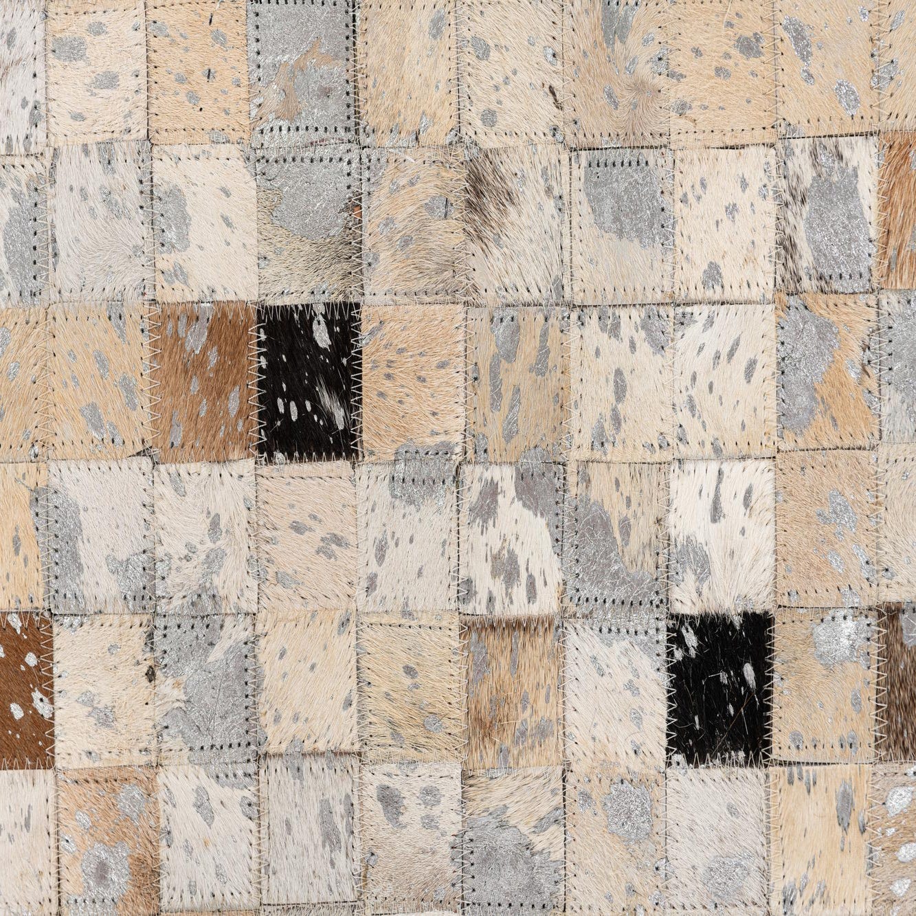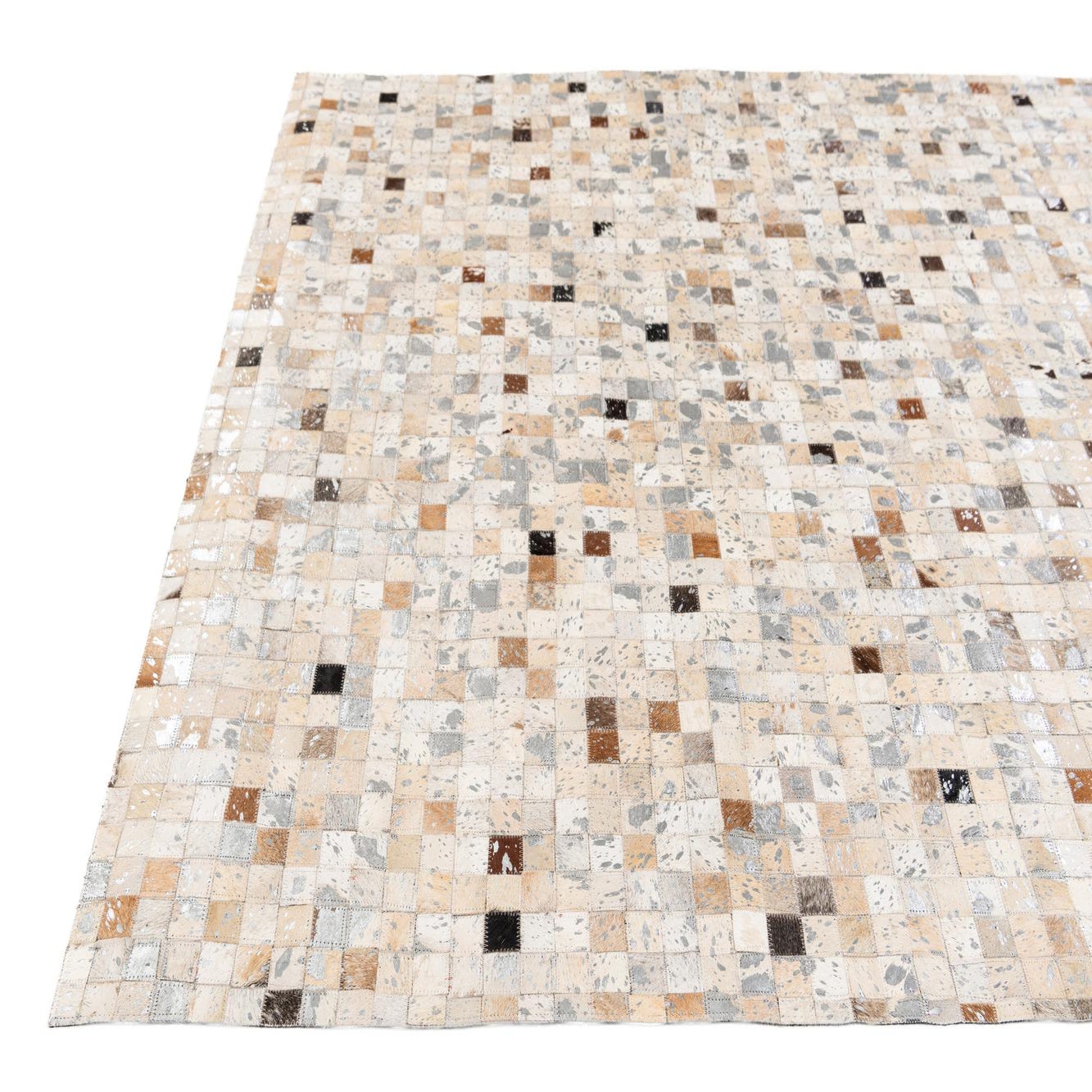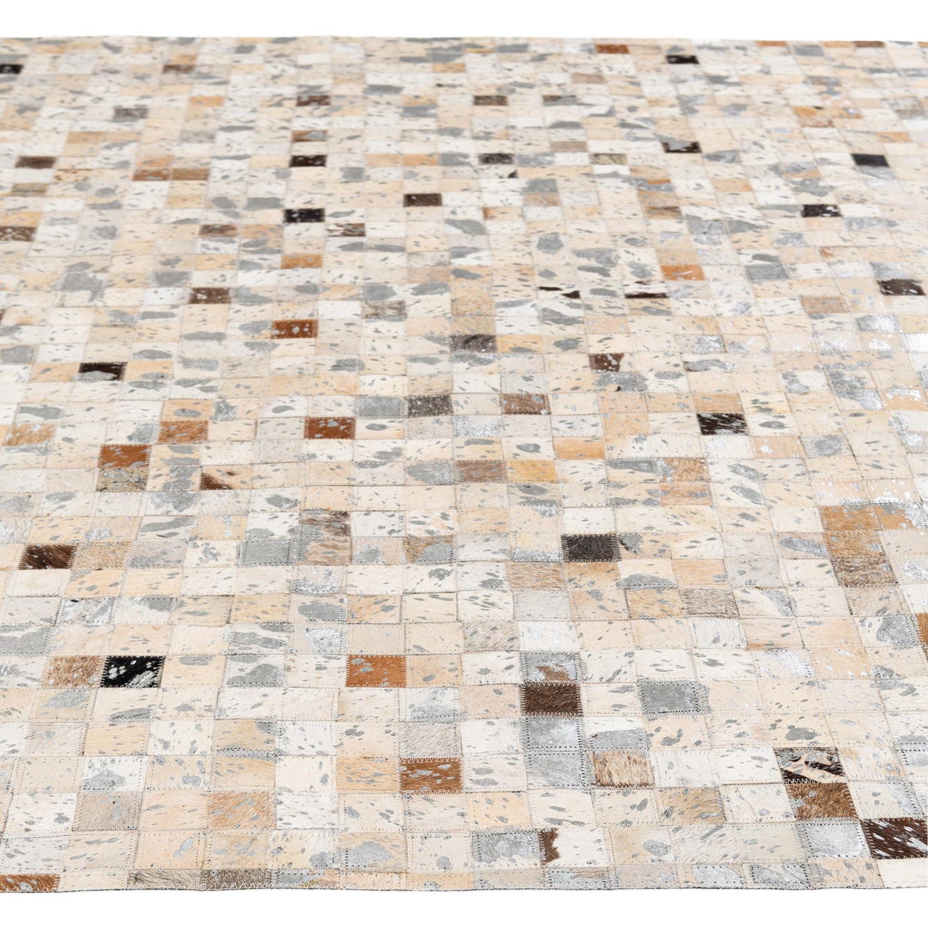 A 5x8 rectangular, multi-colored modern cowhide rug with a patchwork design of light beige, brown, and black squares.