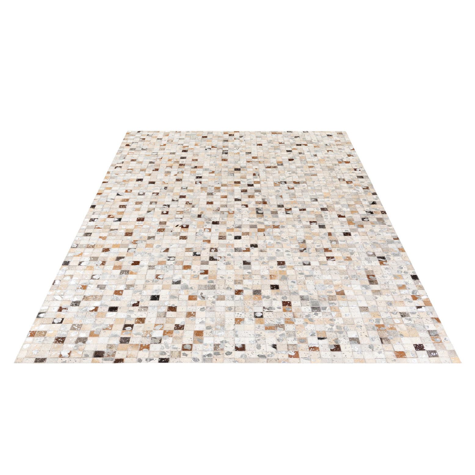 A rectangular 5x8 modern multi-colored cowhide rug with a patchwork of small squares in varying natural tones of cream, brown, and grey.