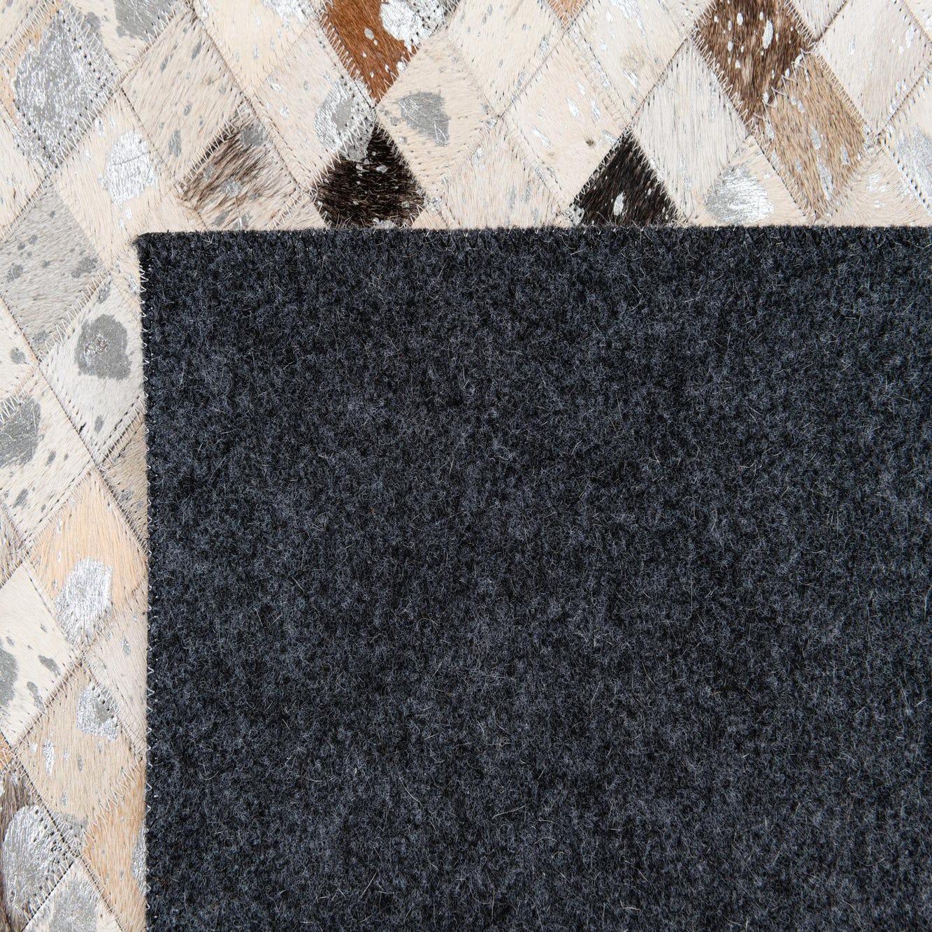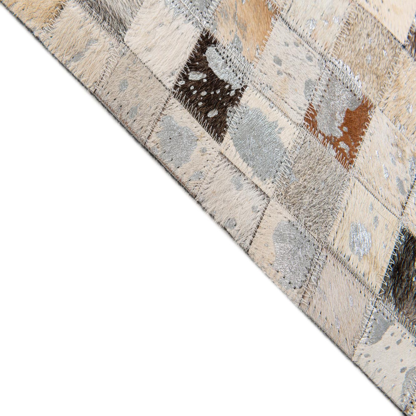 The palette mixes ivory, beige, tan, gray and brown for a warm, neutral field with cool accents. Running your hand over the rug you’ll notice the soft hair-on-hide pile contrasted by stitched leather seams, giving a gentle, low-profile texture and a tactile richness that’s pleasant underfoot.