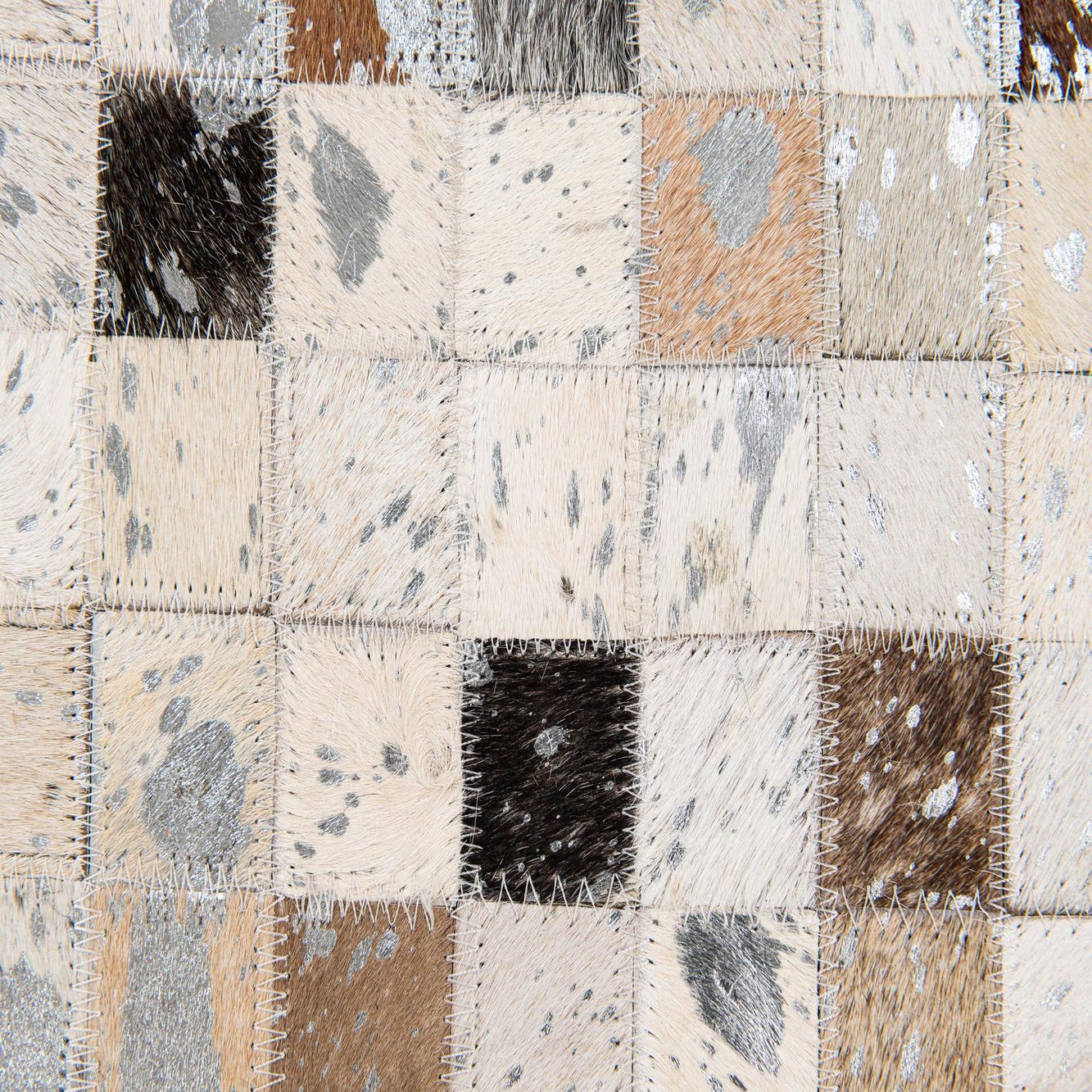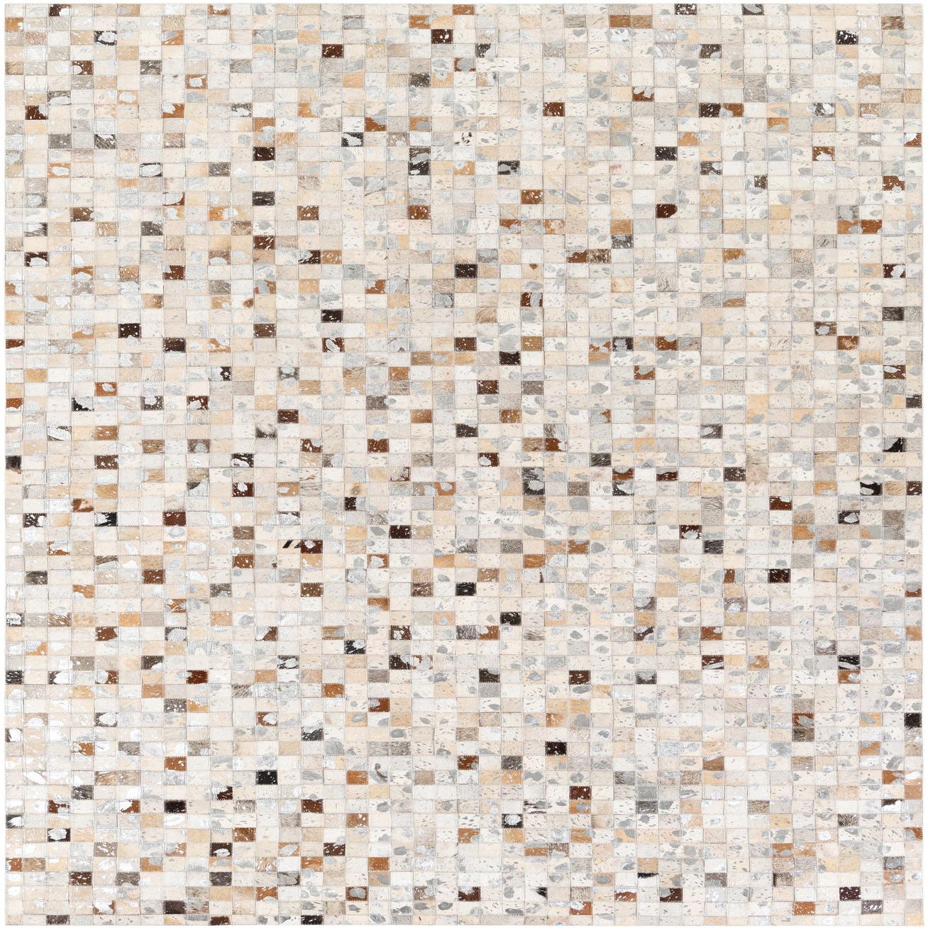 Hand made of cowhide and leather, this rug is composed of hundreds of small square patches sewn together to form a tight mosaic. The pattern balances geometric order with organic variation—each patch carries natural hair-on-hide markings and subtle tonal shifts set against a multi background, creating a quietly textured surface that reads as both structured and lived-in.