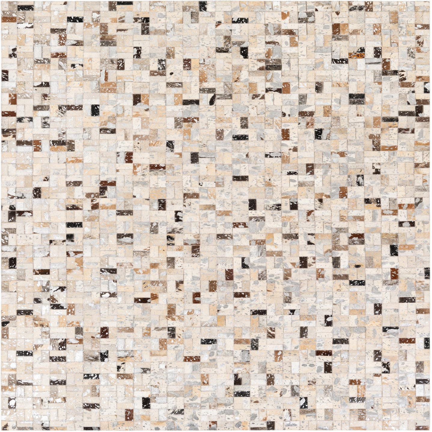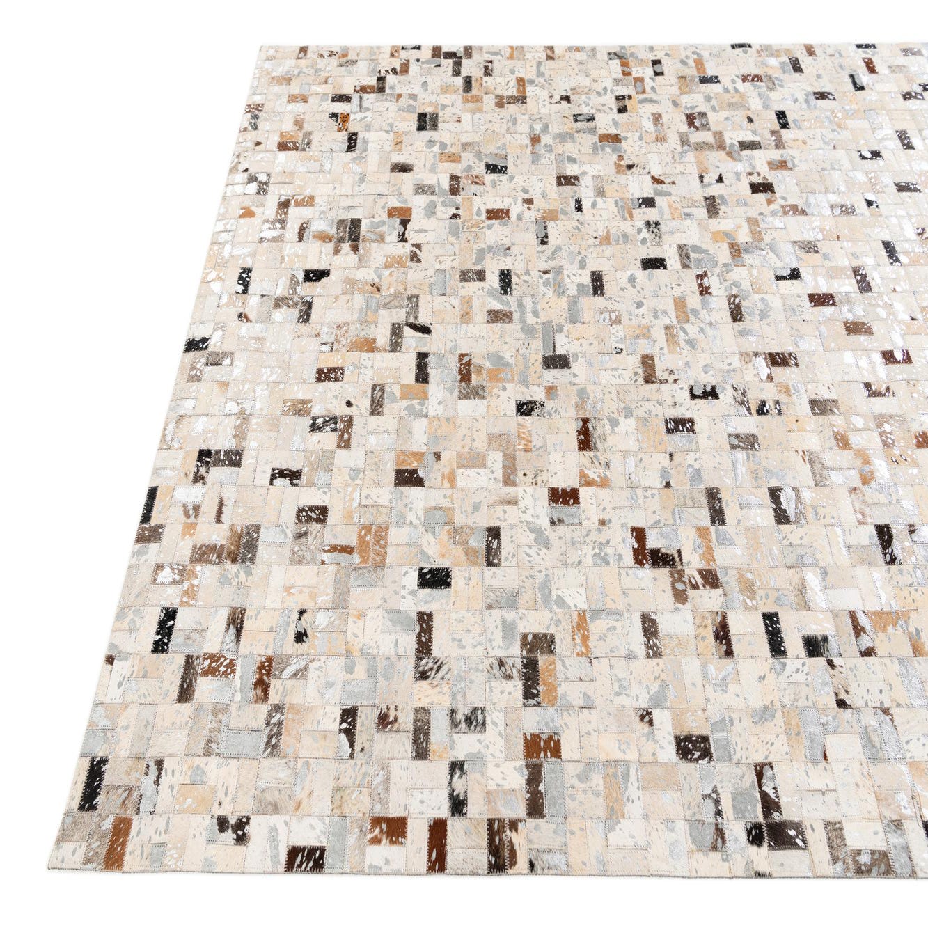 A rectangular 5x8 modern cowhide rug in multi-colored patchwork, featuring various shades of brown, beige, and white.