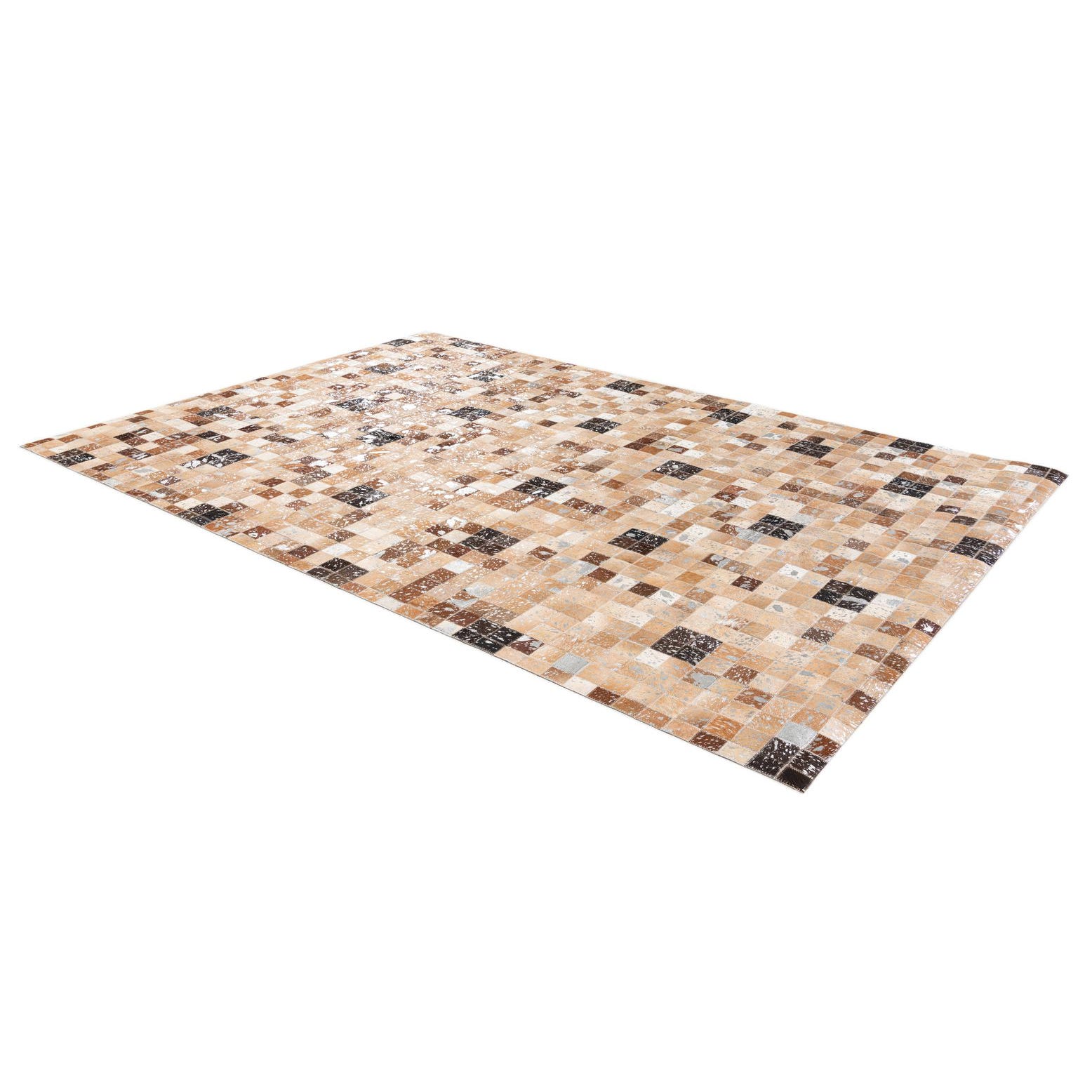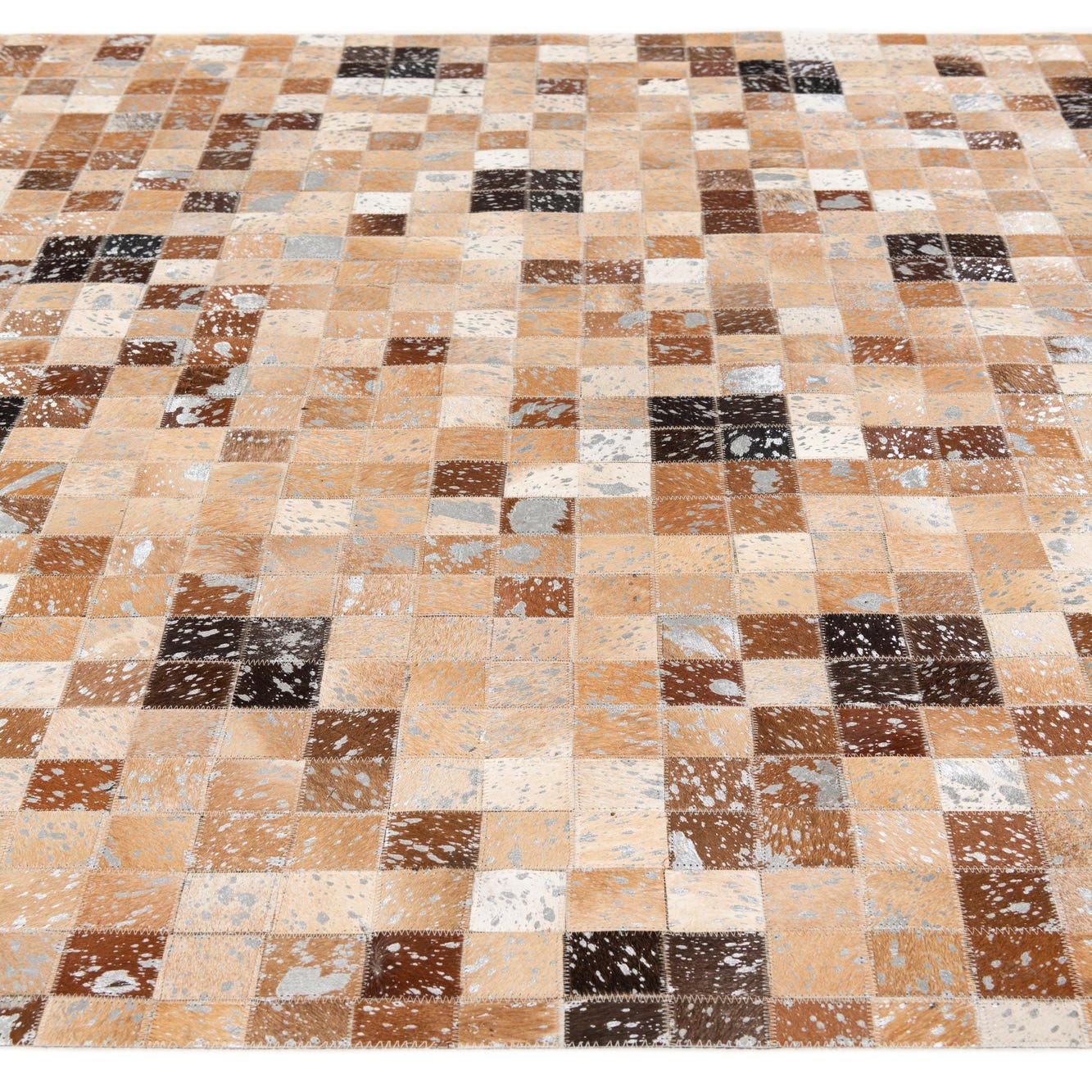 A rectangular 5x8 modern rug made from multi-colored cowhide and leather patches, featuring a mosaic-like pattern of various brown, black, and white speckled squares.