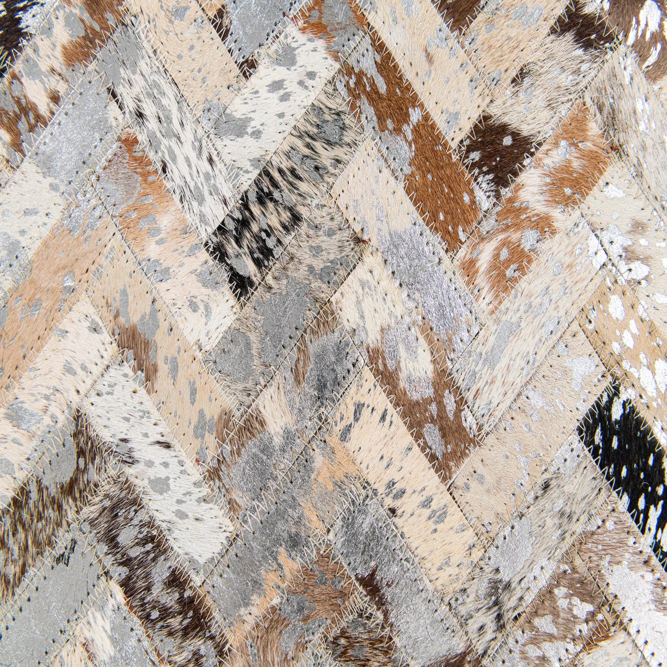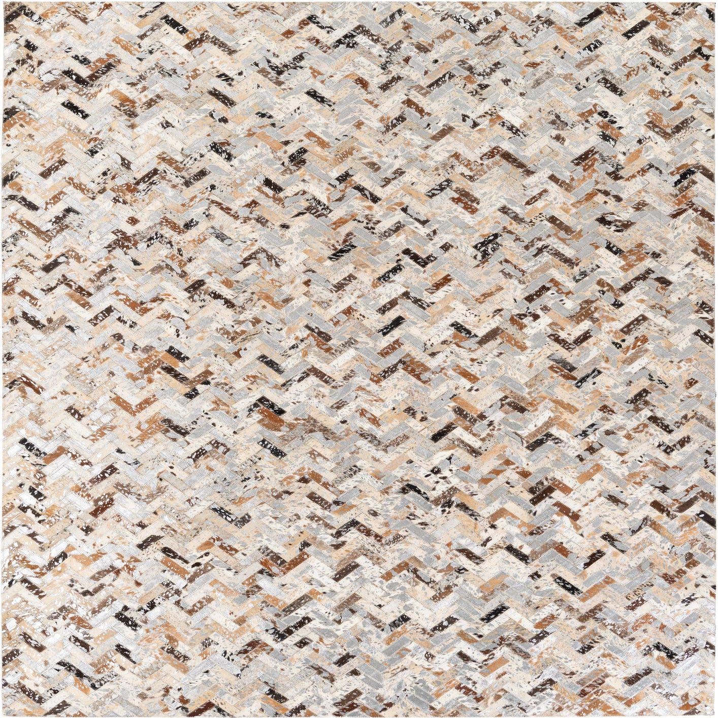 A 5x8 rectangular Cowhide Stocks rug from Rugs.com, featuring a modern multi-colored chevron pattern of natural cowhide patches in shades of brown, black, white, and grey.