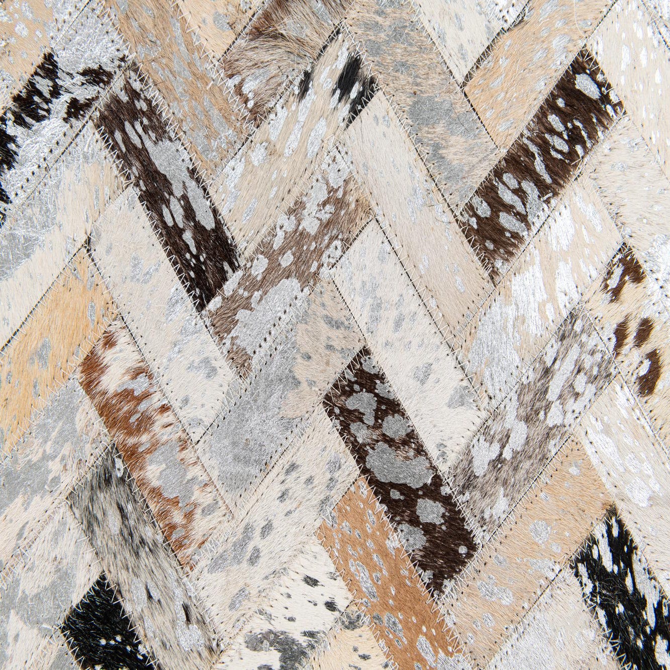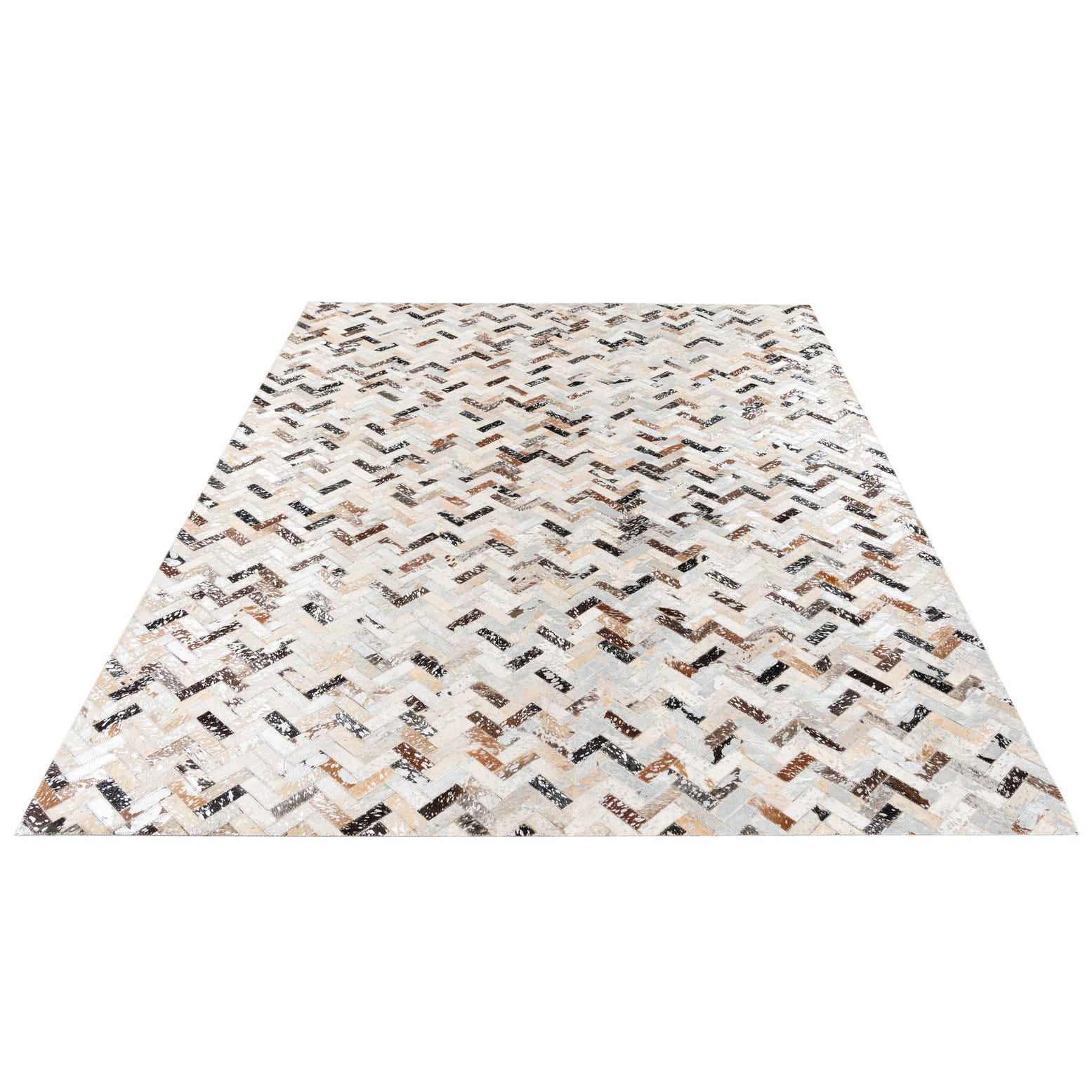 A 5x8 rectangular Cowhide Stocks rug from Rugs.com featuring a multi-colored modern chevron pattern in shades of brown, black, and cream.