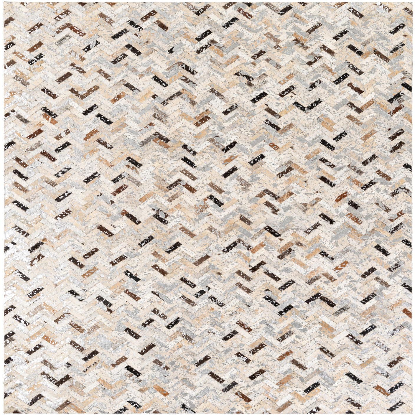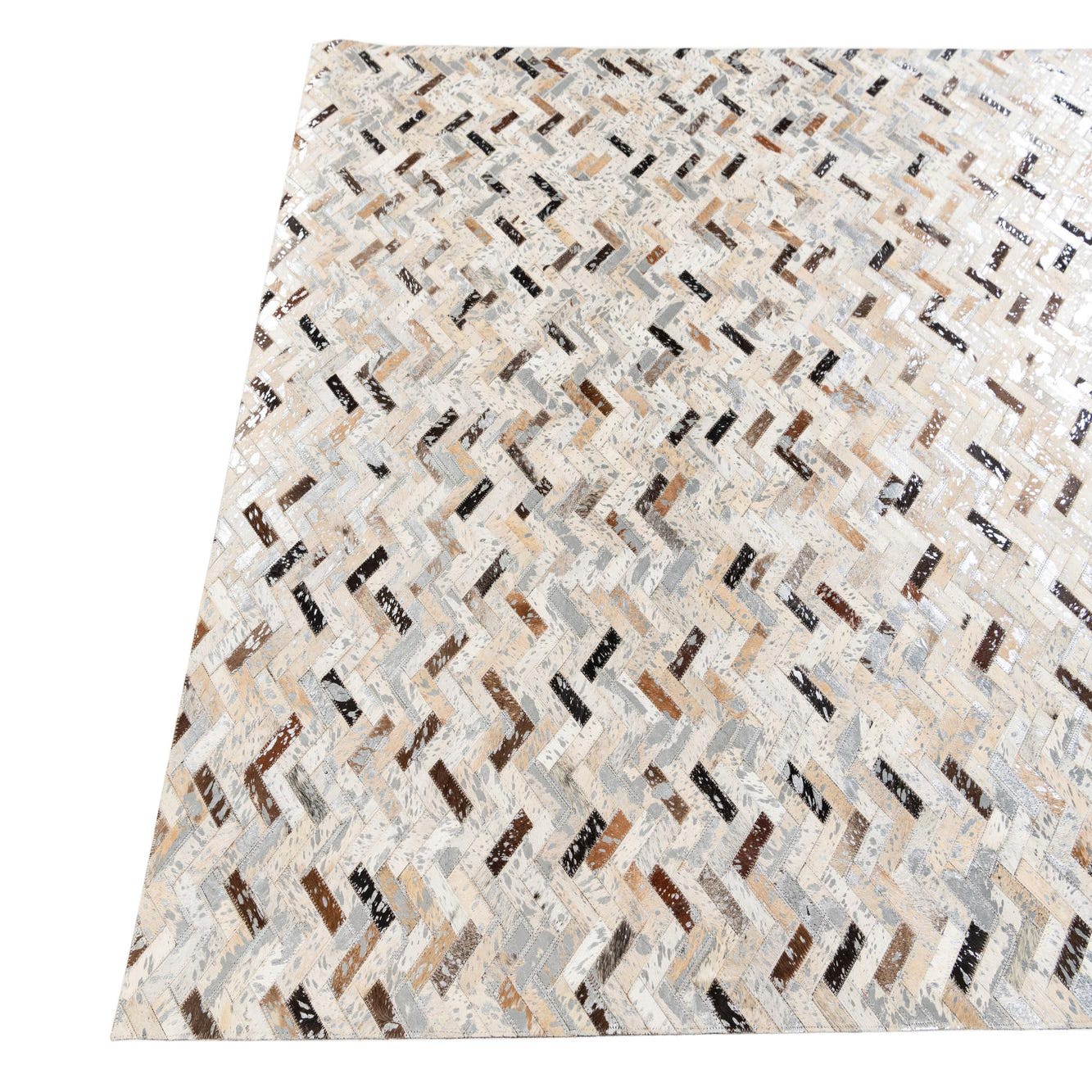 A rectangular 5x8 modern cowhide rug with a multi-colored herringbone pattern in shades of brown, black, beige, and grey.