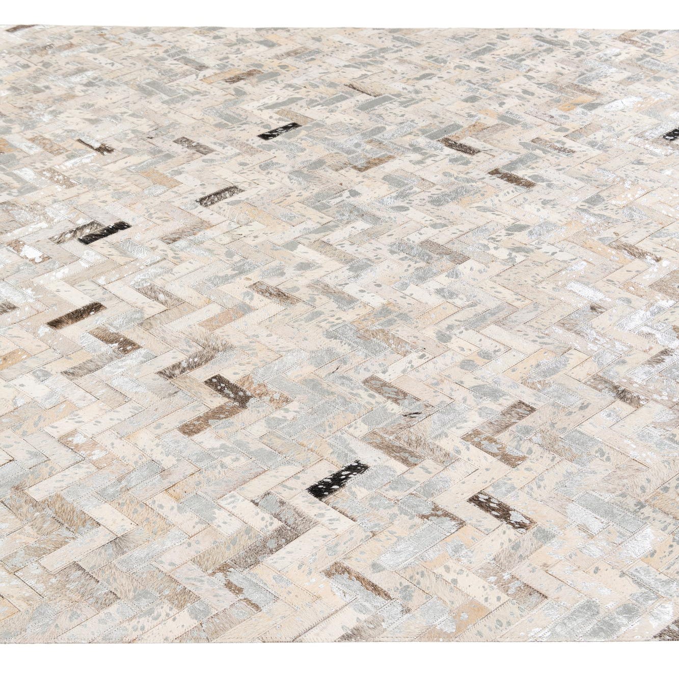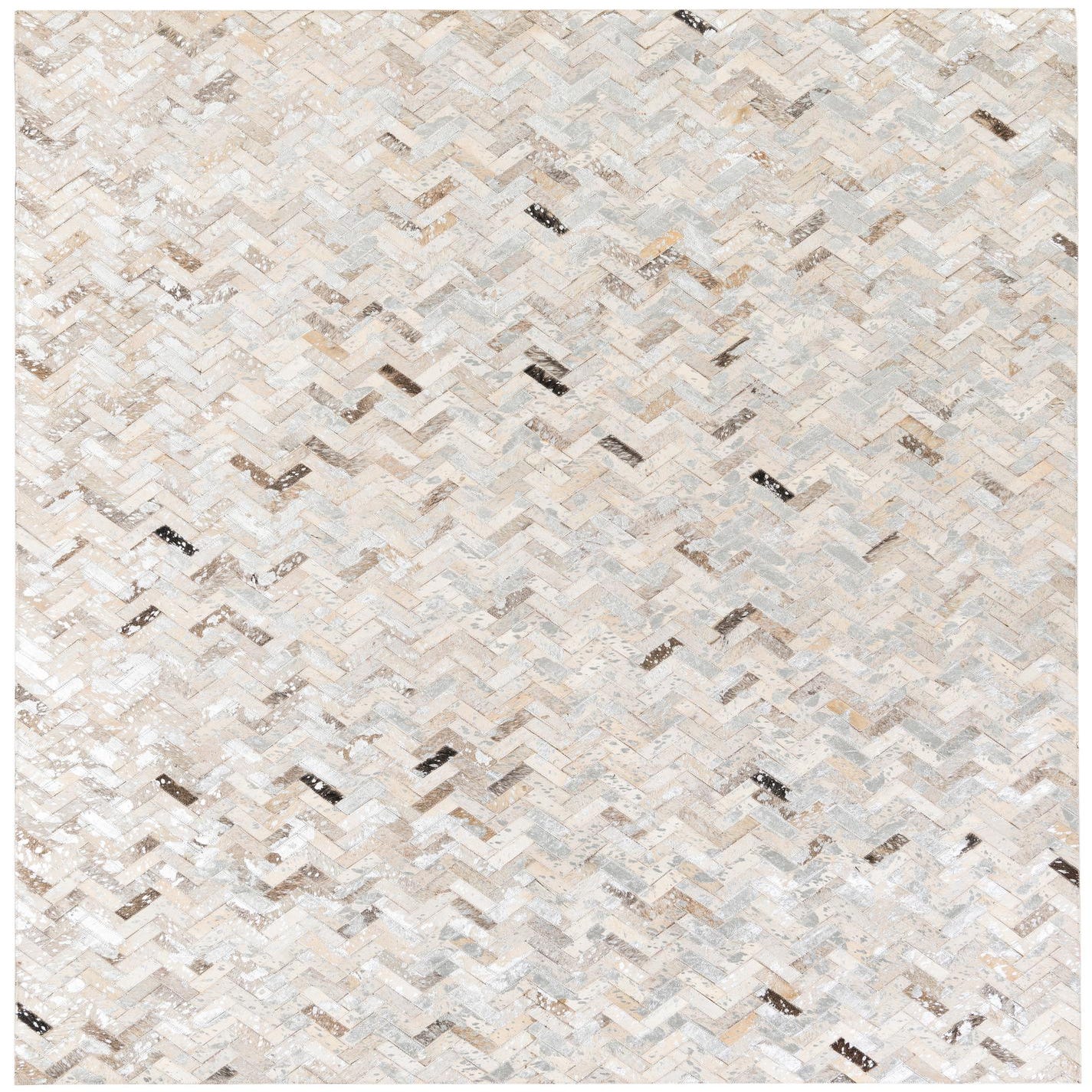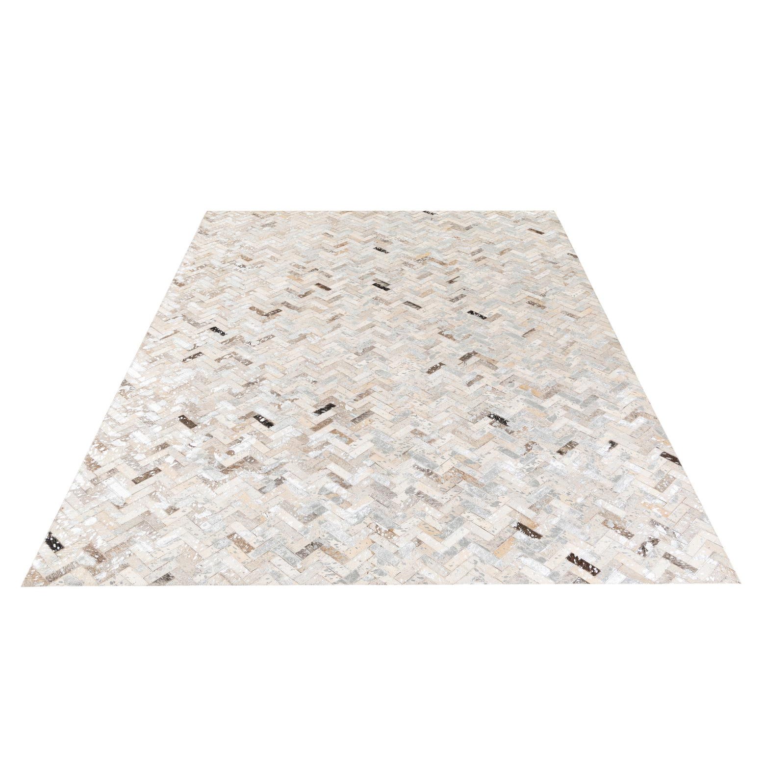 A rectangular 5x8 modern Cowhide Stocks rug from Rugs.com, featuring a multi-colored herringbone pattern in various natural cowhide tones, ideal for a living room.