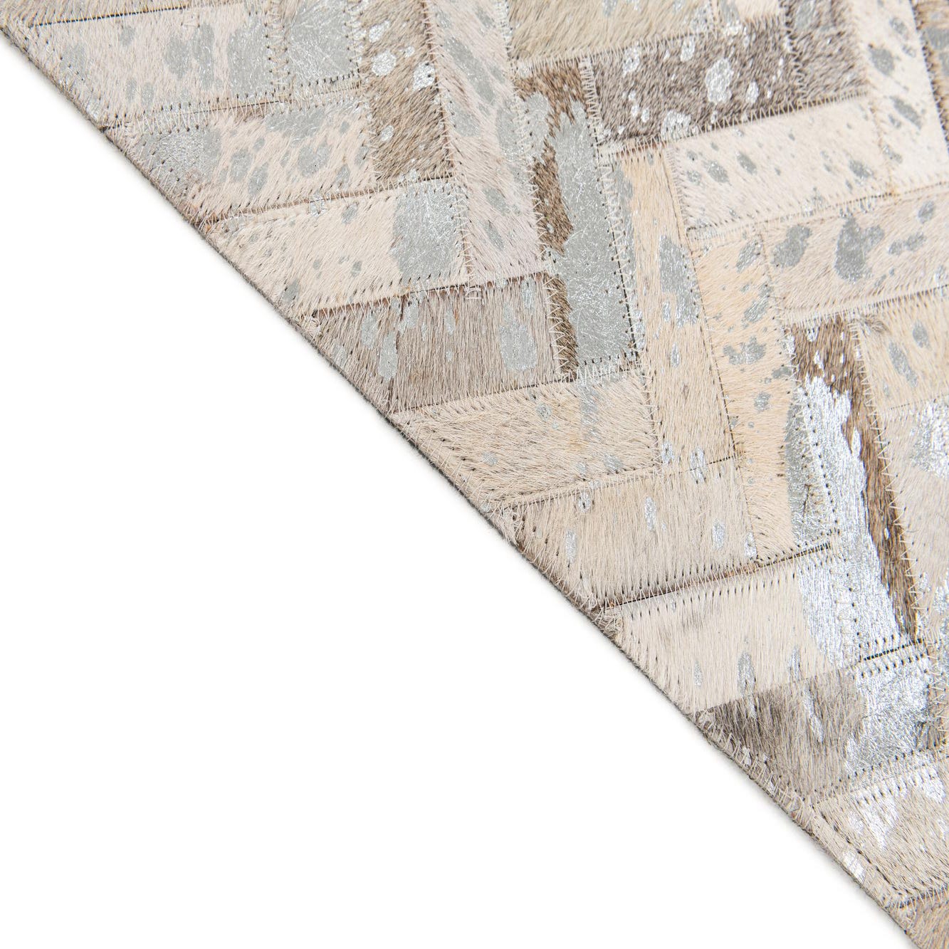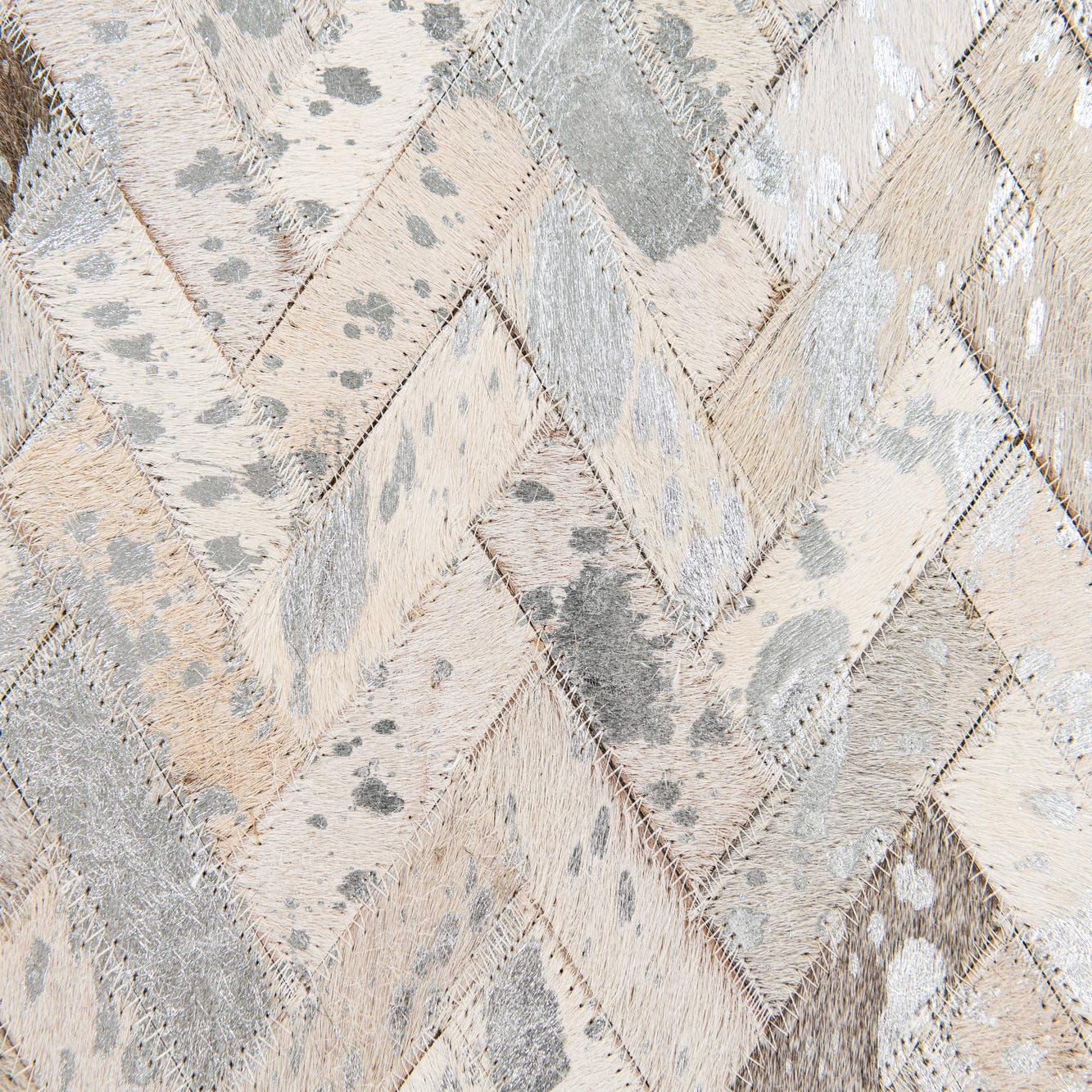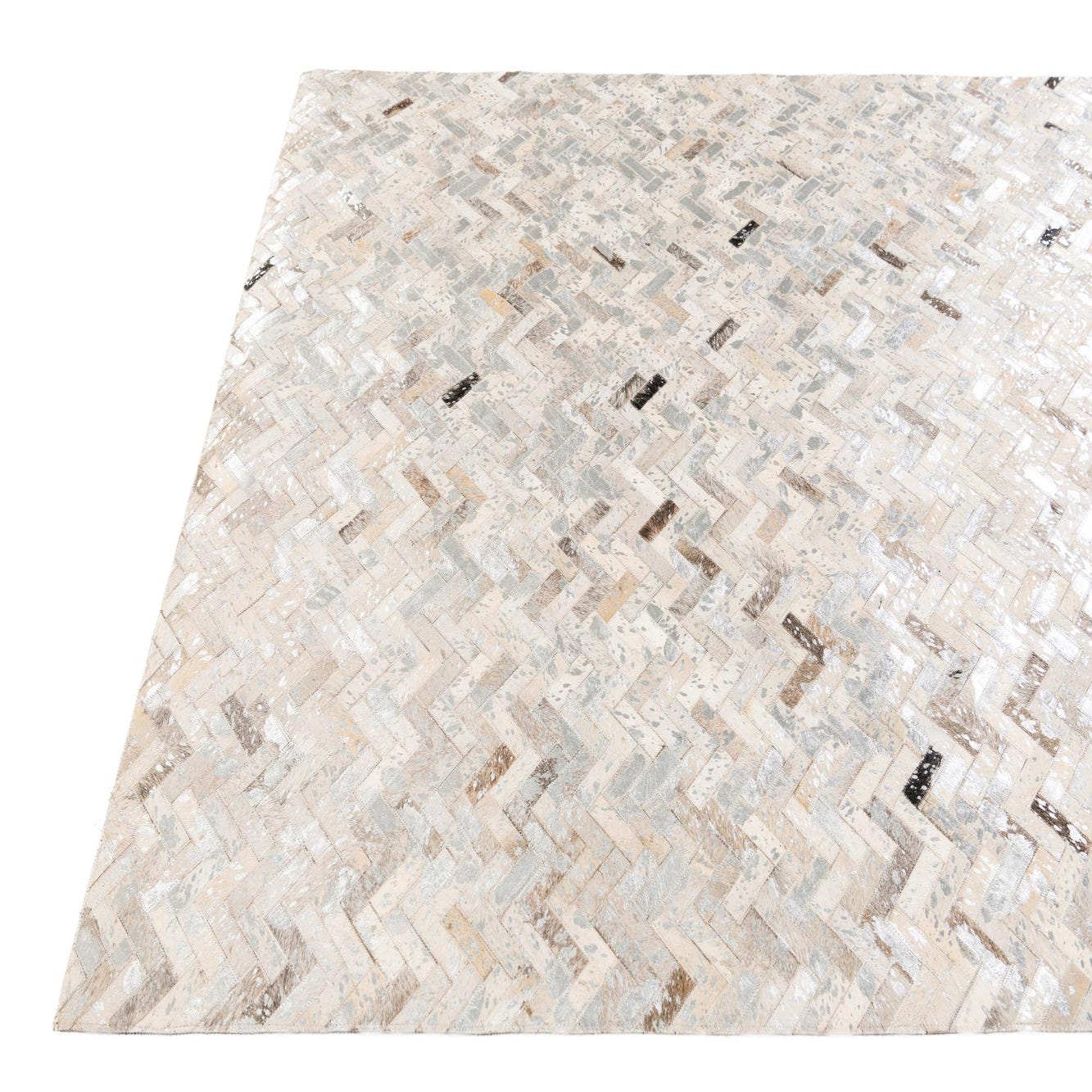 A rectangular 5x8 modern Cowhide Stocks rug from Rugs.com, featuring a multi-colored herringbone pattern in various natural cowhide tones, ideal for a living room.