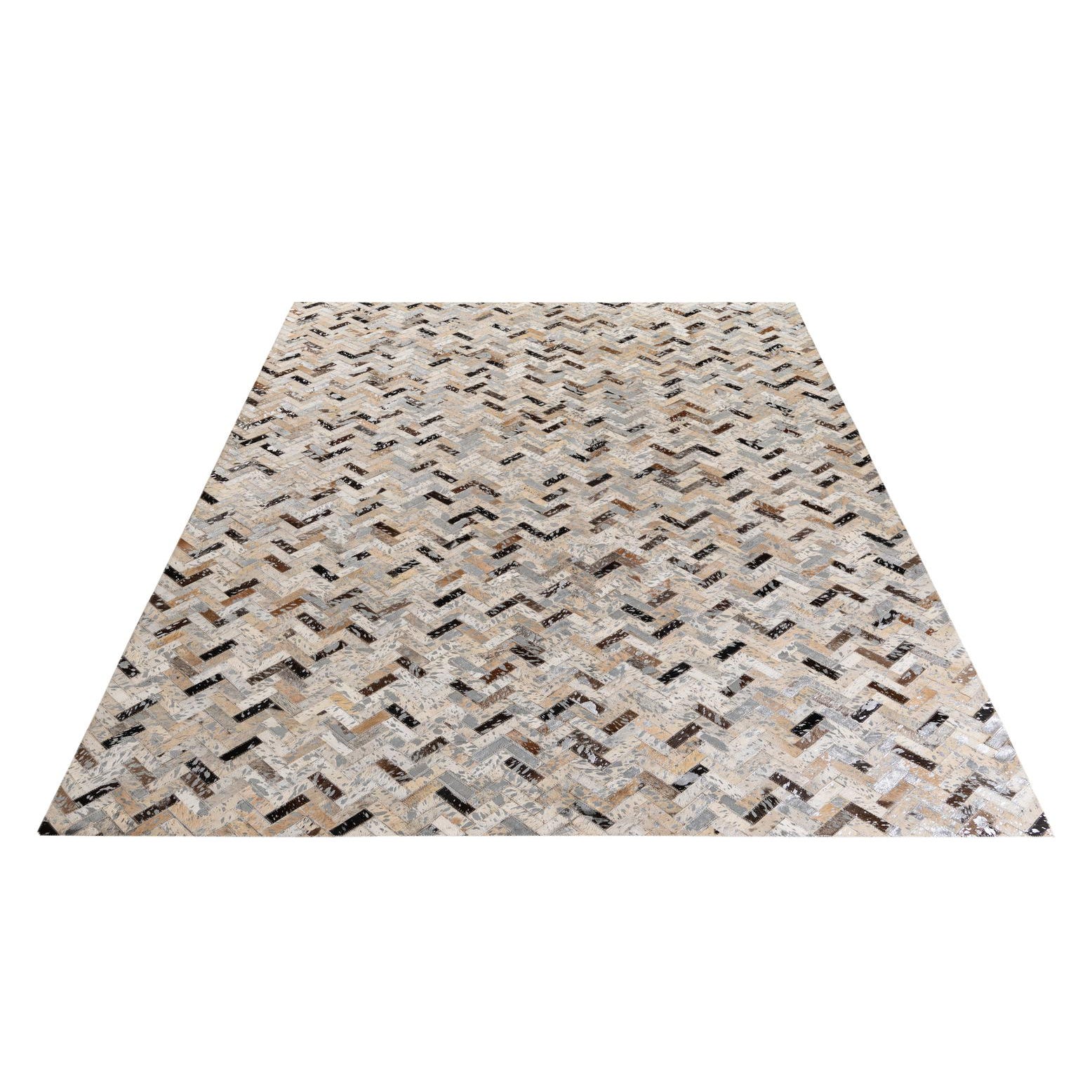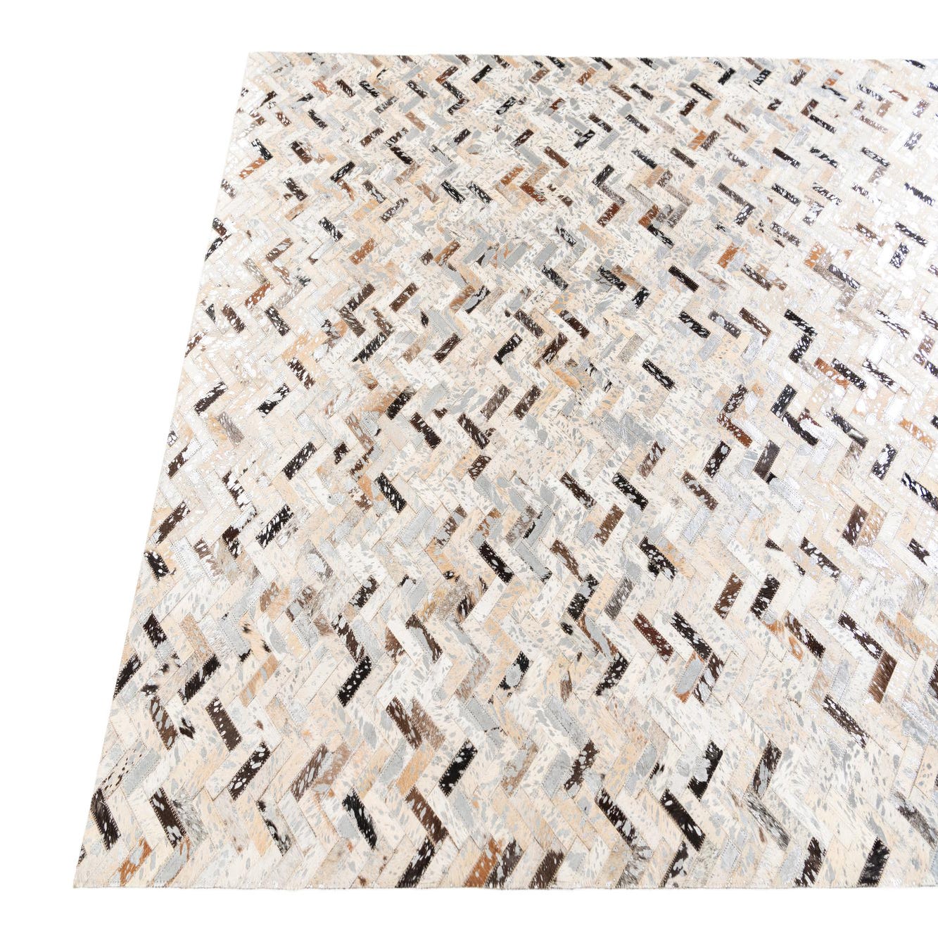 A 5x8 rectangular Cowhide Stocks rug from Rugs.com, featuring a modern multi-colored herringbone pattern in shades of brown, black, and cream.