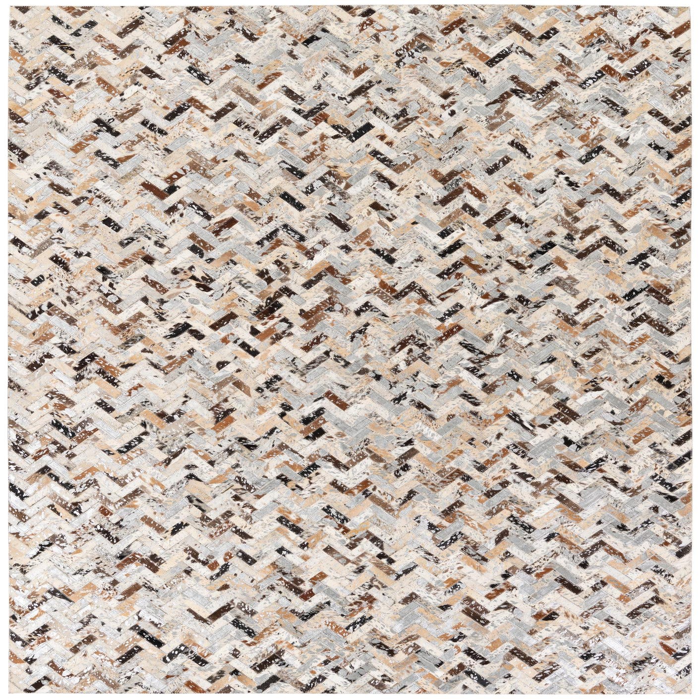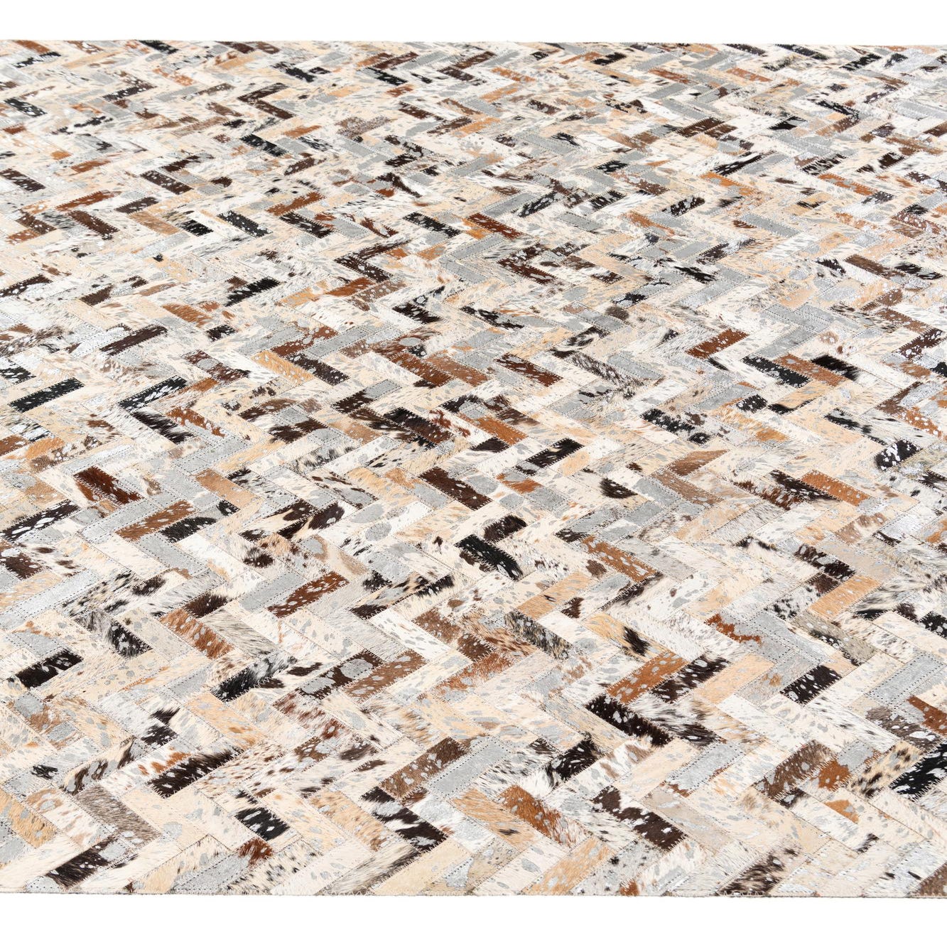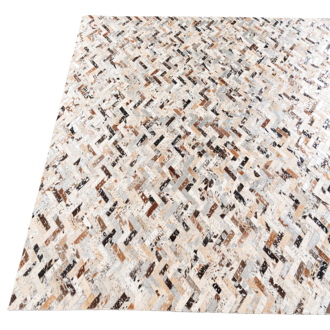 A rectangular 5x8 modern cowhide rug featuring a multi-colored chevron pattern in shades of brown, black, beige, and gray.
