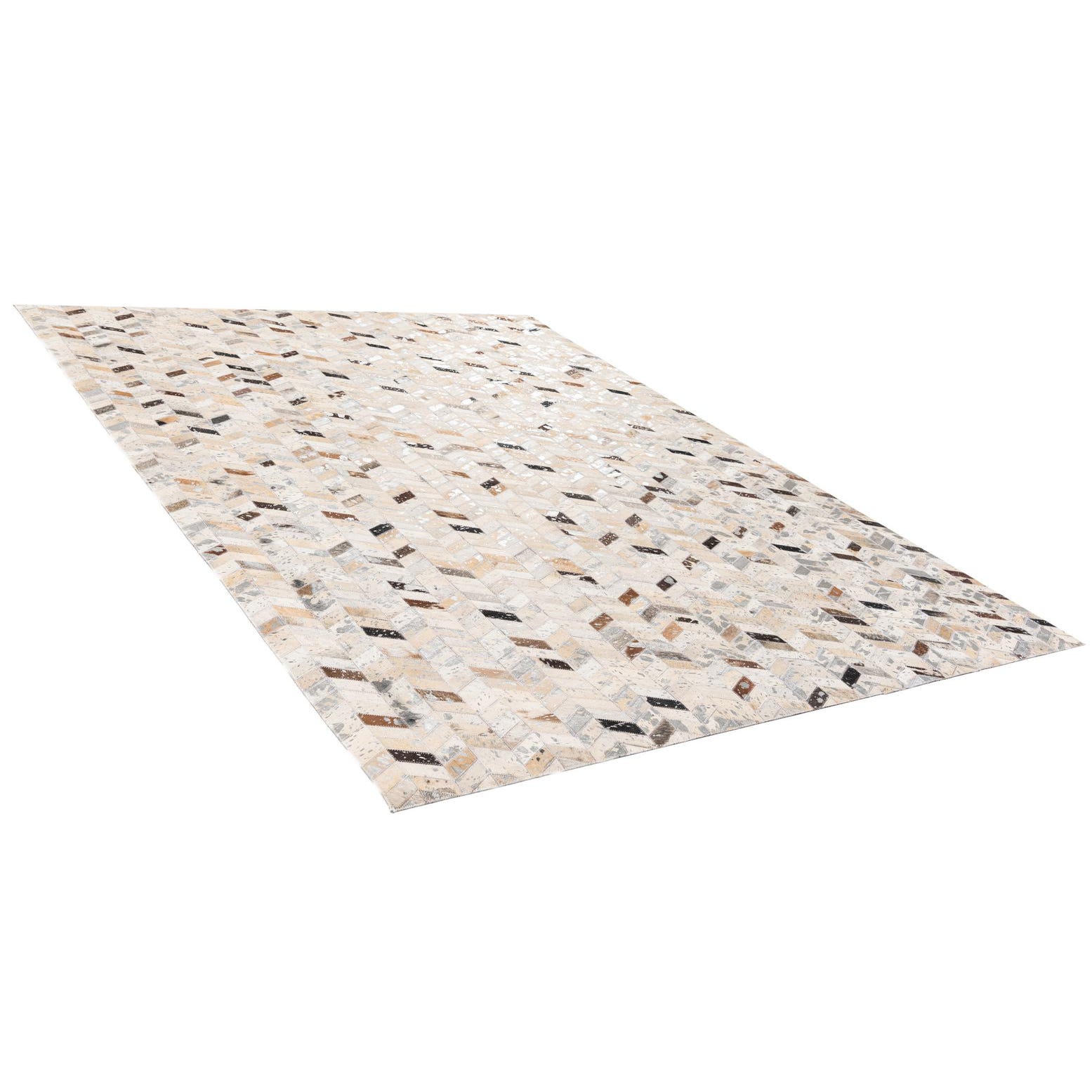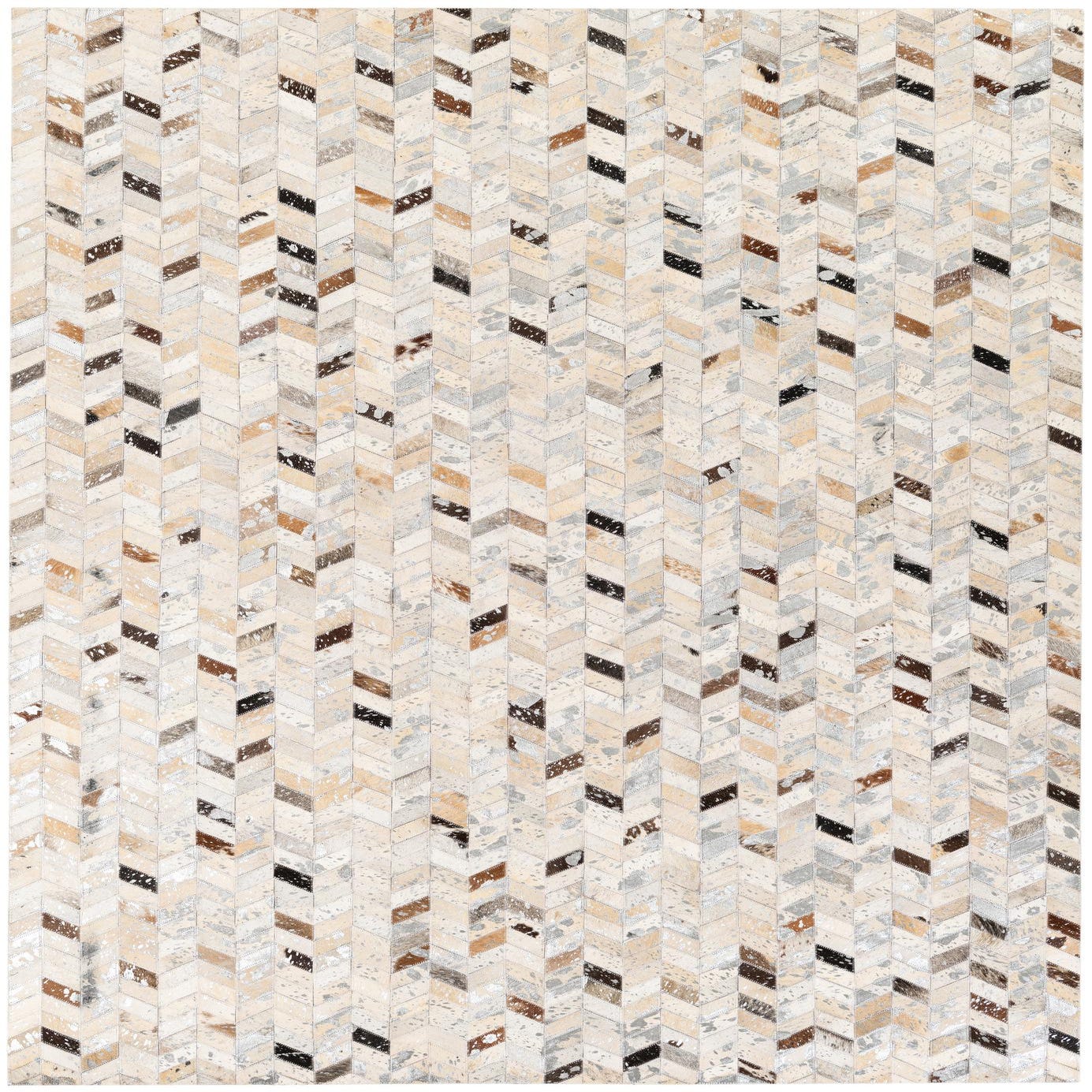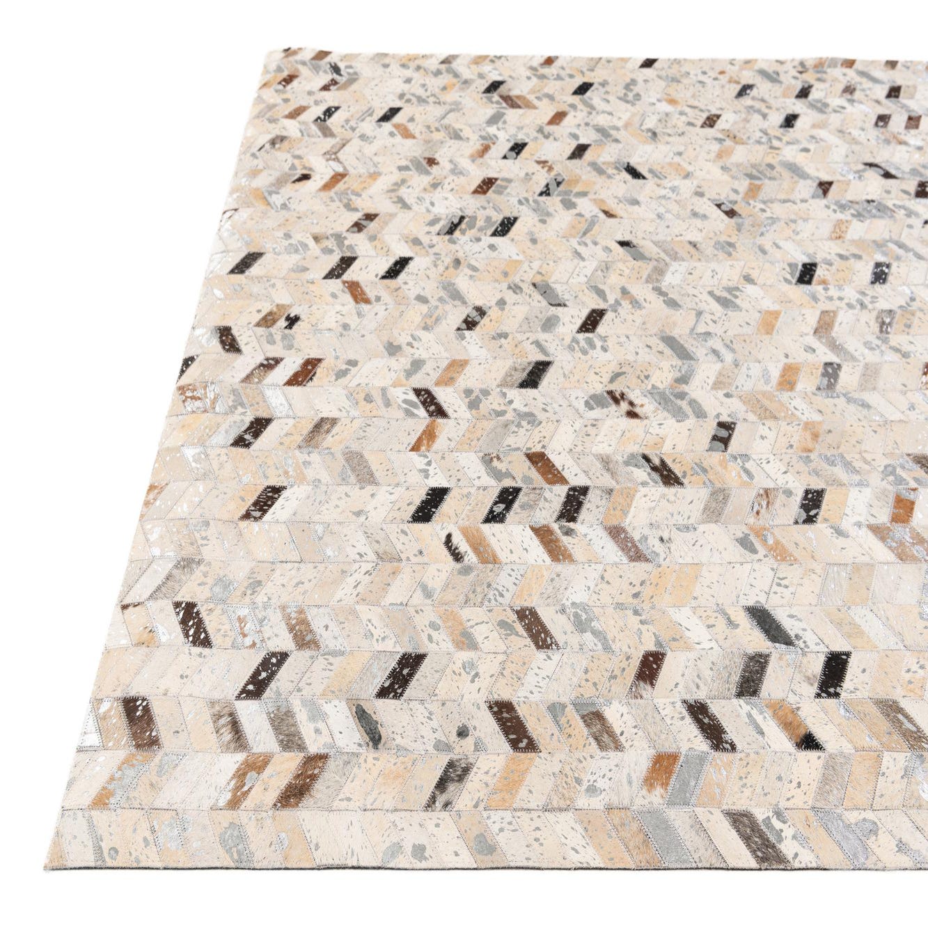 A 5x8 rectangular Cowhide Stocks rug from Rugs.com, featuring a modern chevron pattern in multi-colored natural cowhide and leather.