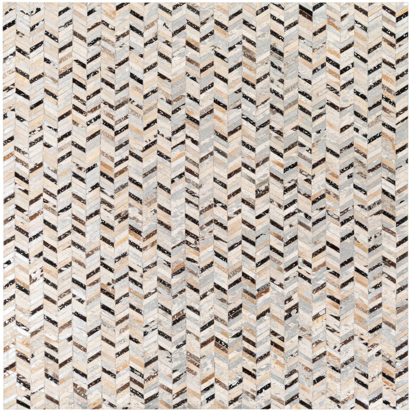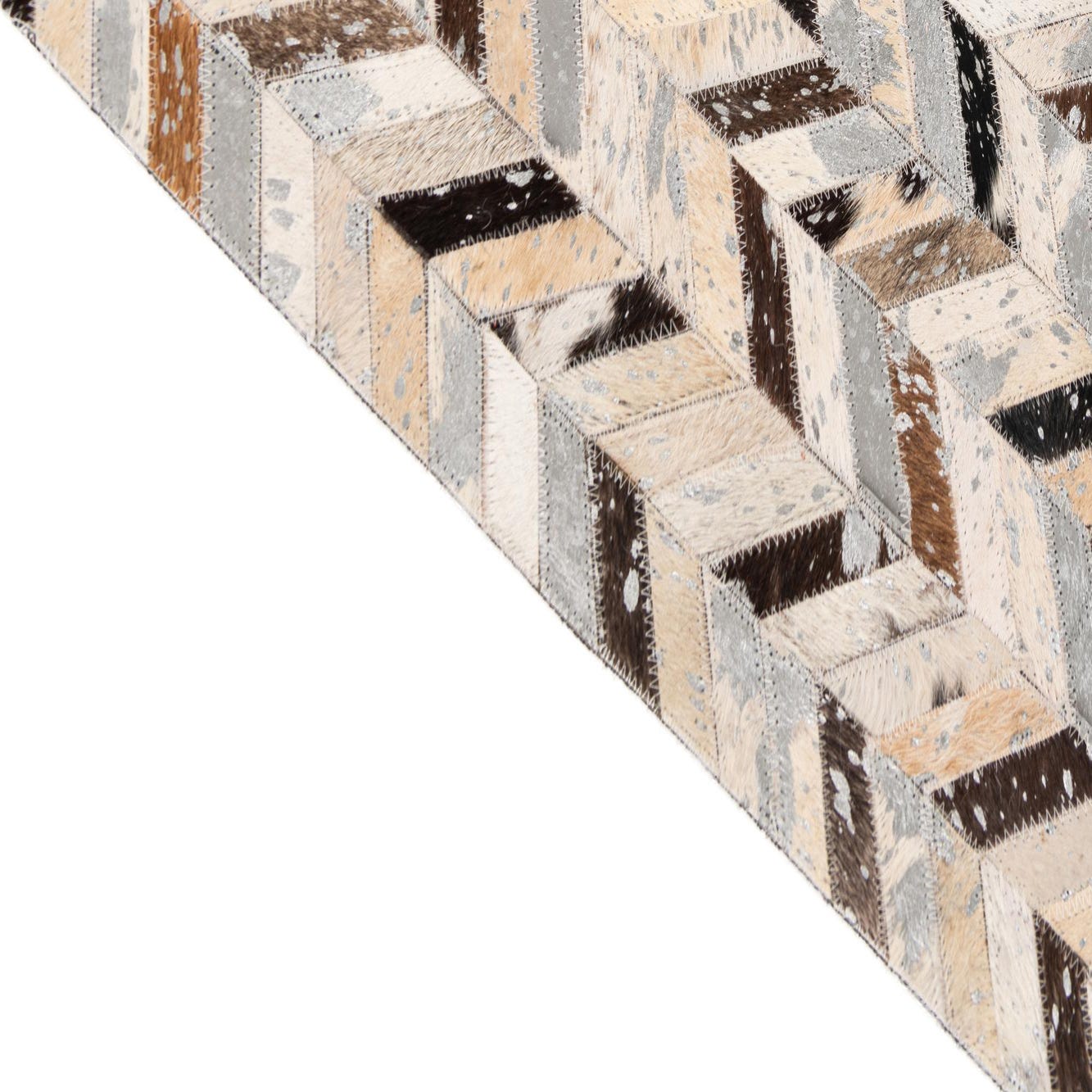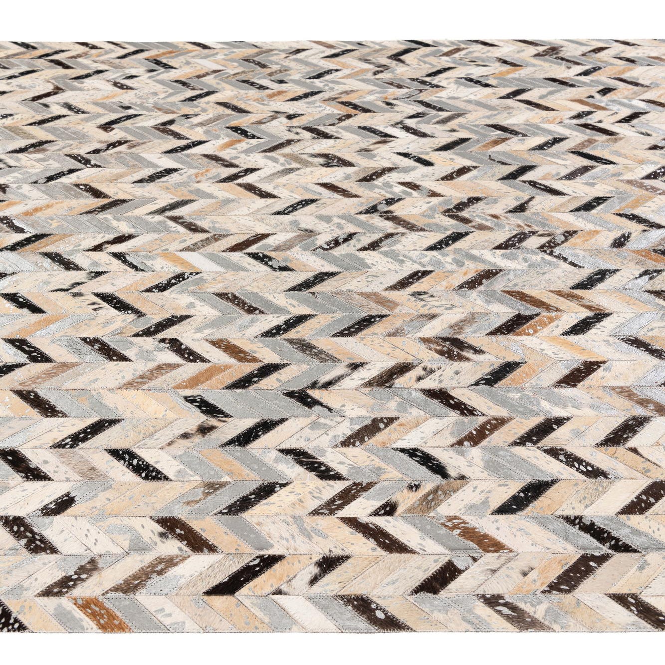 A tight chevron patchwork forms a rhythmic herringbone pattern across a multi background, made up of narrow leather and cowhide strips arranged in precise, repeating rows. Natural cowhide markings and subtle distressing create a mix of beige, ivory, tan, light brown, brown and silver tones that shift with the light. The surface has the soft, tactile quality of hair-on-hide with low pile and a slight sheen where each panel is stitched together, giving the rug a layered, handcrafted texture.