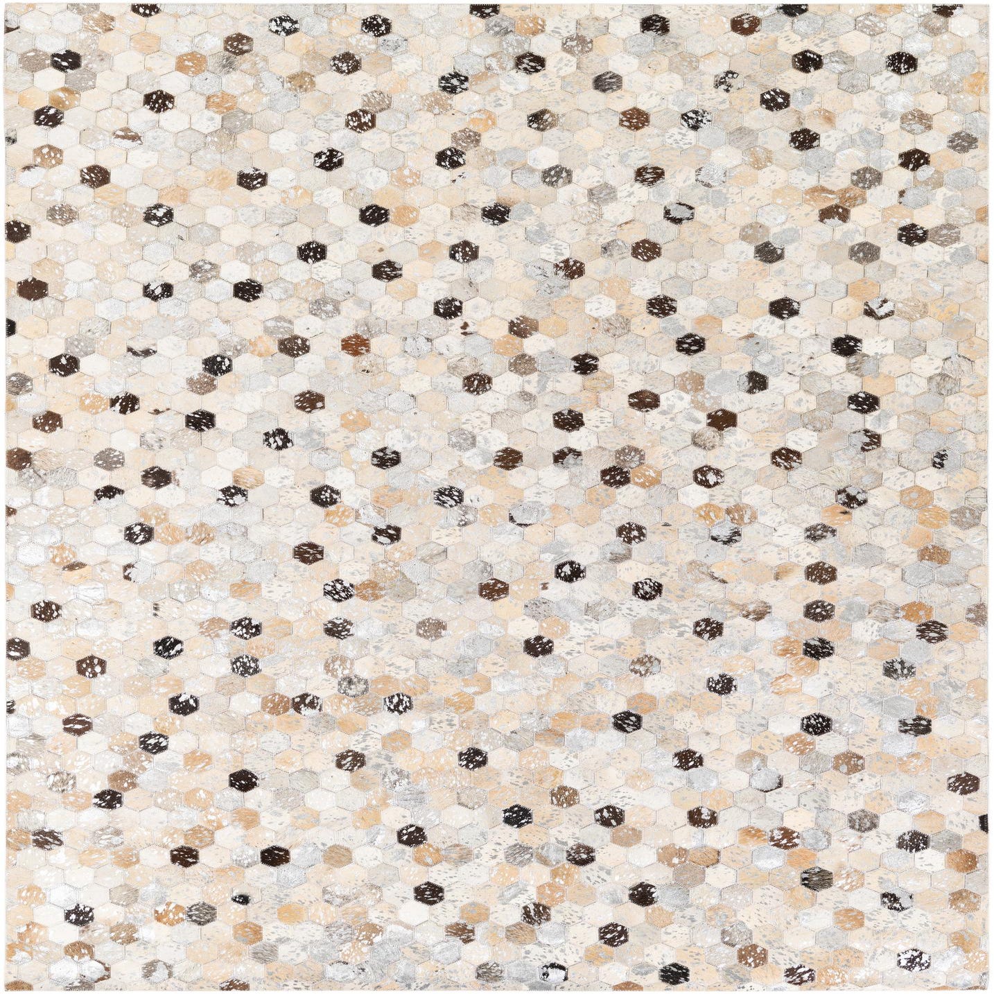 A 5x8 rectangular Cowhide Stocks rug featuring a modern mosaic of multi-colored hexagonal cowhide and leather patches in varying shades of brown, black, cream, and gray.
