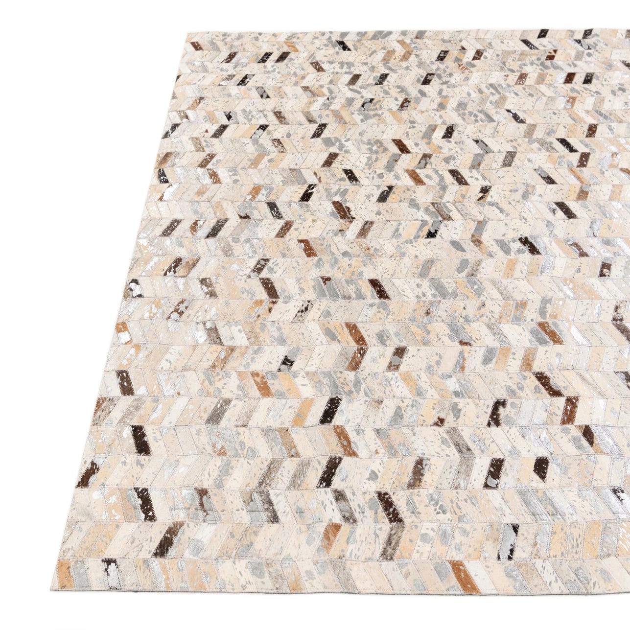 A narrow chevron patchwork in a multi-toned background creates a layered, graphic surface. Small, V-shaped pieces of cowhide form vertical chevrons that alternate across the field, their natural markings and occasional speckling giving each tile subtle variation. The palette stays neutral — beige, ivory and tan warmed by brown and black accents with hints of silver — so the pattern reads lively without overwhelming a room.