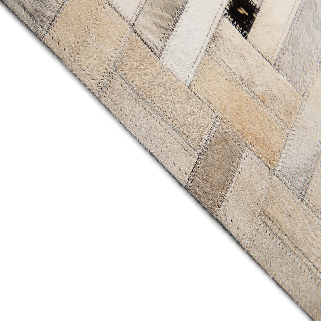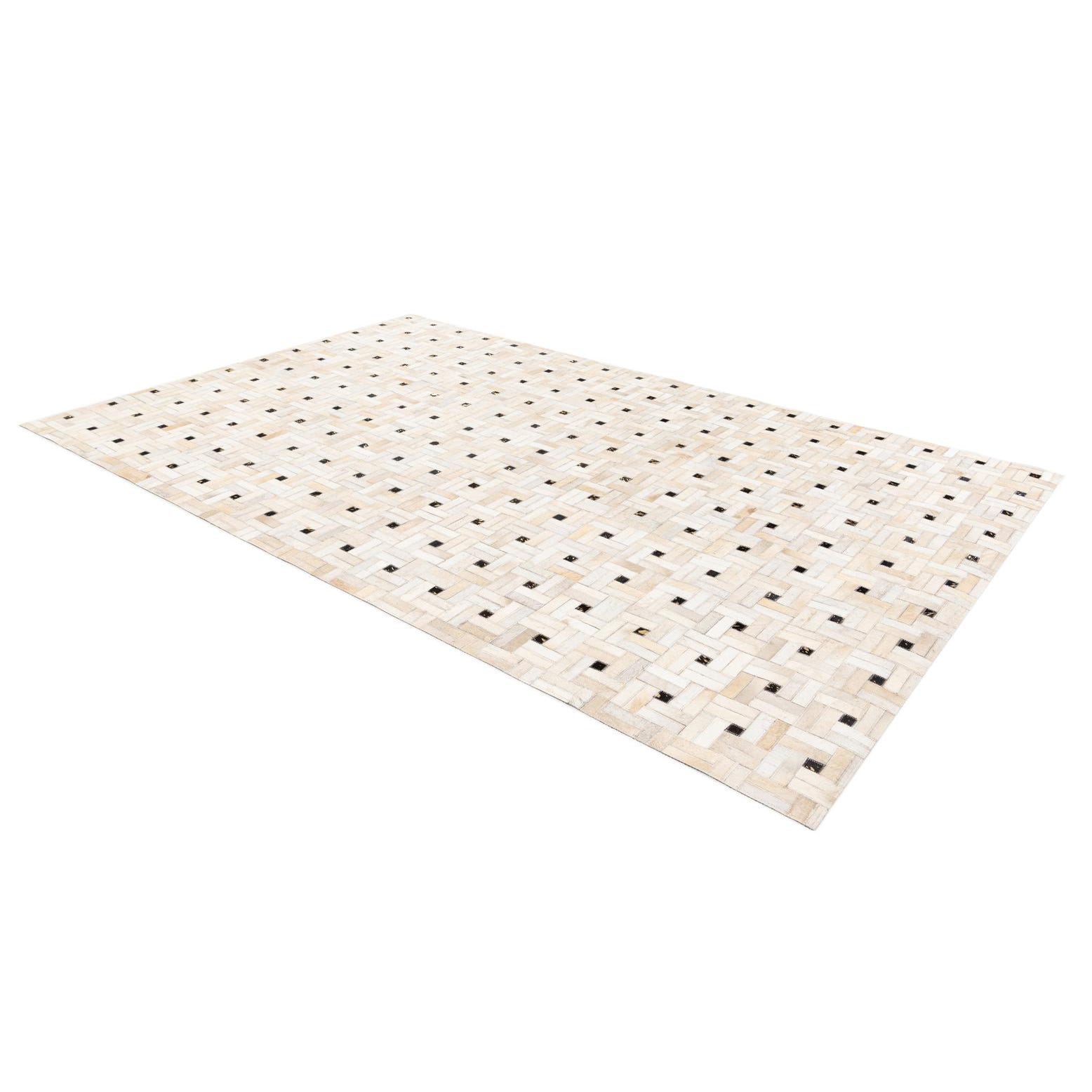 A 5x8 rectangular rug featuring a modern geometric pattern of cream, beige, and light brown cowhide squares interwoven with small dark brown squares.