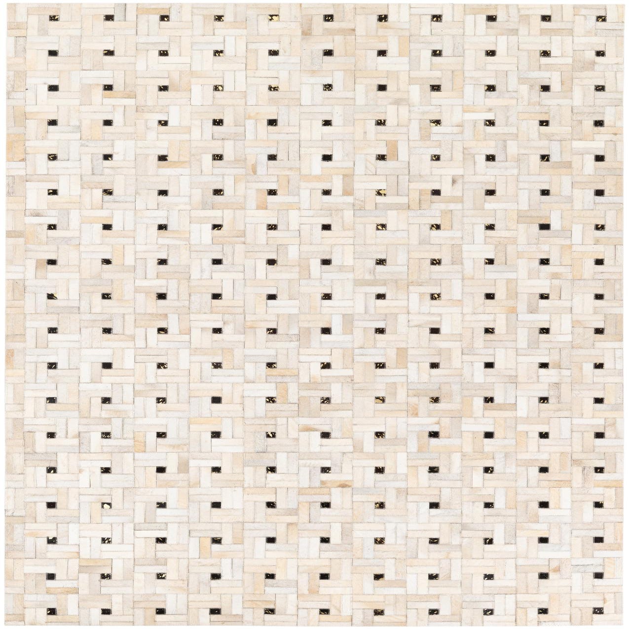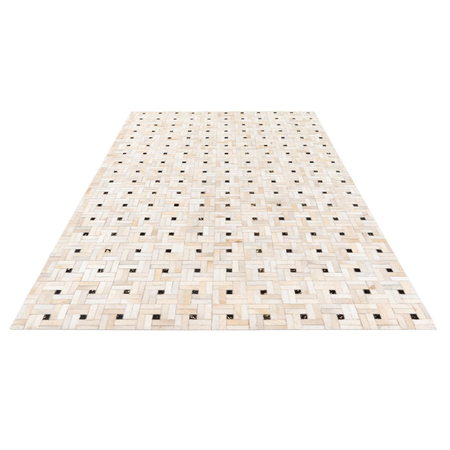 Handmade of cowhide and leather, this rug presents a refined basketweave pattern built from narrow hide strips that form repeating L-shaped motifs with small dark square insets accented by flecks of gold. The background is multi, with a soft palette of beige, ivory, tan and gray warmed by subtle gold highlights. The surface offers a low, natural nap and a gentle leather sheen, with visible seams and varied hide tones that create tactile depth and a handcrafted character underfoot.