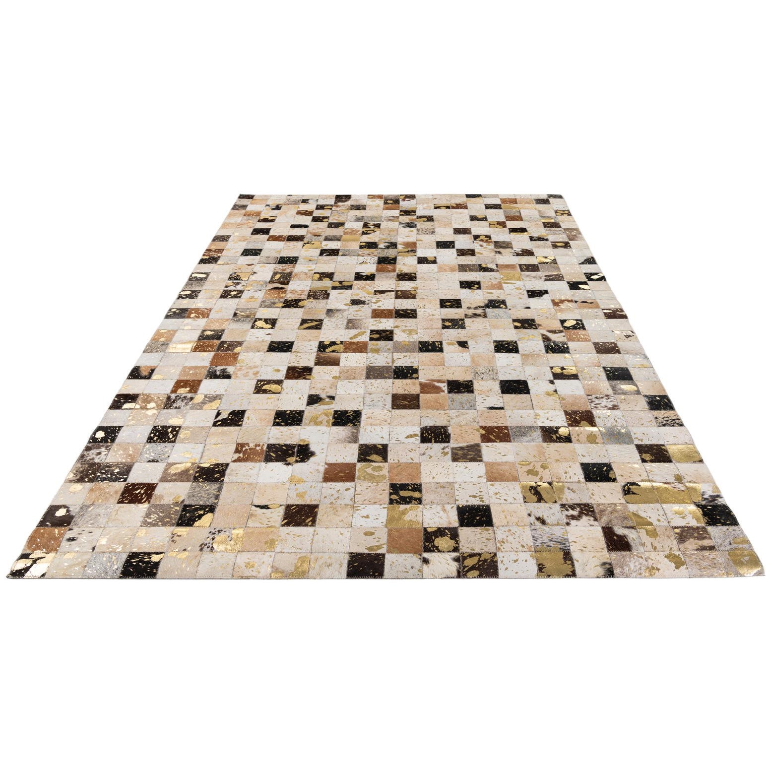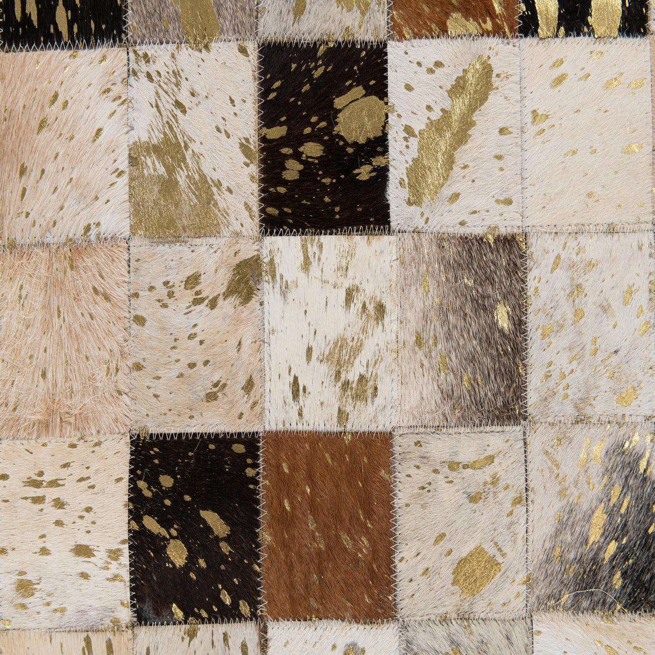 A 5x8 rectangular Cowhide Stocks rug featuring a modern patchwork of multi-colored cowhide squares with gold accents.