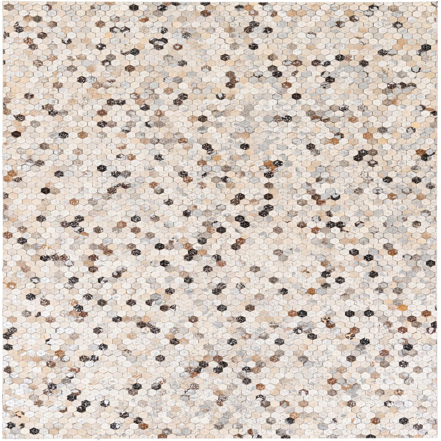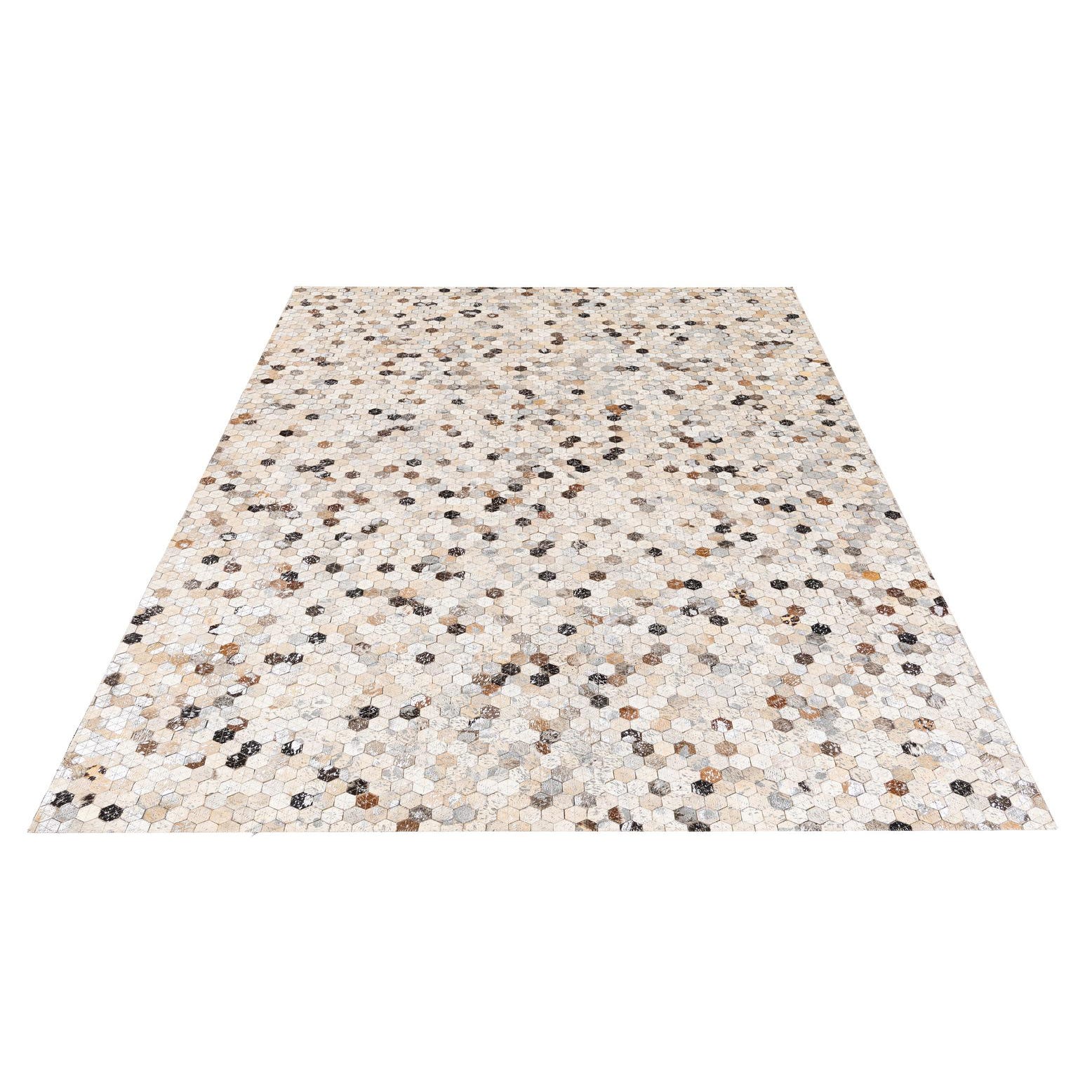 A 5x8 rectangular Cowhide Stocks rug featuring a modern, multi-colored hexagonal patchwork pattern in neutral tones.