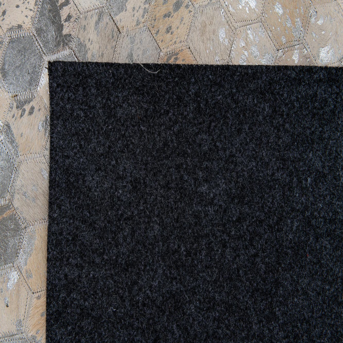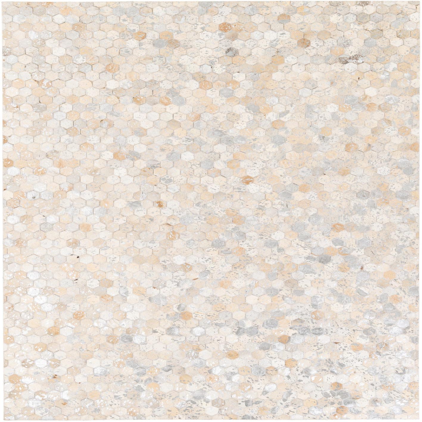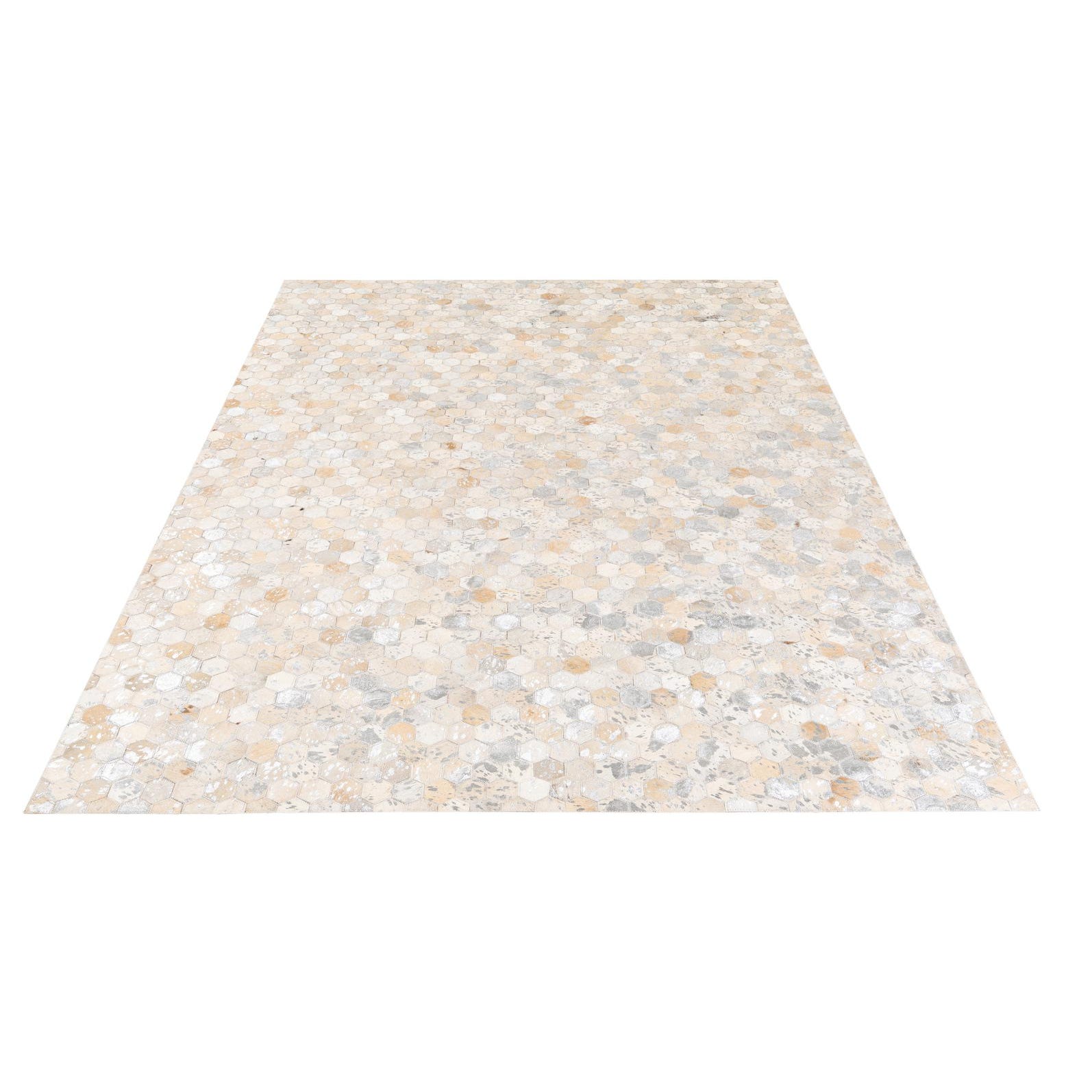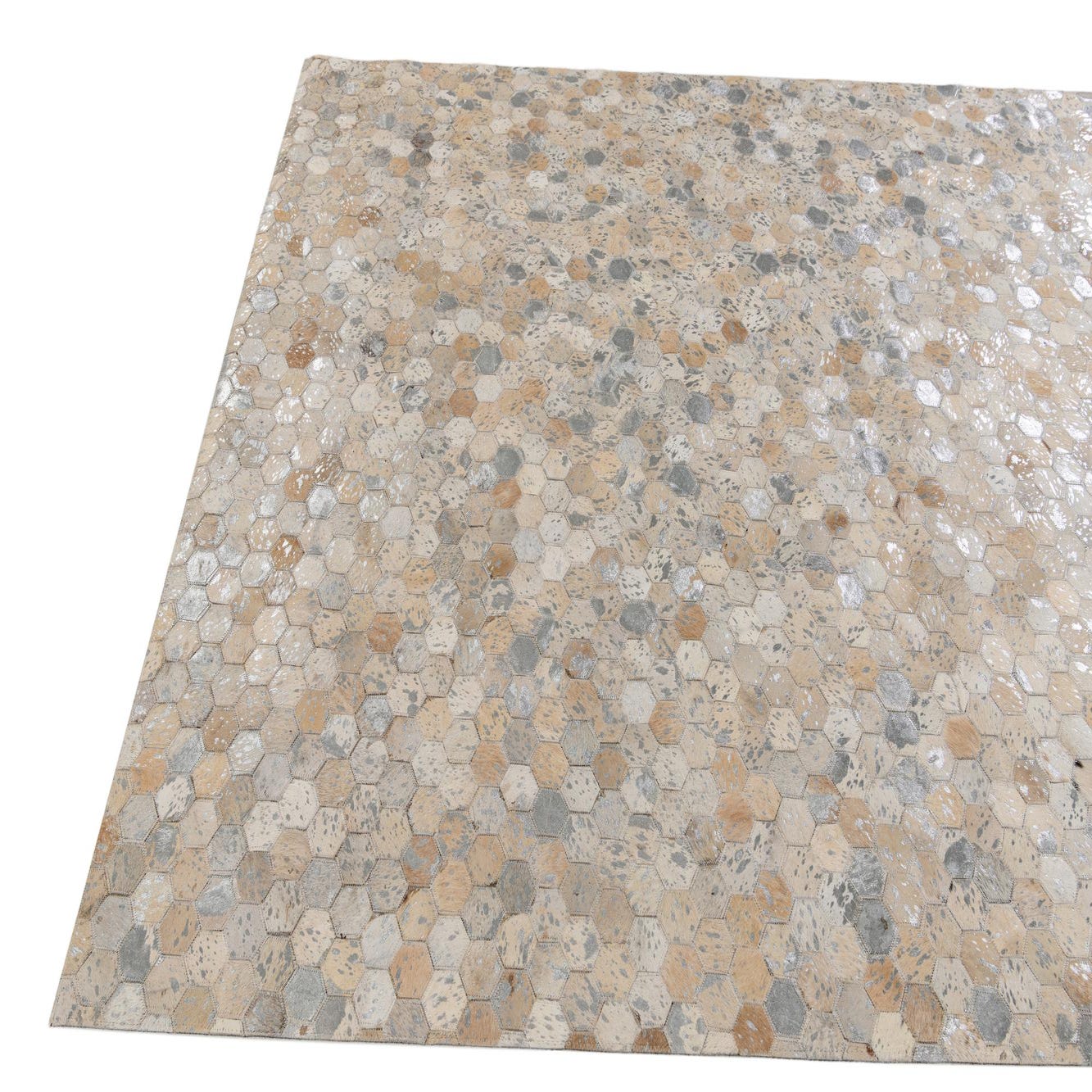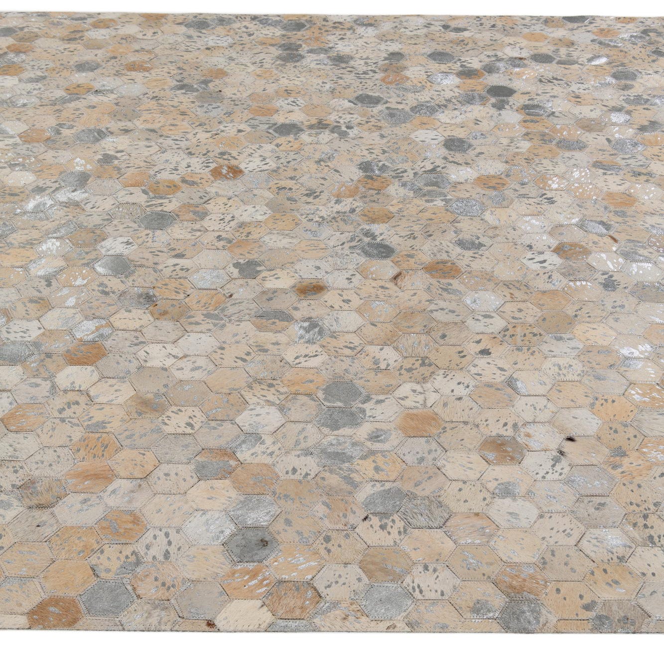 A 5x8 rectangular Cowhide Stocks rug featuring a modern honeycomb pattern in multi-colored tones of beige, cream, and grey.