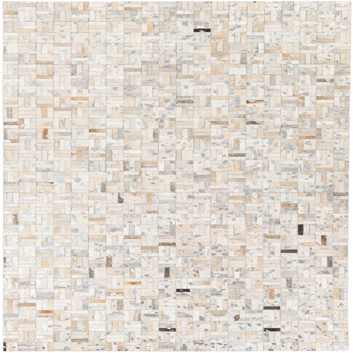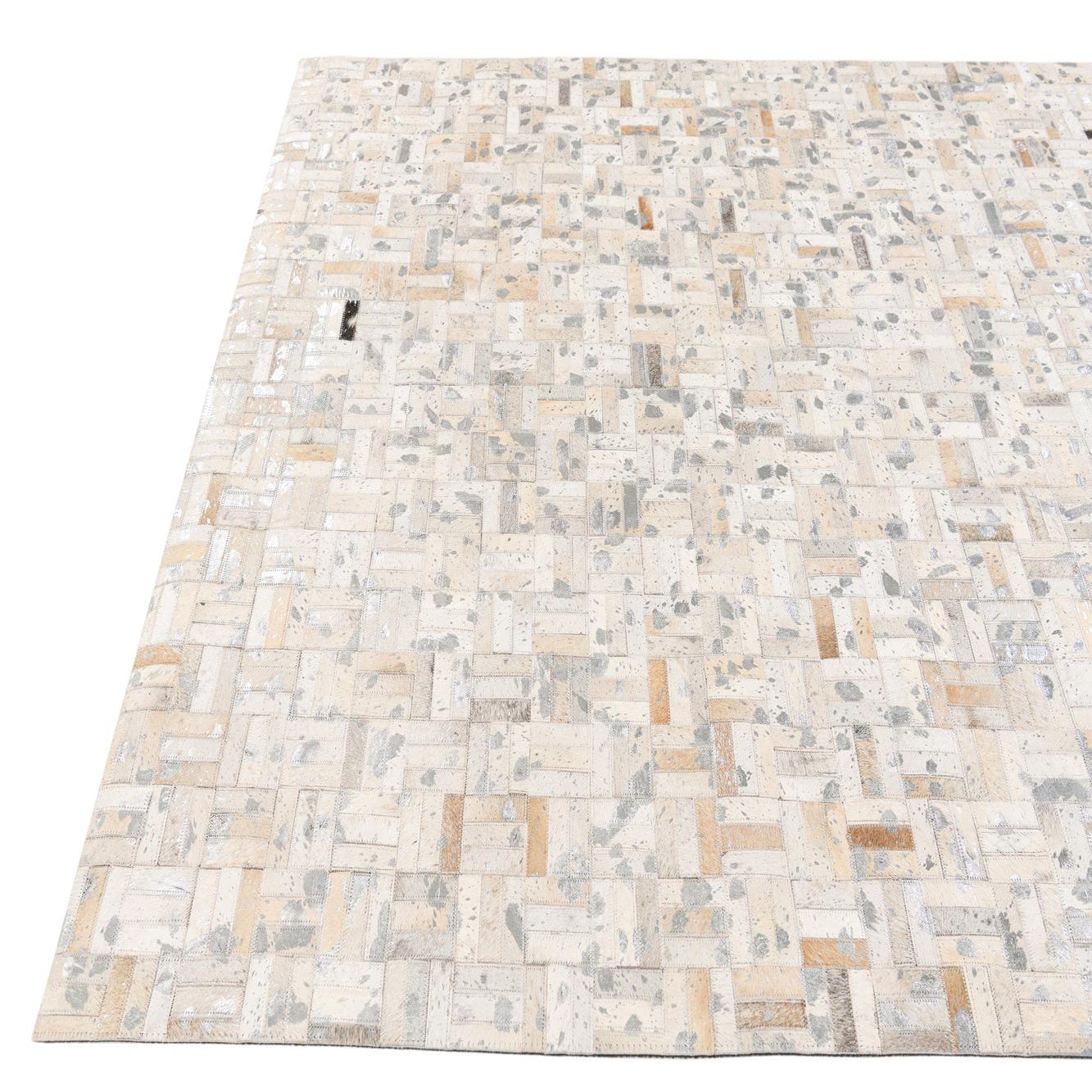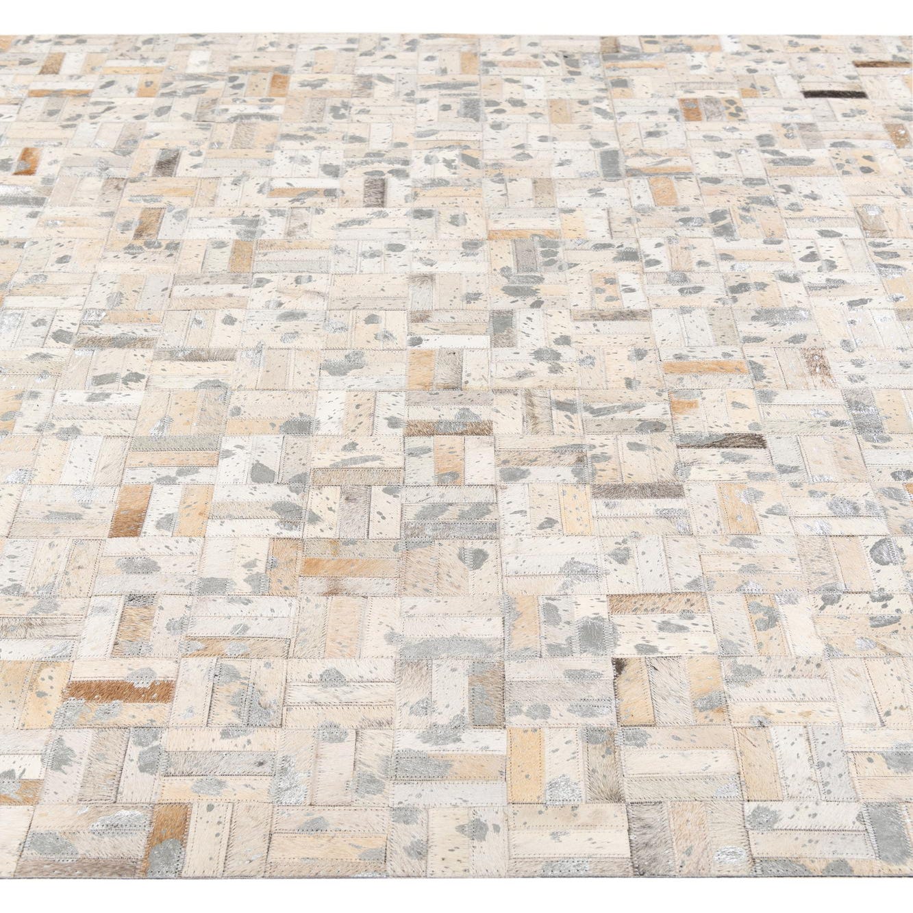 A rectangular 5x8 modern cowhide rug featuring a multi-colored patchwork design with varying shades of beige, brown, and grey.