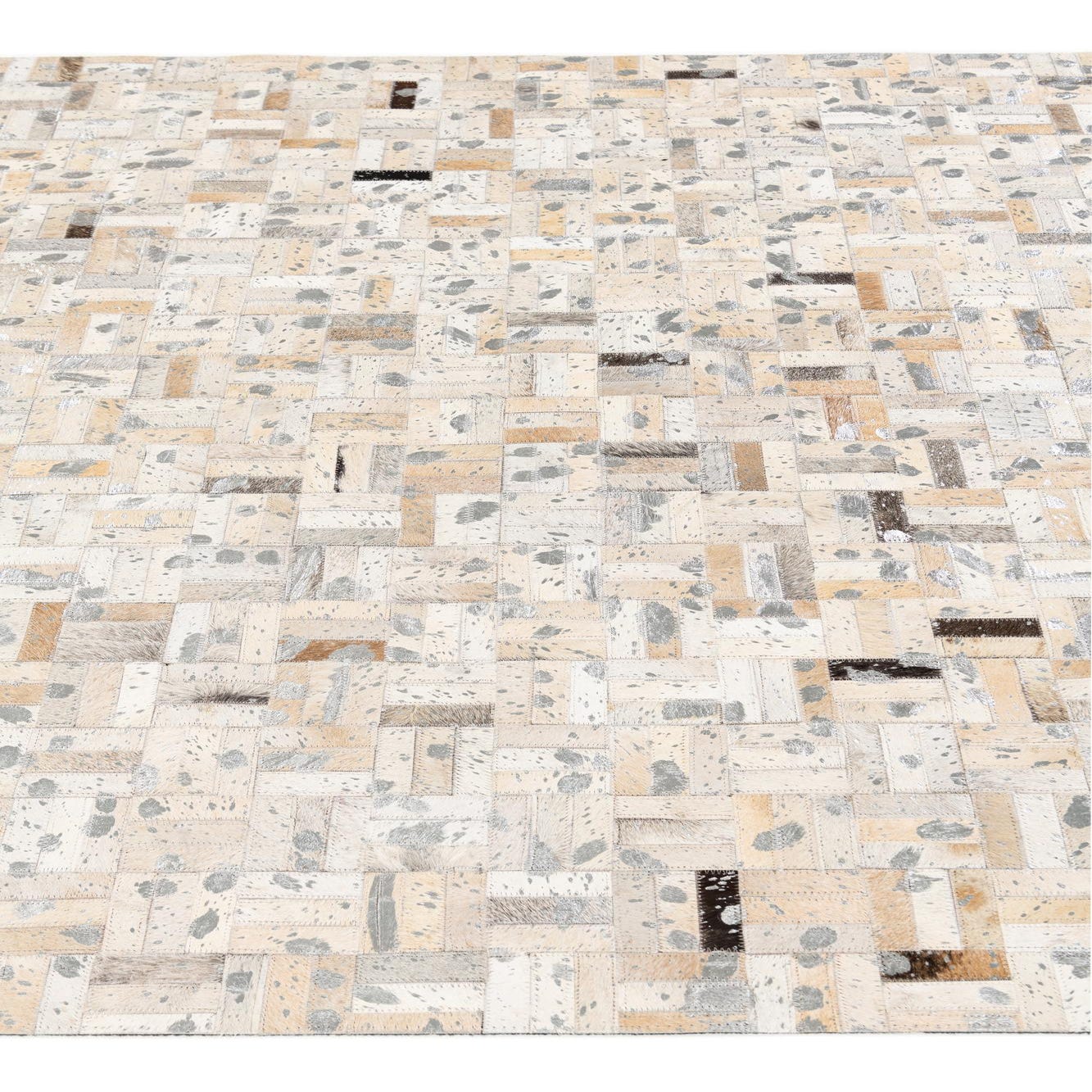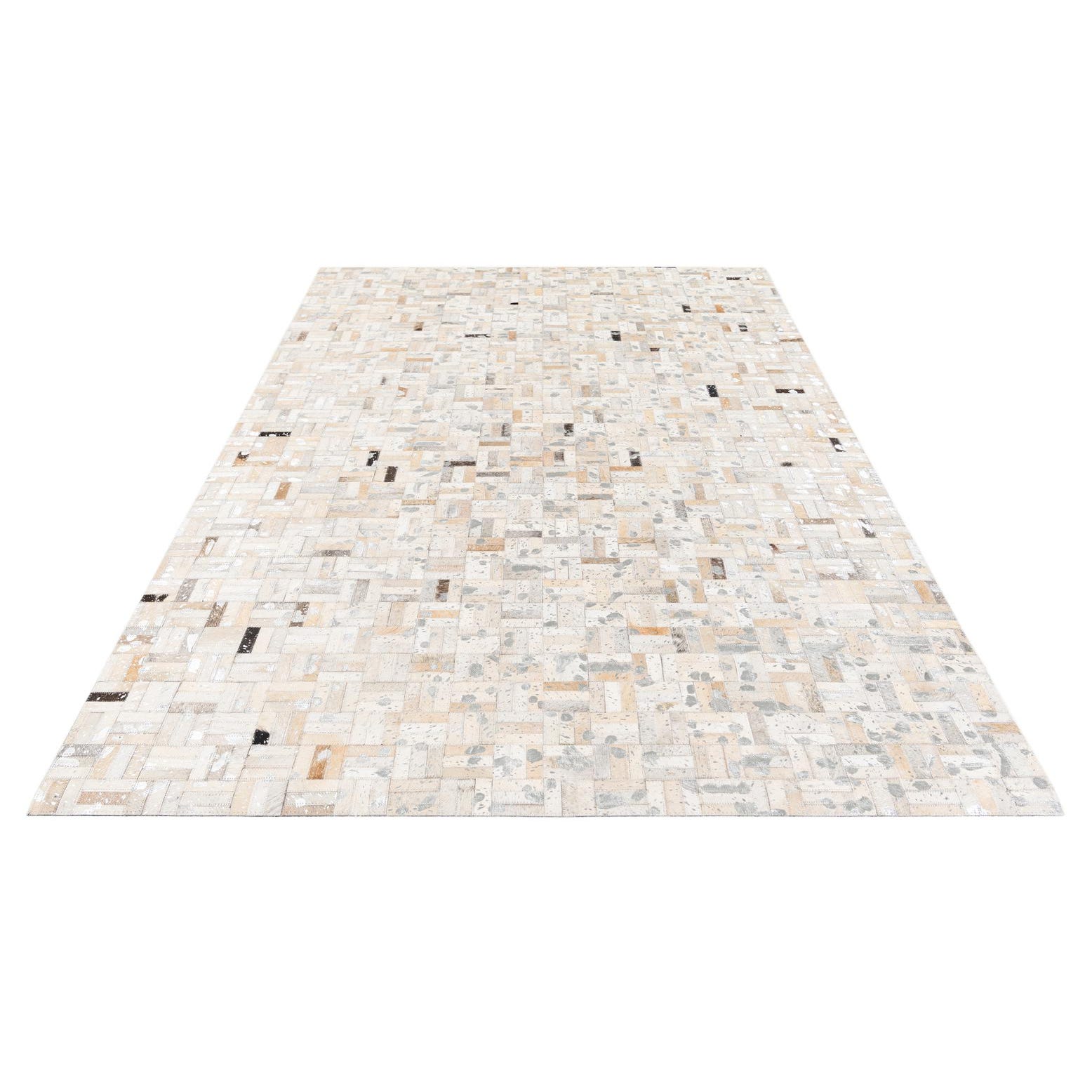 A 5x8 rectangular Cowhide Stocks rug featuring a modern patchwork of multi-colored cowhide and leather squares.