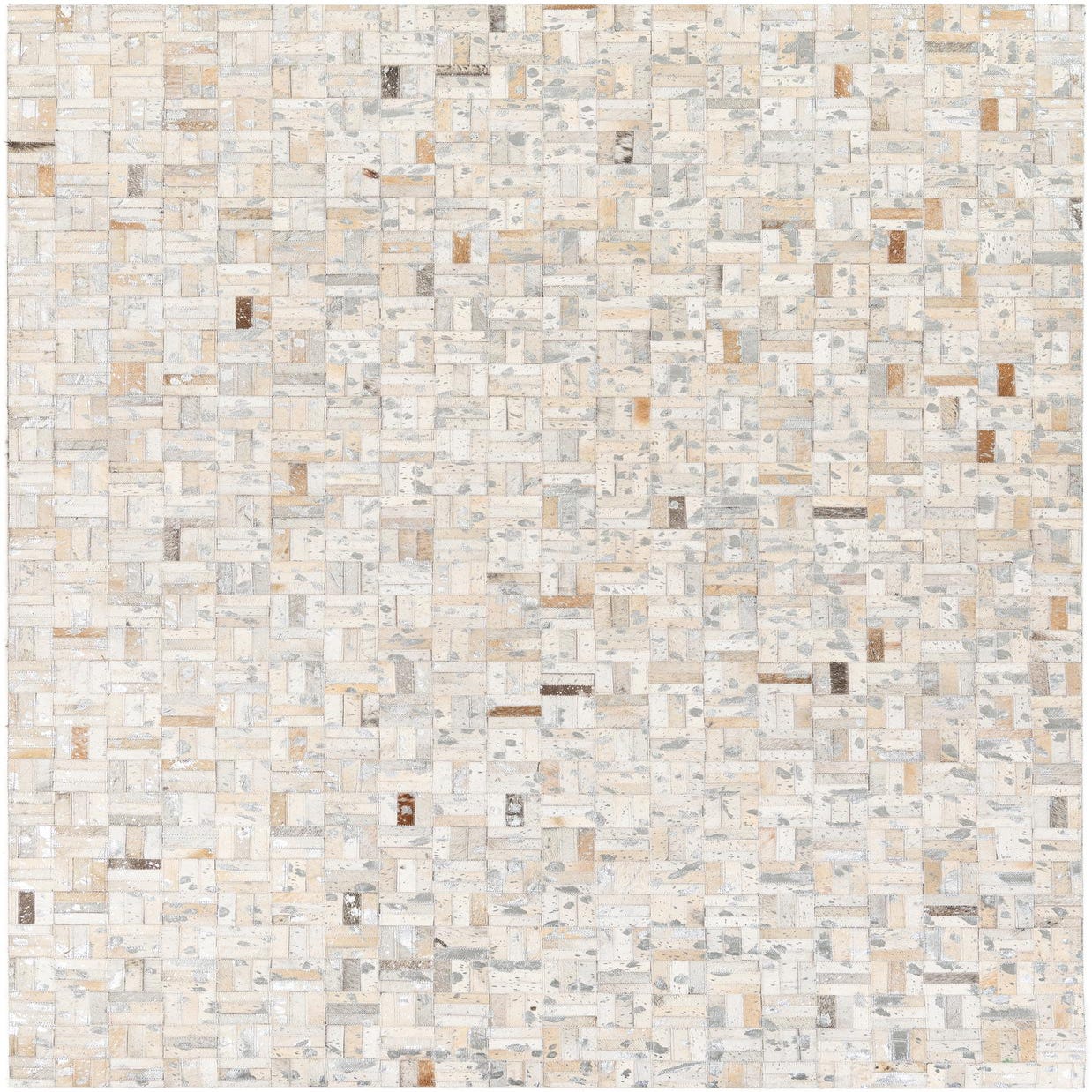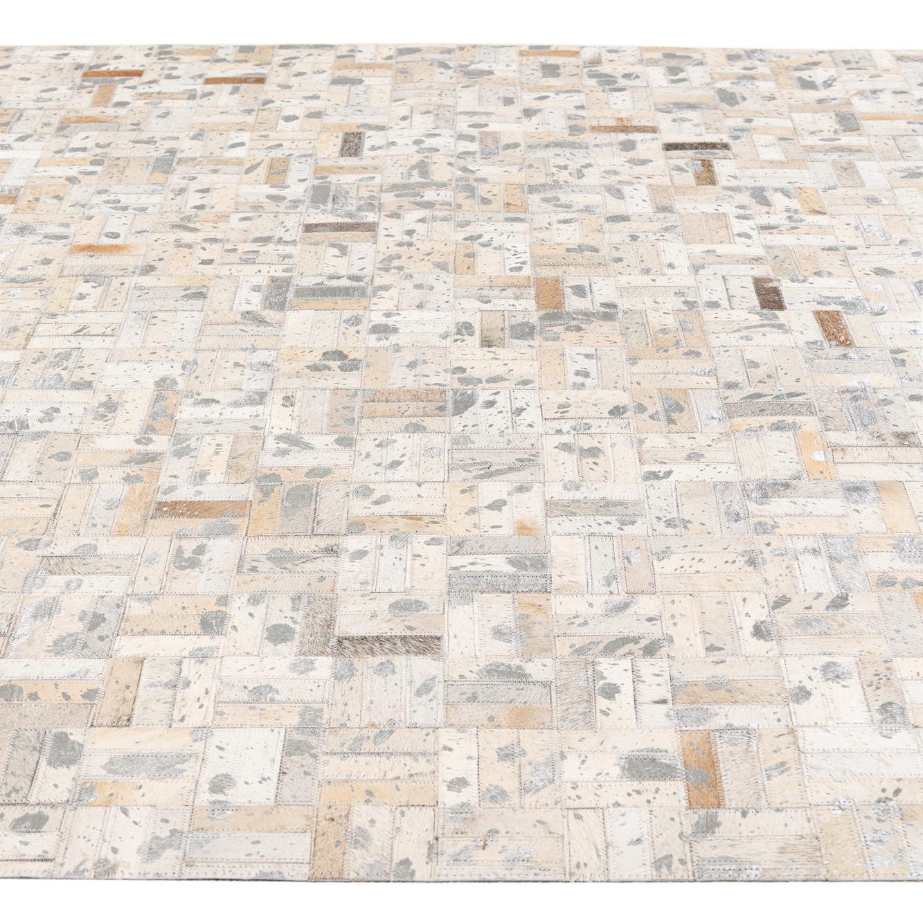 A rectangular 5x8 modern cowhide rug featuring a multi-colored patchwork design with varying shades of cream, beige, brown, and gray.