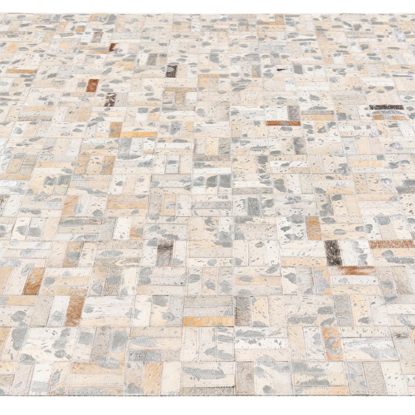 A rectangular 5x8 modern cowhide rug featuring a multi-colored patchwork design in various natural tones.