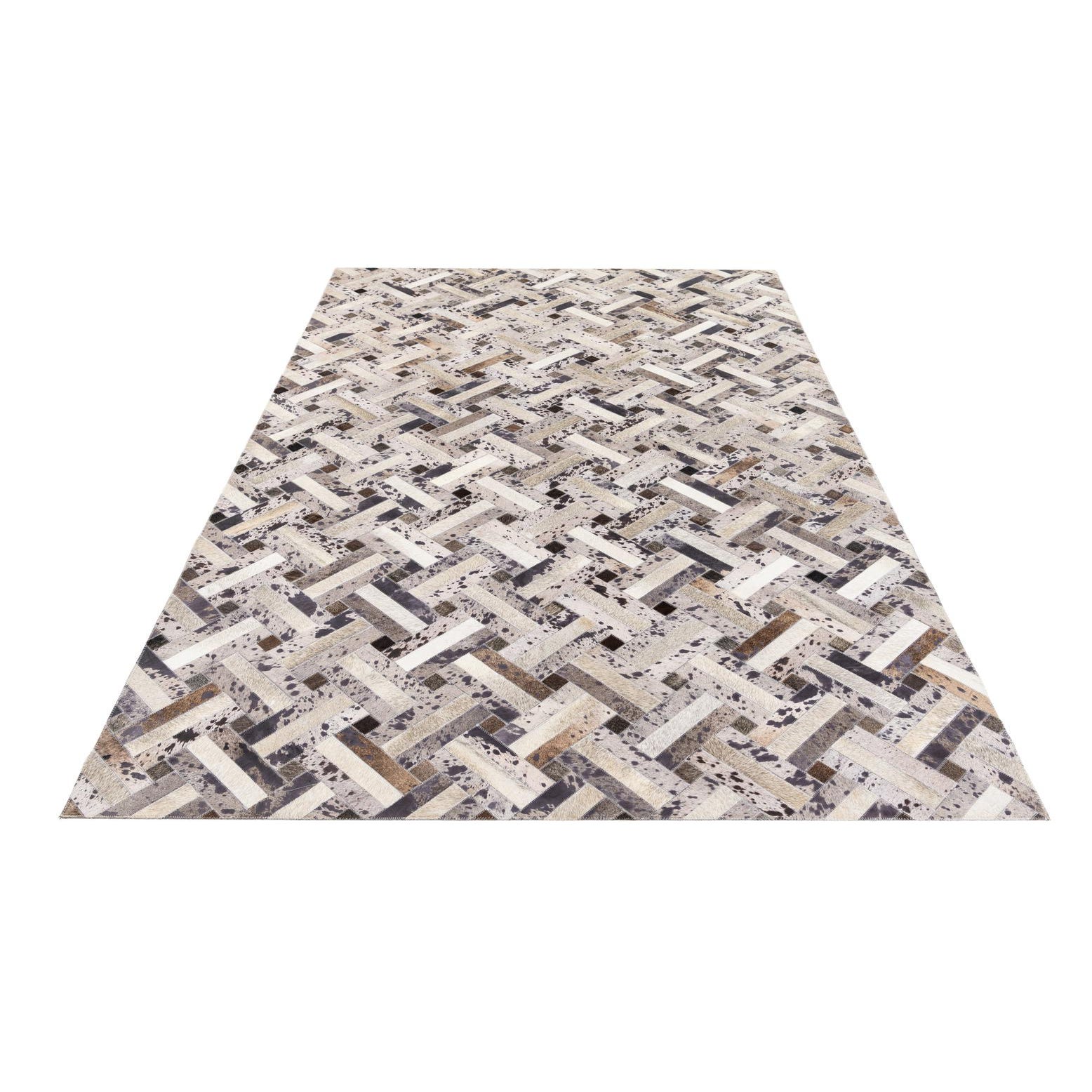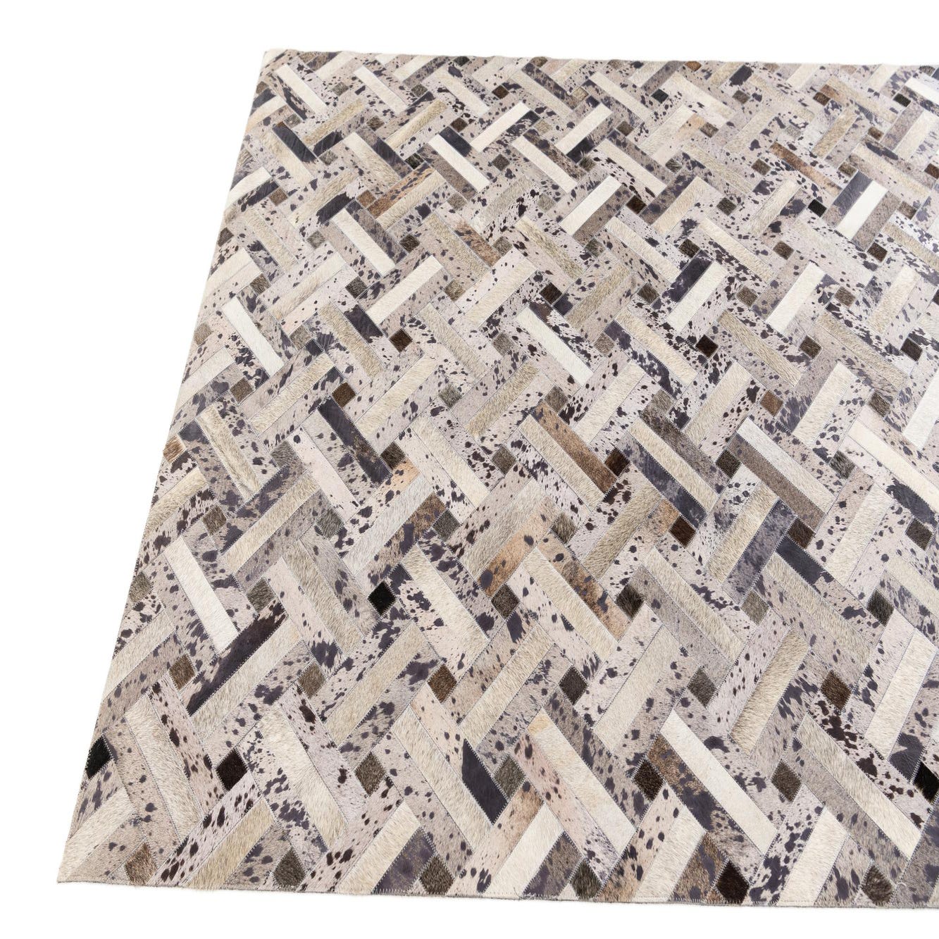 A rectangular 5x8 multi-colored cowhide rug with a modern herringbone pattern, featuring various natural hide shades and textures.