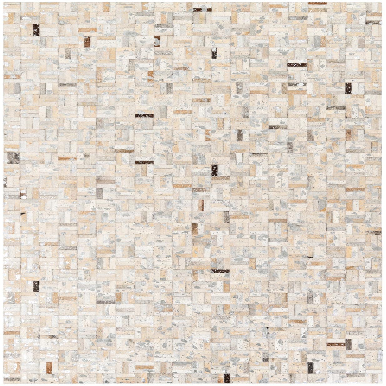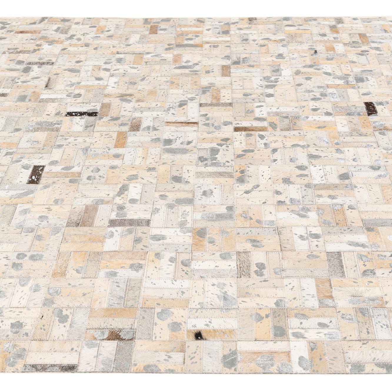 A 5x8 rectangular Cowhide Stocks rug featuring a modern patchwork of multi-colored cowhide and leather squares.