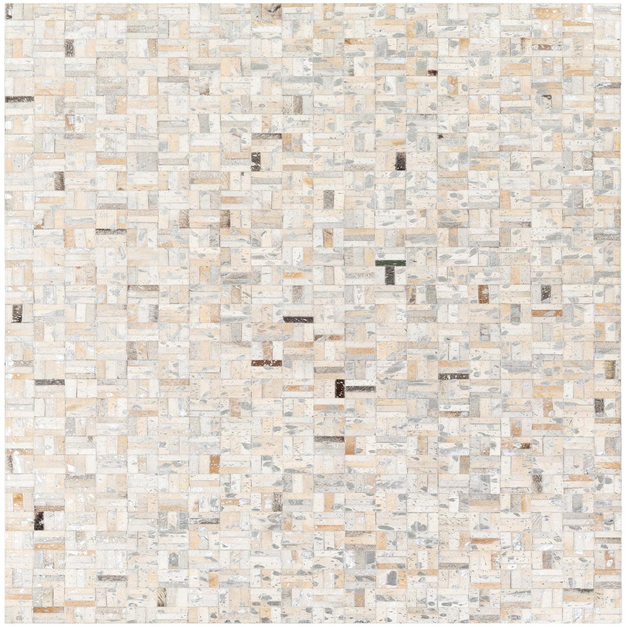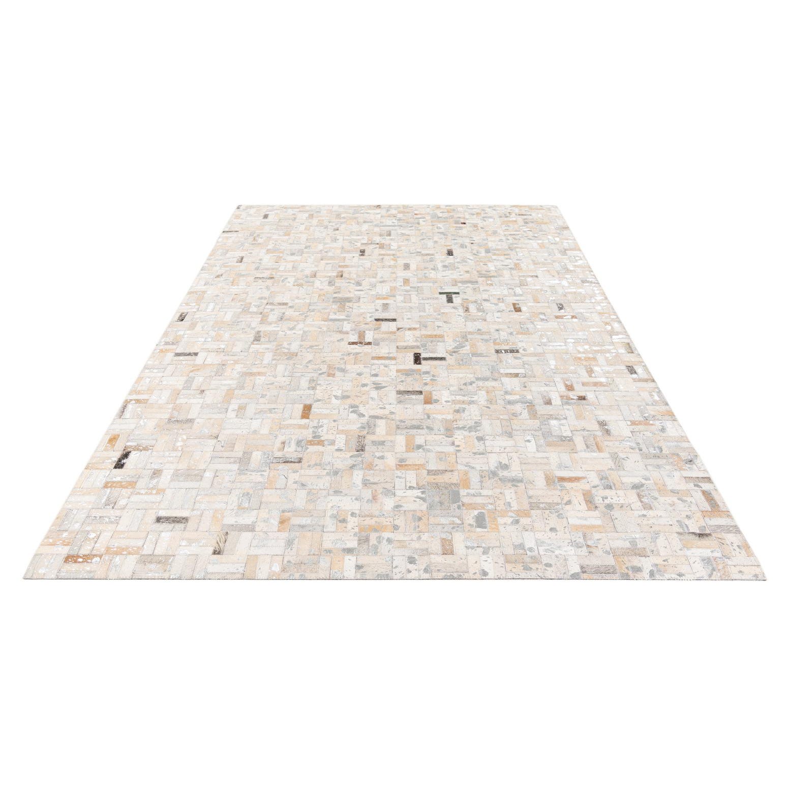 A 5x8 rectangular Cowhide Stocks rug by Rugs.com, featuring a modern patchwork pattern of multi-colored cowhide and leather in varying shades of beige, cream, grey, and brown, suitable for a living room or bedroom.