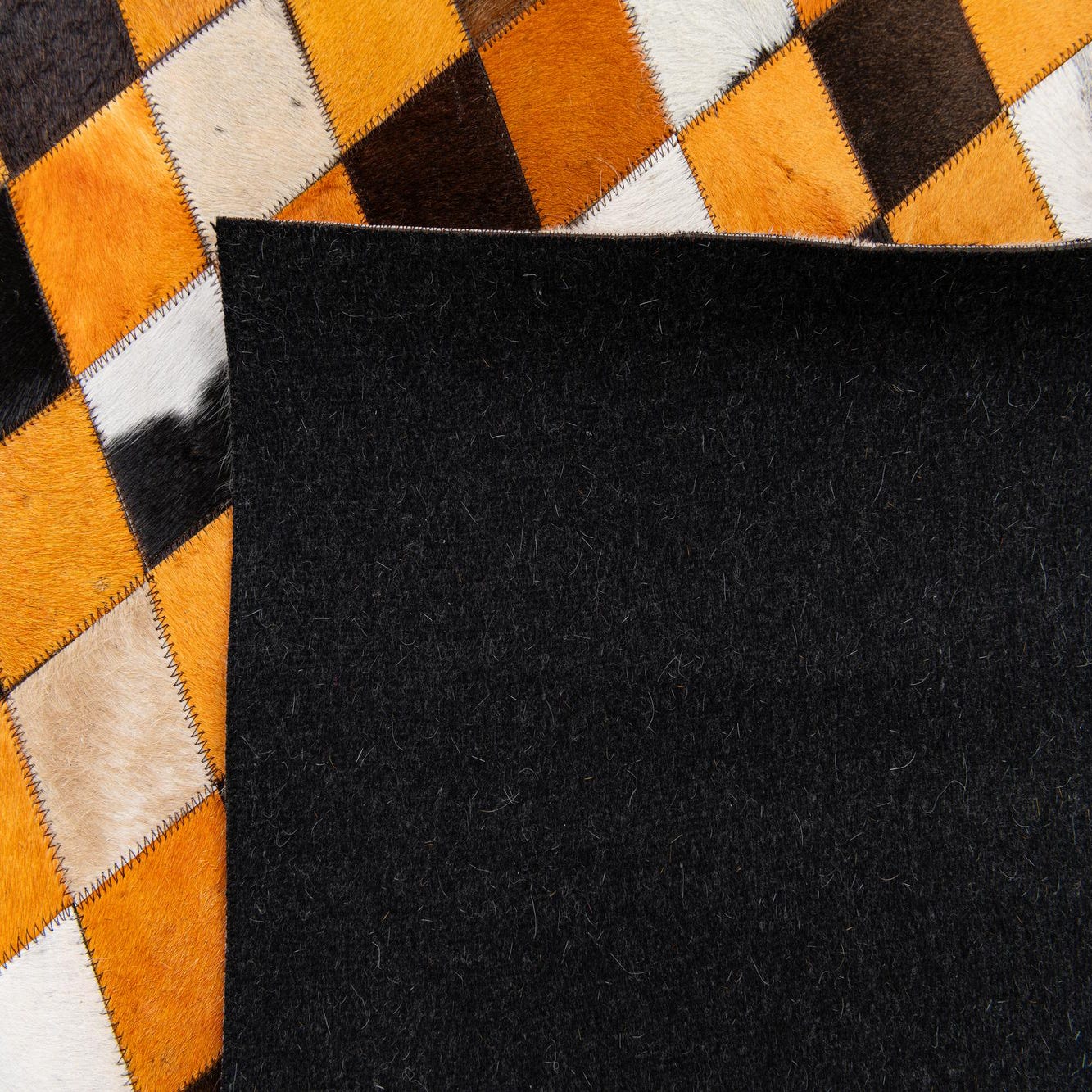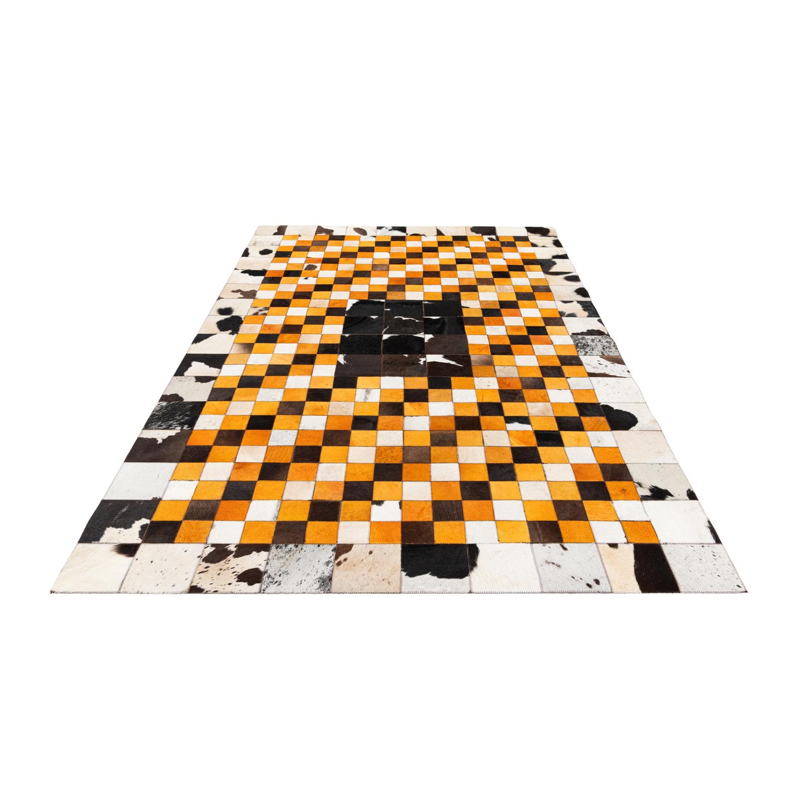 A 5x8 rectangular Cowhide Stocks rug featuring a modern multi-colored checkered pattern with a border of natural cowhide patches.