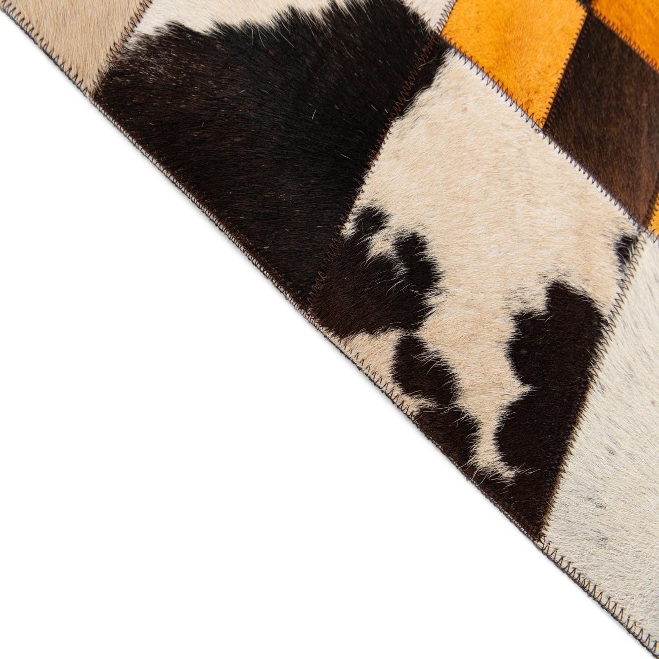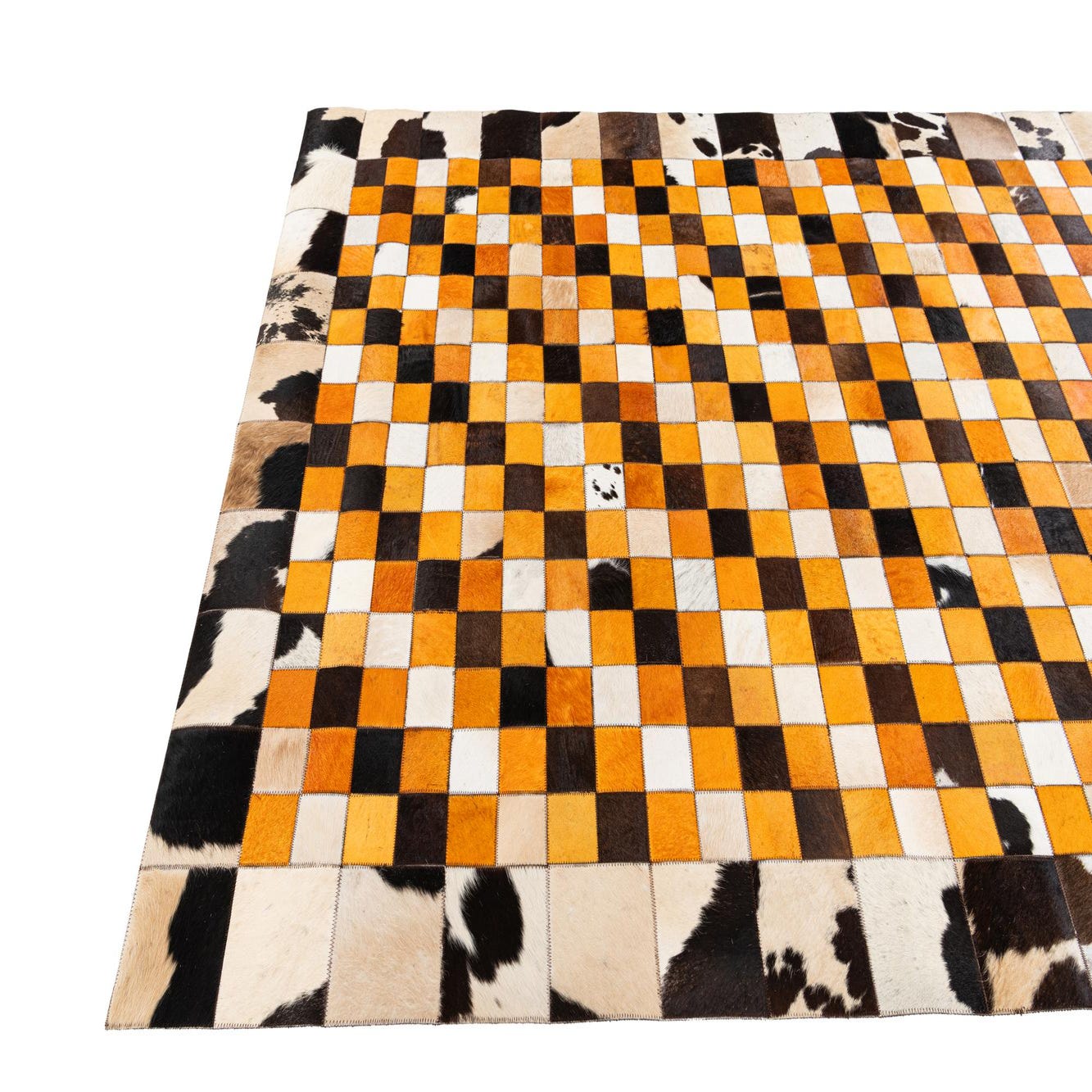 A 5x8 rectangular Cowhide rug featuring a modern checkered pattern in multi-colored patches, including orange, black, and white.